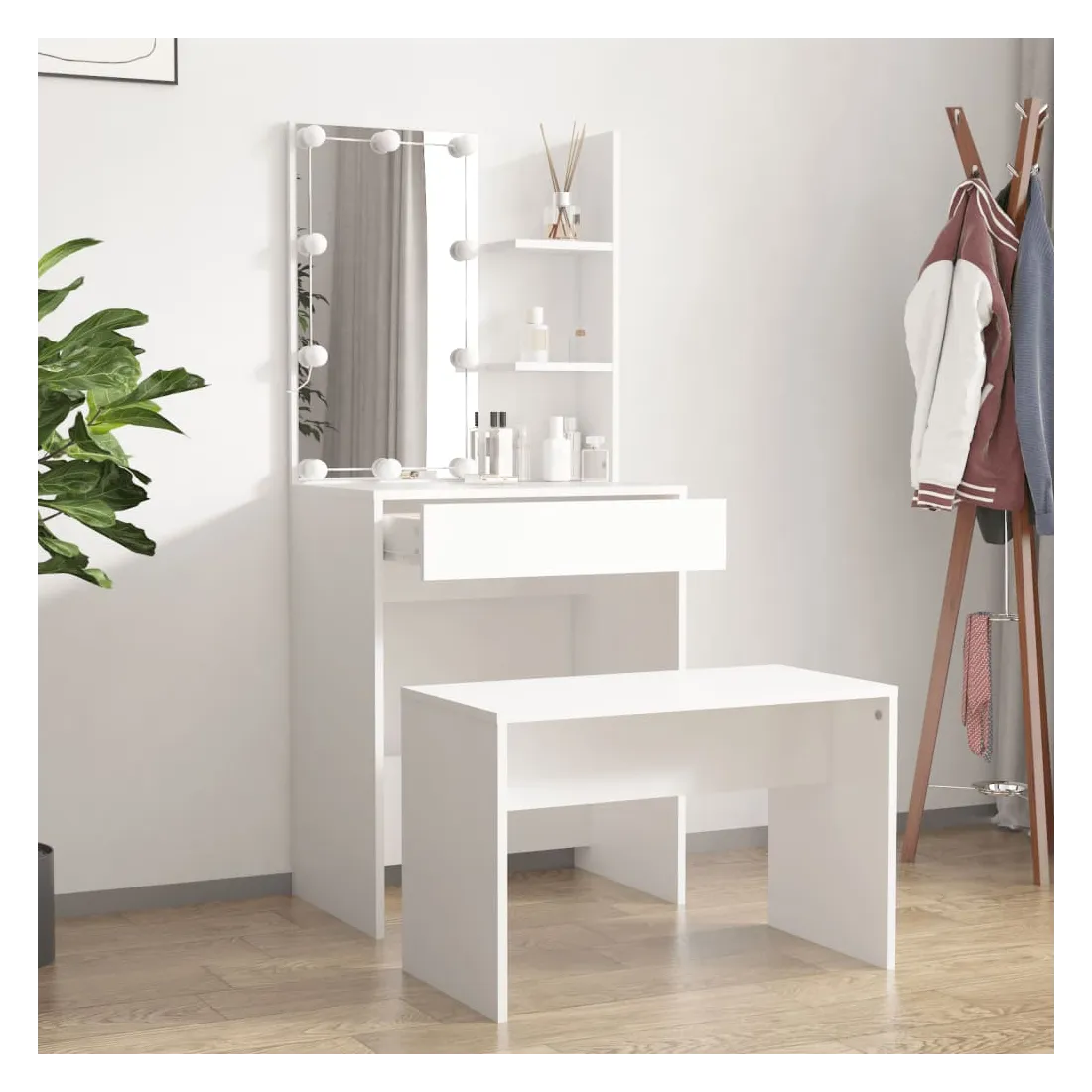 L'ensemble de coiffeuse tendance donne à votre chambre à coucher un look intemporel et raffiné. L'ensemble de coiffeuse avec LED est un supplément parfait au décor de votre chambre à coucher et garde vos cosmétiques à portée de main ! Matériau stable : le bois d'ingénierie est d'une qualité exceptionnelle avec une surface lisse et présente également résistance, stabilité et résistance à l'humidité.Miroir utilitaire : la coiffeuse avec miroir est parfaite pour votre routine beauté quotidienne. Le miroir vous permet de prendre soin de la peau de votre visage et de vous maquiller aussi !Grand espace de rangement : la coiffeuse avec tabouret offre suffisamment d'espace pour un accès facile à votre maquillage, vos bijoux et vos essentiels du quotidien.Lumière LED : la coiffeuse dispose également d'ampoules LED avec USB, qui sont faciles à changer de mode du blanc chaud au blanc froid. Les ampoules LED autour du miroir illuminent également votre beauté.Applications larges : cet ensemble de table de coiffeuse convient à divers endroits, telles que votre chambre à coucher, vestiaire et toute autre pièce dans laquelle vous souhaitez le placer. Avertissement :Afin d'éviter qu'il ne bascule, ce produit doit être utilisé avec le dispositif de fixation murale fourni. Remarque :Chaque produit est livré avec un manuel de montage dans la boîte pour un montage facile.