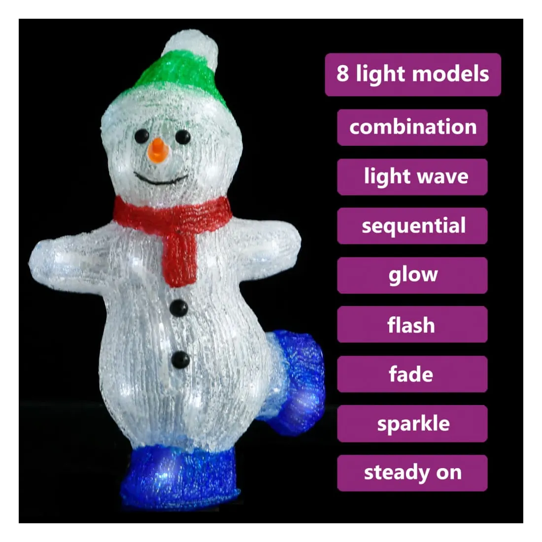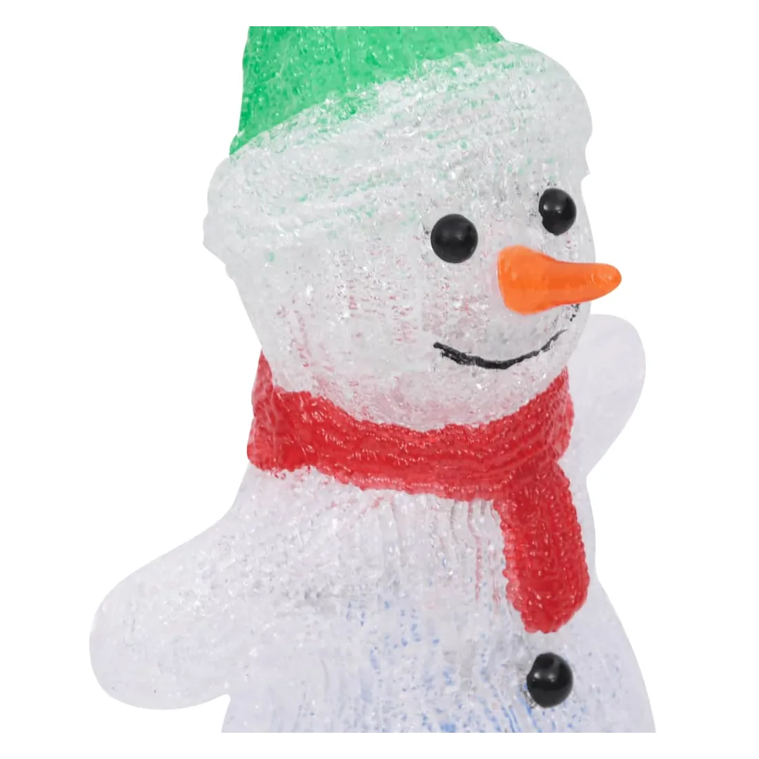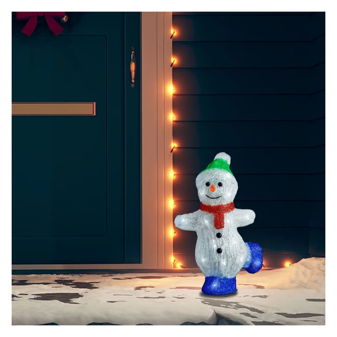 Cette figurine de bonhomme de neige attire tous les regards. Apportez-la chez vous et créez la présentation parfaite du festival cette année ! Ce bonhomme de neige est fabriqué en acrylique résistant. De plus, cette décoration de Noël est dotée de 30 lumières LED, qui sont efficaces sur le plan énergétique et durables. Conçue avec 8 effets lumineux différents : une combinaison de tous les effets, l'éclairage lent, le scintillement/clignotement, la vague, la séquence/le ruissellement de l'eau, le séquentiel, l'allumage permanent et l'atténuation lente, elle s'illumine magnifiquement et crée une ambiance de vacances magique. Grâce au boîtier de batterie étanche, le bonhomme de neige peut également être utilisé à l’extérieur.