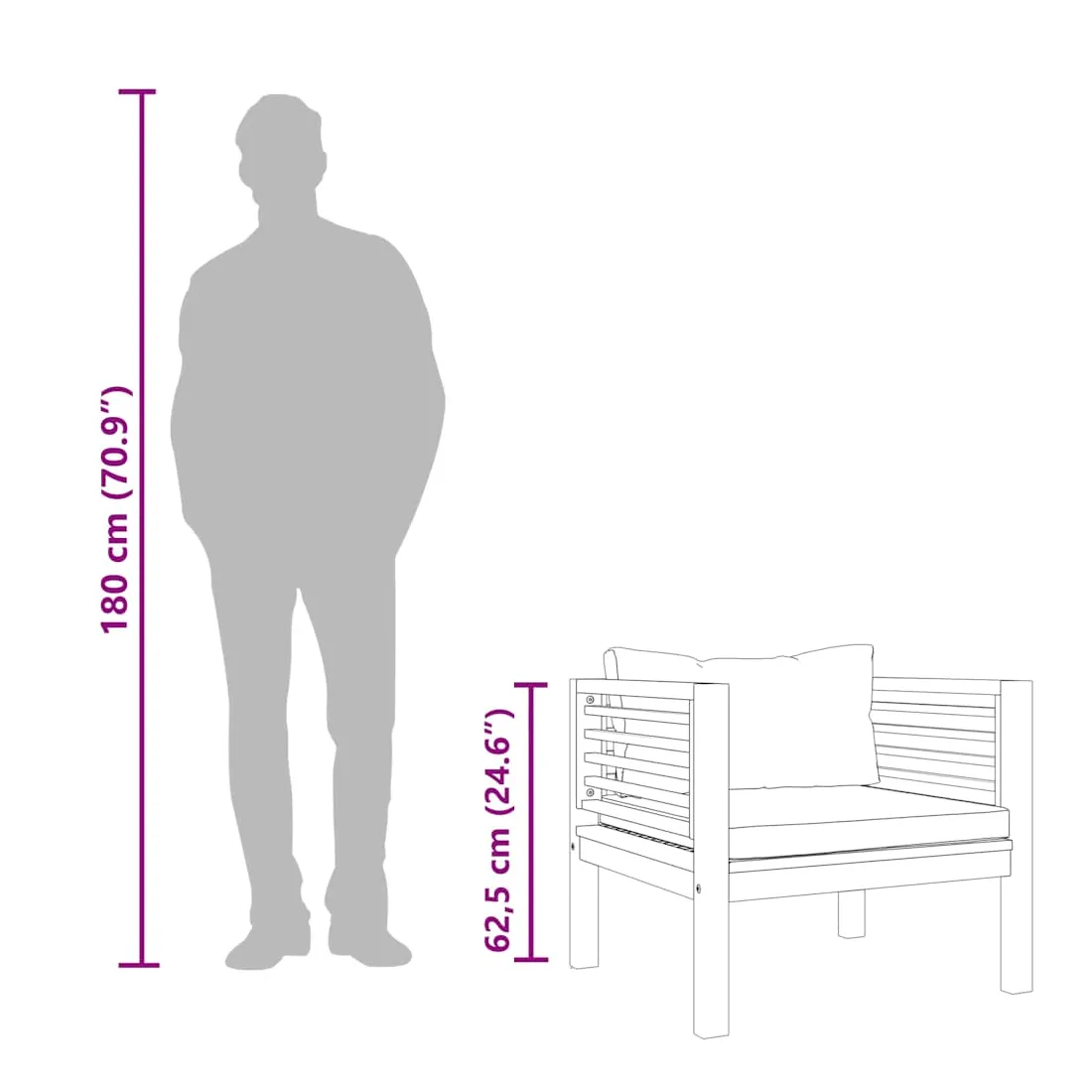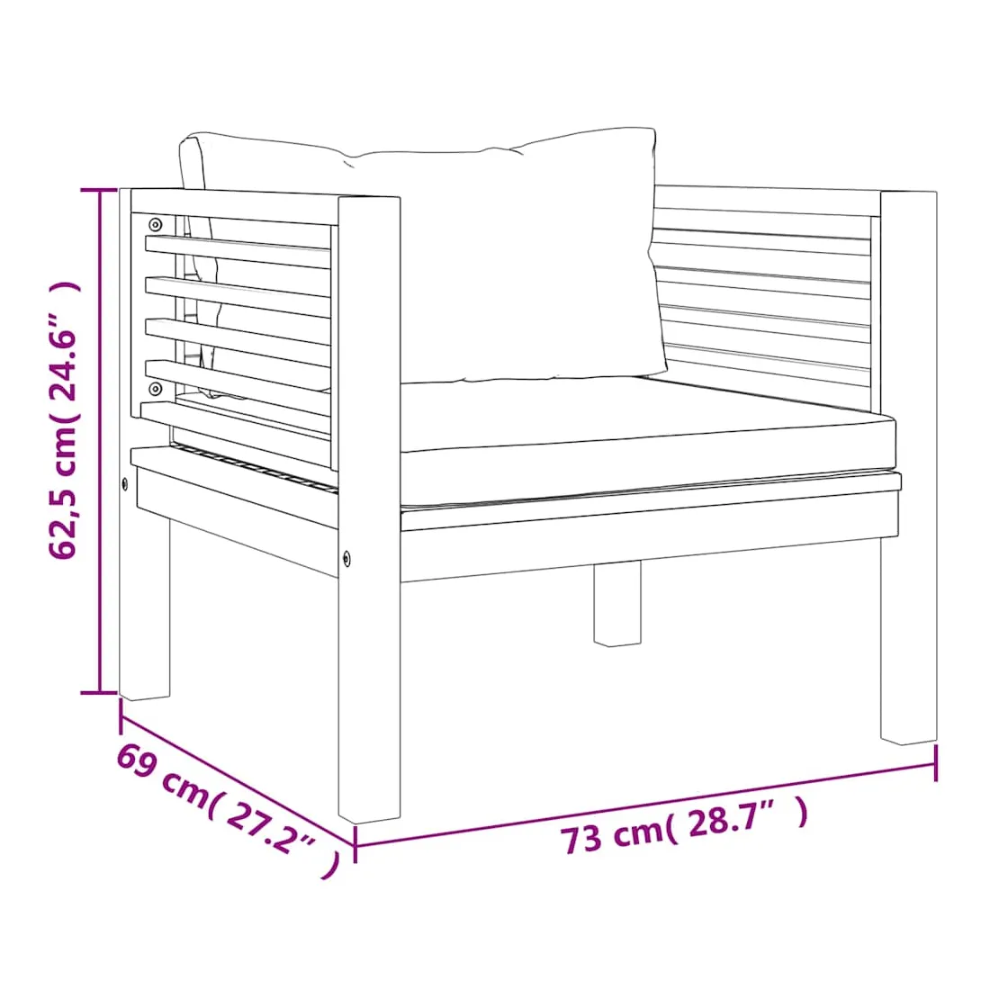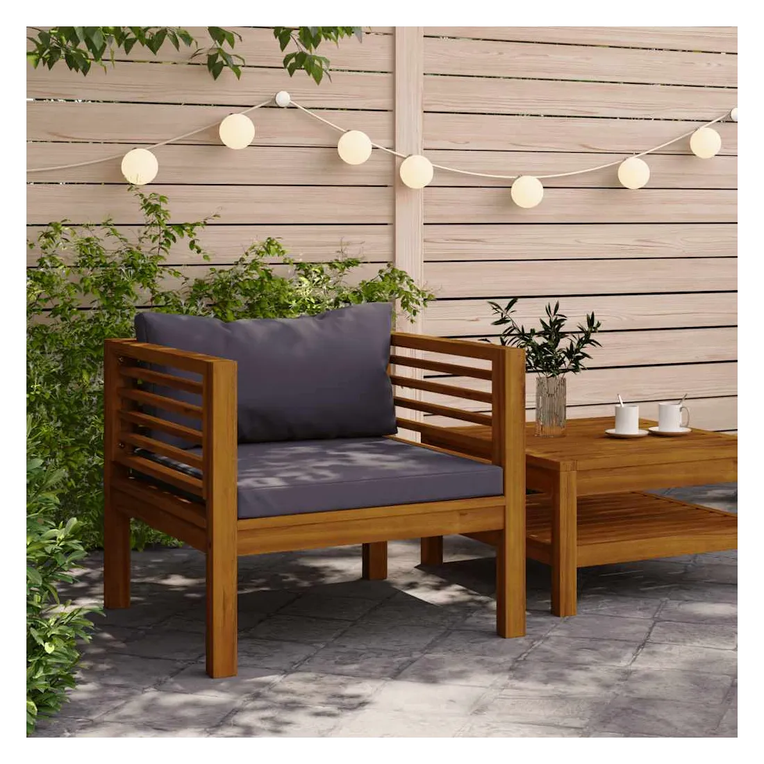 Élevez votre espace extérieur avec cette chaise de jardin. Elle est adaptée pour patio, terrasse, balcon ou tout autre espace extérieur ! Fabriquée en bois d’acacia massif, puis finie avec de l’huile, cette chaise de jardin a un cadre robuste et est durable, facile à entretenir et résistante aux intempéries. La chaise est livrée avec un coussin de siège et un coussin de dossier pour plus de confort et de soutien pendant votre temps de détente. Remarque : Afin de prolonger la durée de vie de vos meubles d'extérieur, nous vous recommandons de les nettoyer régulièrement et de ne pas les laisser à l'extérieur sans protection inutilement.Nettoyage : Utiliser une solution savonneuse douce.Stockage : Si possible, stockez dans un endroit frais et sec à l'intérieur. Si le produit est stocké à l'extérieur, protégez-le avec une housse imperméable. Essuyez et séchez l'excès d'eau ou de neige des surfaces planes après la pluie ou une chute de neige. Permettez une circulation d'air suffisante afin d'éviter les dommages liés à l'humidité.