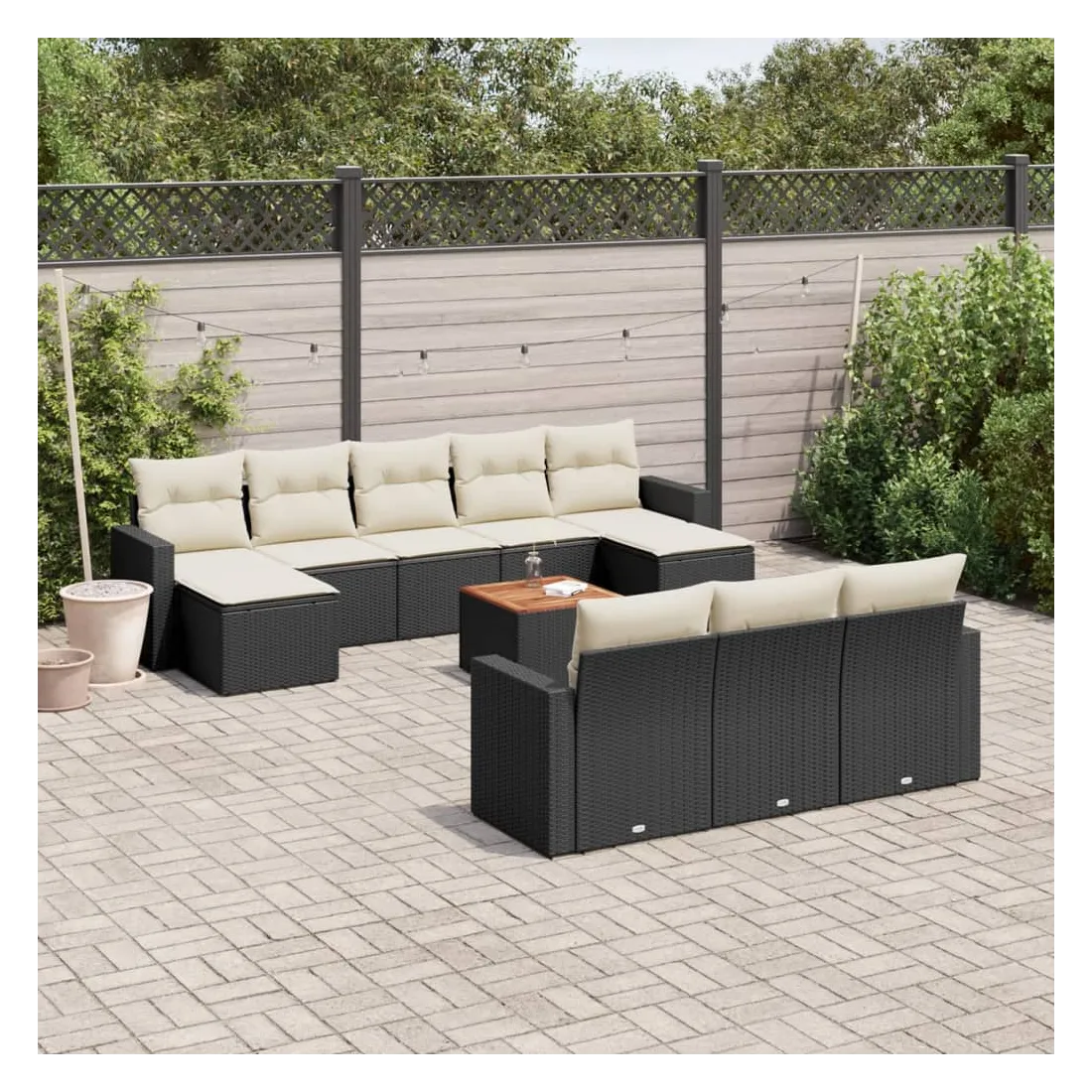 Cet ensemble de canapés de jardin est le complément parfait de votre arrière-cour, terrasse ou patio, offrant un espace confortable et accueillant pour discuter avec la famille et les amis ou simplement se détendre et profiter de l'extérieur. Matériau durable : la résine tressée, également connue sous le nom de poly rotin, est un matériau synthétique solide et nécessitant peu d'entretien qui ressemble au rotin naturel. Il est léger, facile à nettoyer et couramment utilisé pour les meubles d'extérieur en raison de sa durabilité et de ses propriétés de résistance aux intempéries.Dessus stable et facile à nettoyer : cette table de jardin a un dessus en bois d'acacia robuste, durable et facile à nettoyer avec un chiffon humide.Expérience d'assise confortable : ce mobilier d'extérieur, doté de coussins épais, offre une expérience d'assise confortable.Housse amovible et lavable : ces coussins de siège sont dotés de housses amovibles pour un lavage et un entretien faciles.Conception modulaire : cet ensemble de meubles d'extérieur a une conception modulaire, ce qui le rend complètement flexible et facile à déplacer, afin que vous puissiez créer un agencement de meubles d'extérieur personnalisé. Bon à savoir :Pour que vos meubles d'extérieur restent beaux, nous vous recommandons de les protéger avec une housse imperméable.