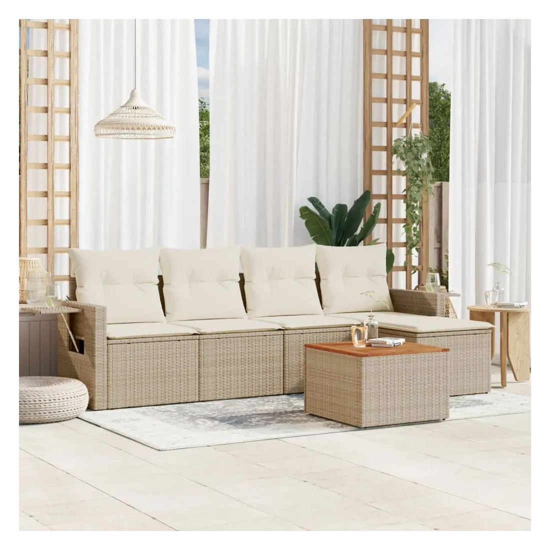 Cet ensemble de canapés de jardin est le complément parfait de votre arrière-cour, terrasse ou patio, offrant un espace confortable et accueillant pour discuter avec la famille et les amis ou simplement se détendre et profiter de l'extérieur. Matériau durable : la résine tressée, également connue sous le nom de poly rotin, est un matériau synthétique solide et nécessitant peu d'entretien qui ressemble au rotin naturel. Il est léger, facile à nettoyer et couramment utilisé pour les meubles d'extérieur en raison de sa durabilité et de ses propriétés de résistance aux intempéries.Table d'appoint pratique : ce mobilier d'extérieur comprend une table d'appoint pliable avec un ressort à gaz sur les accoudoirs, offrant un endroit pratique pour garder vos essentiels à portée de main.Dessus stable et facile à nettoyer : cette table de jardin a un dessus en bois d'acacia robuste, durable et facile à nettoyer avec un chiffon humide.Housse amovible et lavable : ces coussins de siège sont dotés de housses amovibles pour un lavage et un entretien faciles.Conception modulaire : cet ensemble de meubles d'extérieur a une conception modulaire, ce qui le rend complètement flexible et facile à déplacer, afin que vous puissiez créer un agencement de meubles d'extérieur personnalisé. Bon à savoir :Pour que vos meubles d'extérieur restent beaux, nous vous recommandons de les protéger avec une housse imperméable.