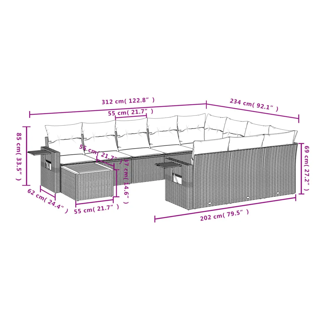 • Dimensions du coussin de dossier : 55 x 45 x 13 cm (L x l x é)
