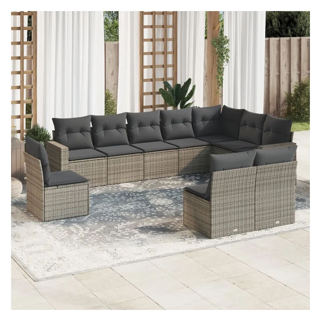 Cet ensemble de canapés de jardin est le complément parfait de votre arrière-cour, terrasse ou patio, offrant un espace confortable et accueillant pour discuter avec la famille et les amis ou simplement se détendre et profiter de l'extérieur. Matériau durable : la résine tressée, également connue sous le nom de poly rotin, est un matériau synthétique solide et nécessitant peu d'entretien qui ressemble au rotin naturel. Il est léger, facile à nettoyer et couramment utilisé pour les meubles d'extérieur en raison de sa durabilité et de ses propriétés de résistance aux intempéries.Fonction de rangement avec sac résistant à l'eau : chaque siège de jardin dispose d'un espace de rangement sous l'assise, complété par un sac résistant à l'eau pour ranger les coussins, les jouets et d'autres objets. Les sacs intérieurs sont dotés d'un couvercle et peuvent être solidement fixés aux sièges à l'aide de bandes auto-agrippantes pour plus de stabilité.Expérience d'assise confortable : ce mobilier d'extérieur, doté de coussins épais, offre une expérience d'assise confortable.Housse amovible et lavable : ces coussins de siège sont dotés de housses amovibles pour un lavage et un entretien faciles.Conception modulaire : cet ensemble de meubles d'extérieur a une conception modulaire, ce qui le rend complètement flexible et facile à déplacer, afin que vous puissiez créer un agencement de meubles d'extérieur personnalisé. Bon à savoir :Pour que vos meubles d'extérieur restent beaux, nous vous recommandons de les protéger avec une housse imperméable.