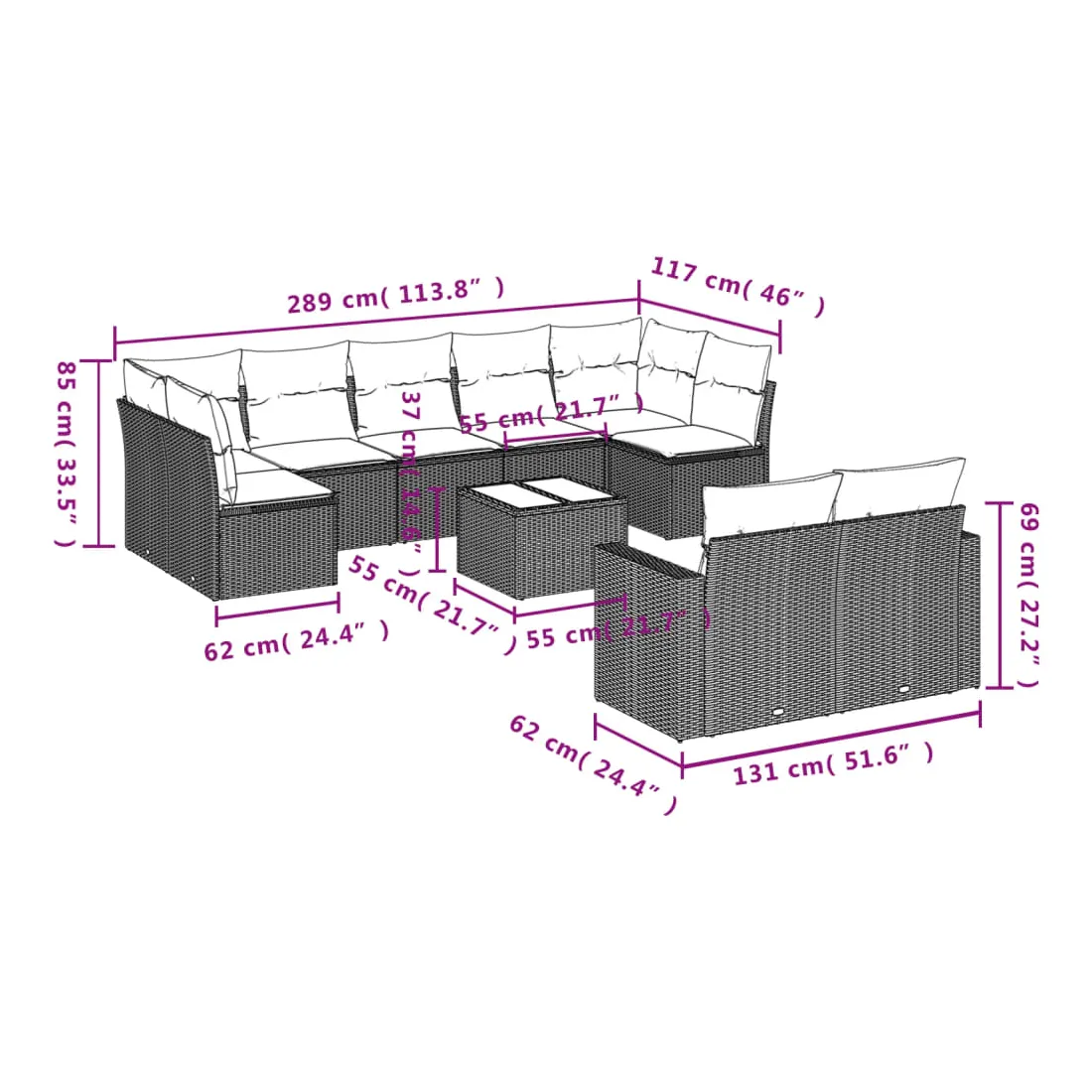 • 9 x coussin d'assise avec housse amovible et lavable