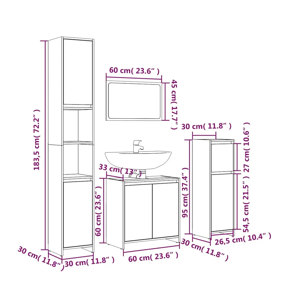 • Dimensions de l'armoire sous lavabo : 60 x 33 x 60 cm (l x P x H)