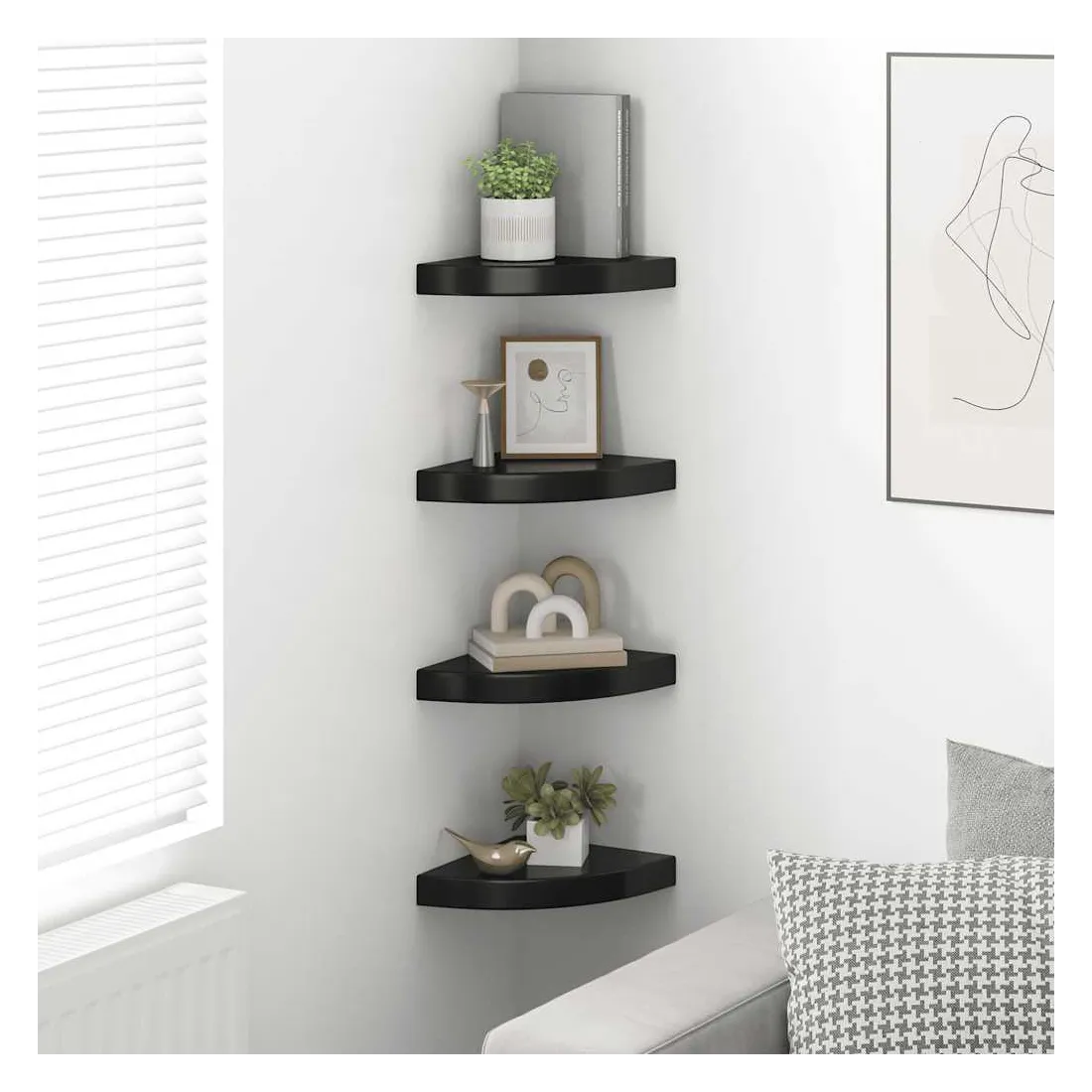 Cet ensemble de 4 étagères d'angle élégantes est idéal pour afficher vos livres préférés, décorations, photos, prix, etc. Cette étagère de présentation, fabriquée en MDF alvéolaire de qualité et en métal solide, est stable et durable. Avec un système de montage invisible, l’étagère murale est facile à installer et sert d’endroit idéal pour stocker des articles tels que des récompenses, des livres, des objets de collection, des ornements, etc. Cette étagère flottante convient à tout décor et transforme un mur vide en une fonctionnalité de design !