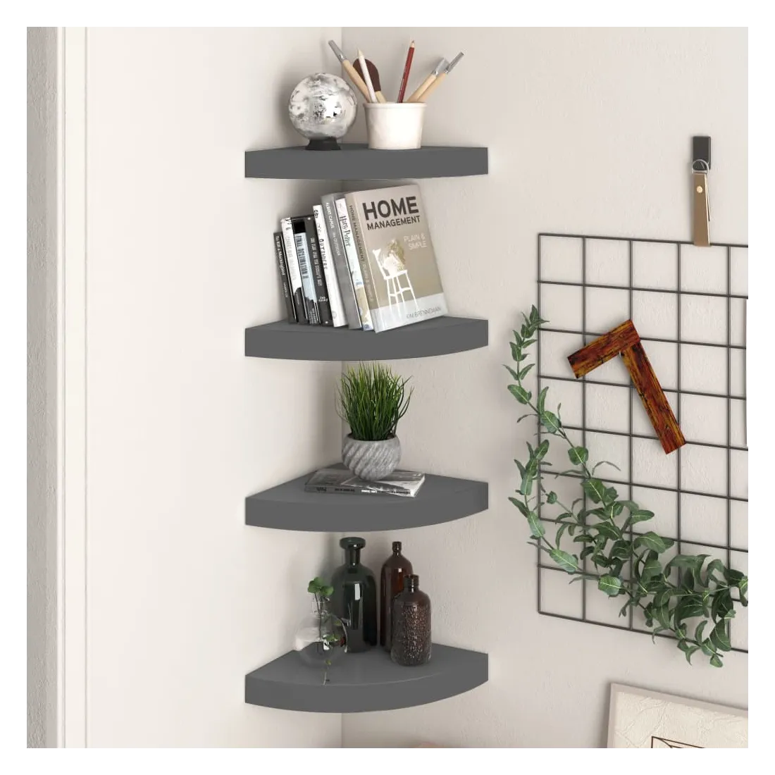 Cet ensemble de 4 étagères d'angle élégantes est idéal pour afficher vos livres préférés, décorations, photos, prix, etc. Cette étagère de présentation, fabriquée en MDF alvéolaire de qualité et en métal solide, est stable et durable. Avec un système de montage invisible, l’étagère murale est facile à installer et sert d’endroit idéal pour stocker des articles tels que des récompenses, des livres, des objets de collection, des ornements, etc. Cette étagère flottante convient à tout décor et transforme un mur vide en une fonctionnalité de design !