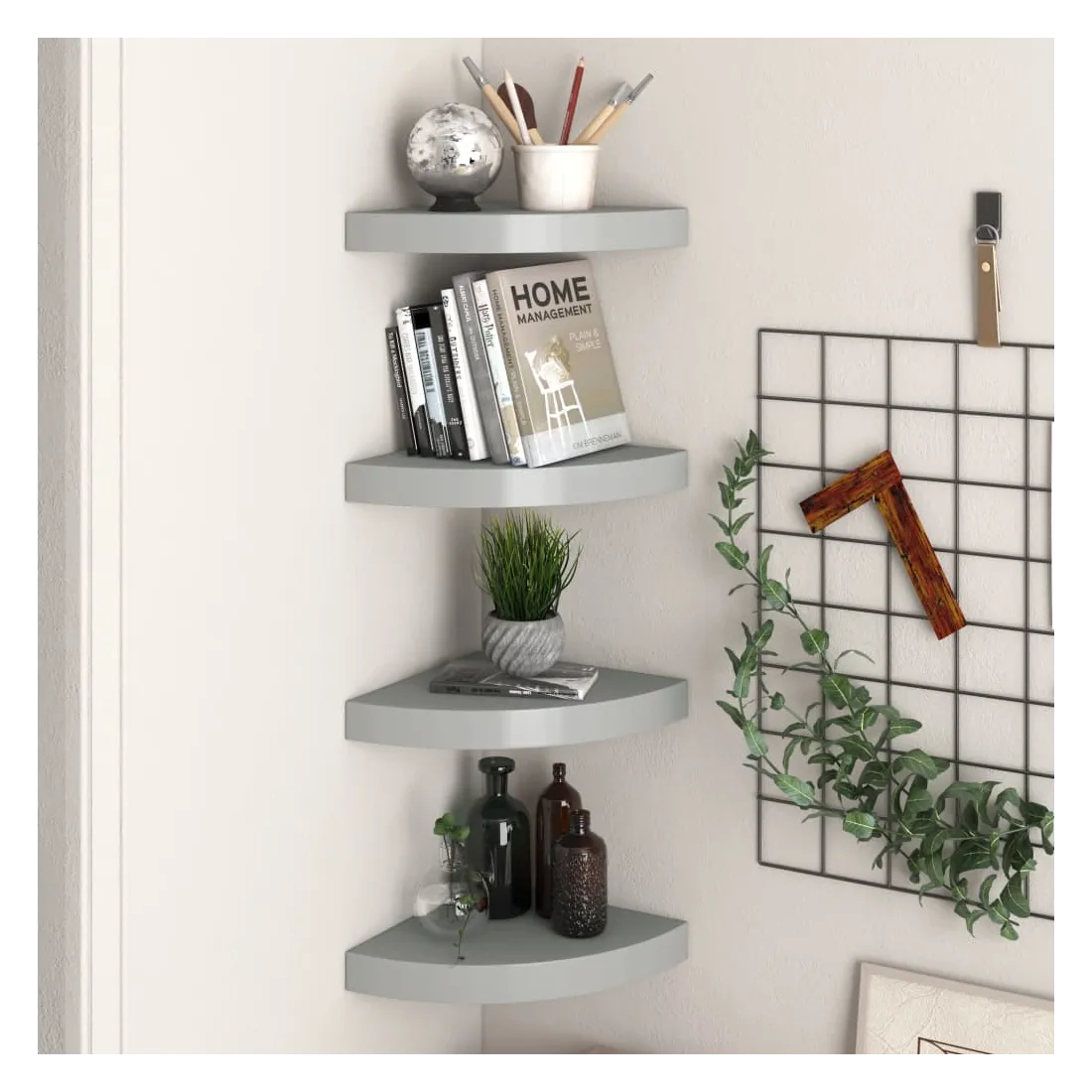 Cet ensemble de 4 étagères d'angle élégantes est idéal pour afficher vos livres préférés, décorations, photos, prix, etc. Cette étagère de présentation, fabriquée en MDF alvéolaire de qualité et en métal solide, est stable et durable. Avec un système de montage invisible, l’étagère murale est facile à installer et sert d’endroit idéal pour stocker des articles tels que des récompenses, des livres, des objets de collection, des ornements, etc. Cette étagère flottante convient à tout décor et transforme un mur vide en une fonctionnalité de design !