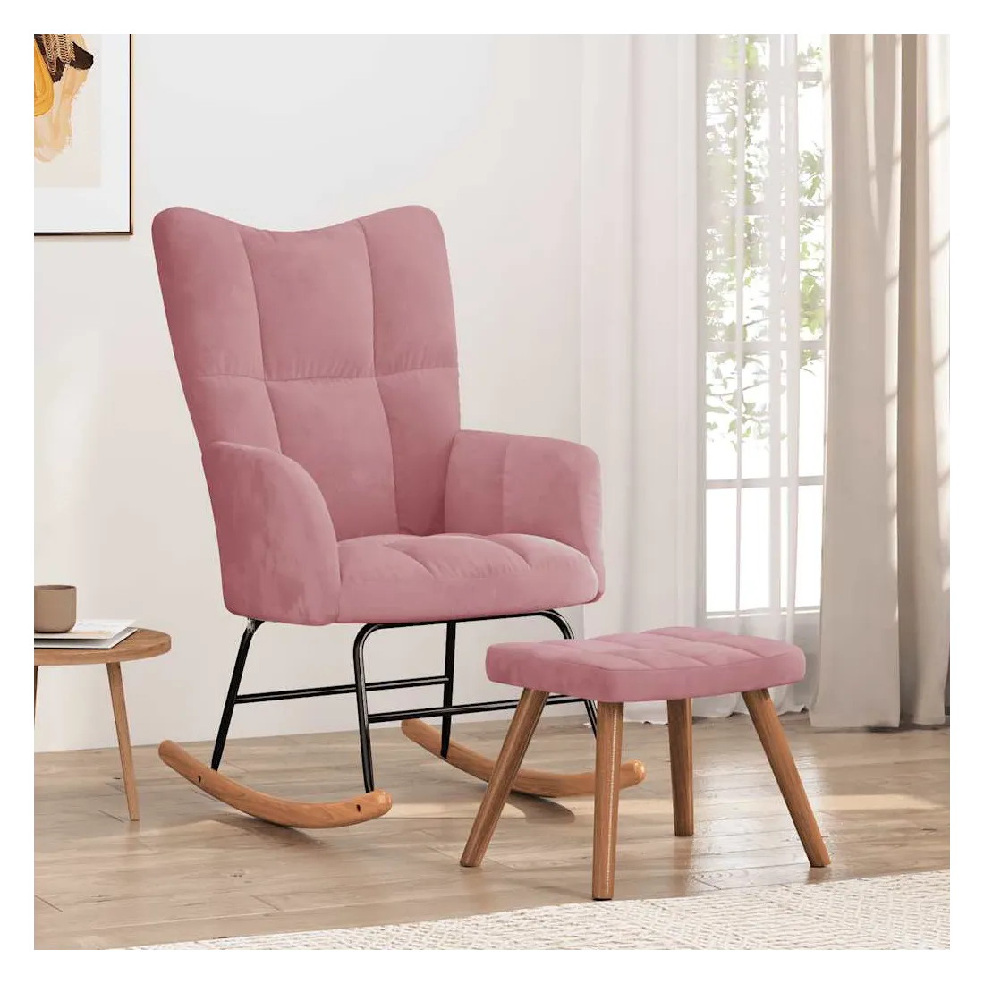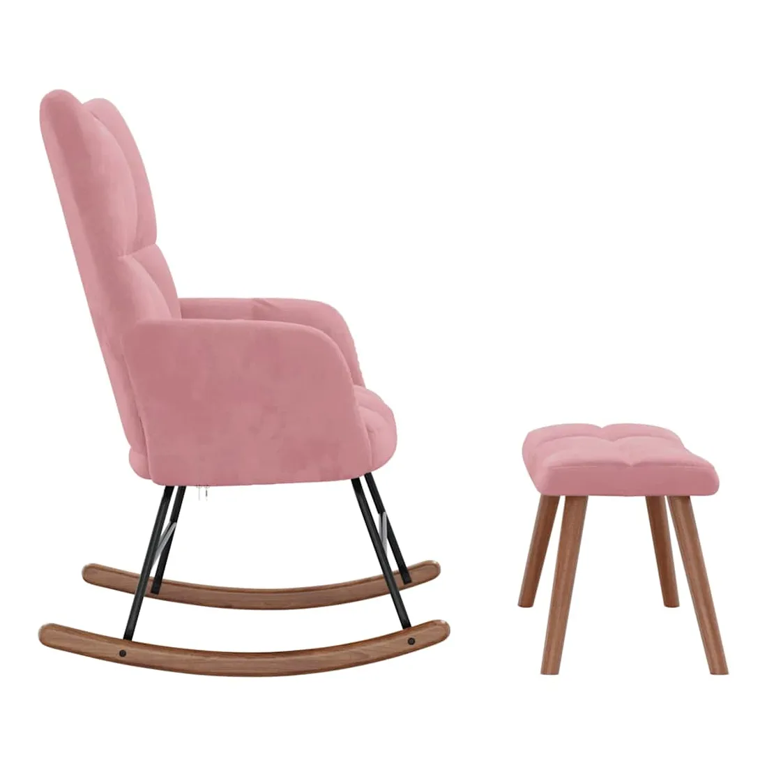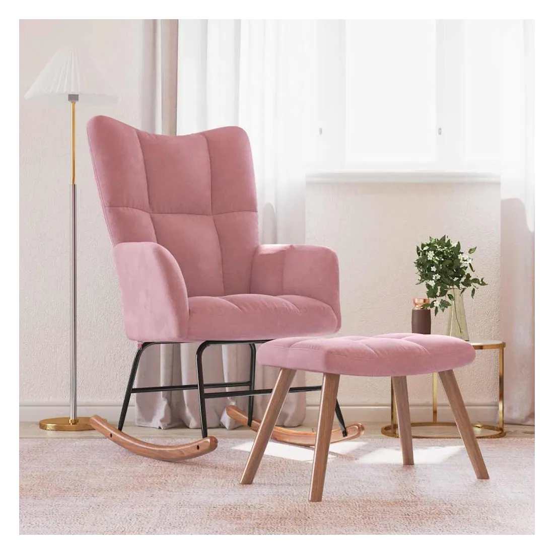 Cette chaise à bascule avec tabouret, au design chic et élégant, apportera une touche de modernité à votre décoration. Dotée de quelques blocs, cette chaise de relaxation est esthétique. Grâce à sa mousse bien rembourrée recouverte de velours doux au toucher, vous pourrez profiter d'un confort optimal pendant votre temps d'assise. Avec la conception de longs rails à bascule, le fauteuil ne basculera pas facilement. De plus, soutenue par un cadre et des pieds en acier, ainsi que par des rails à bascule en bois, la chaise de salon avec un repose-pied est stable et durable.