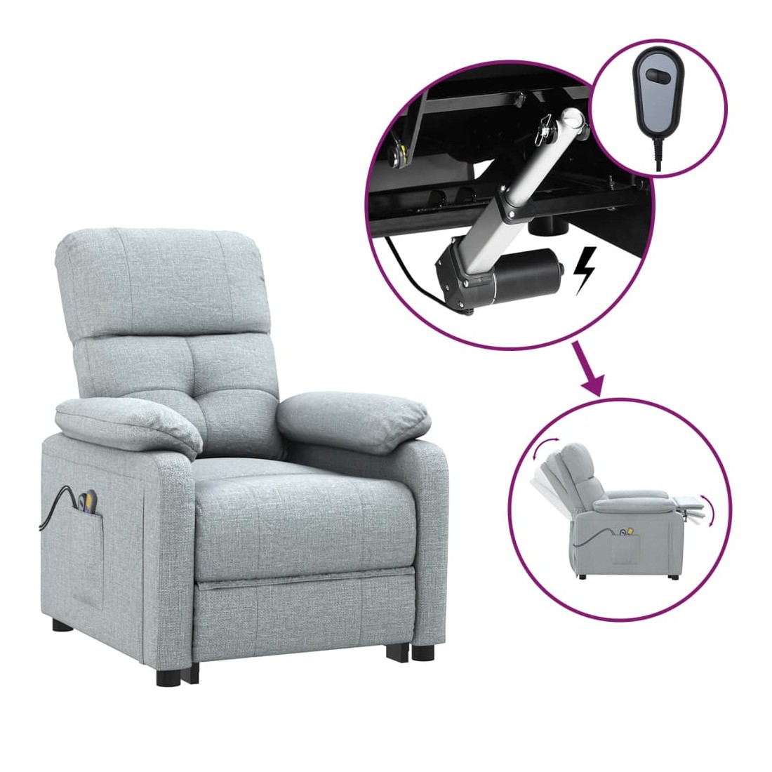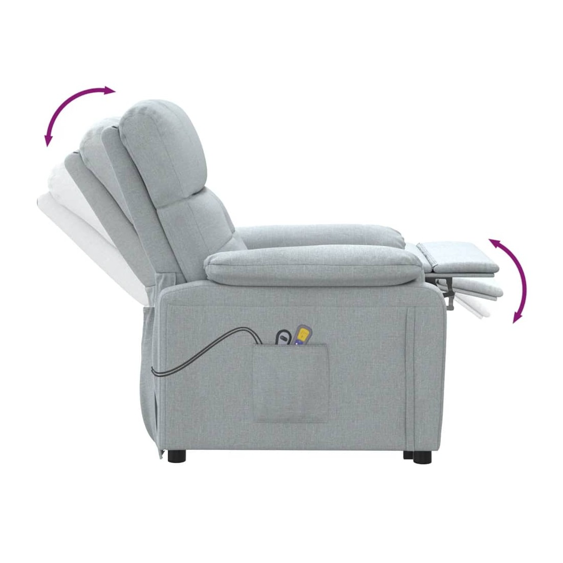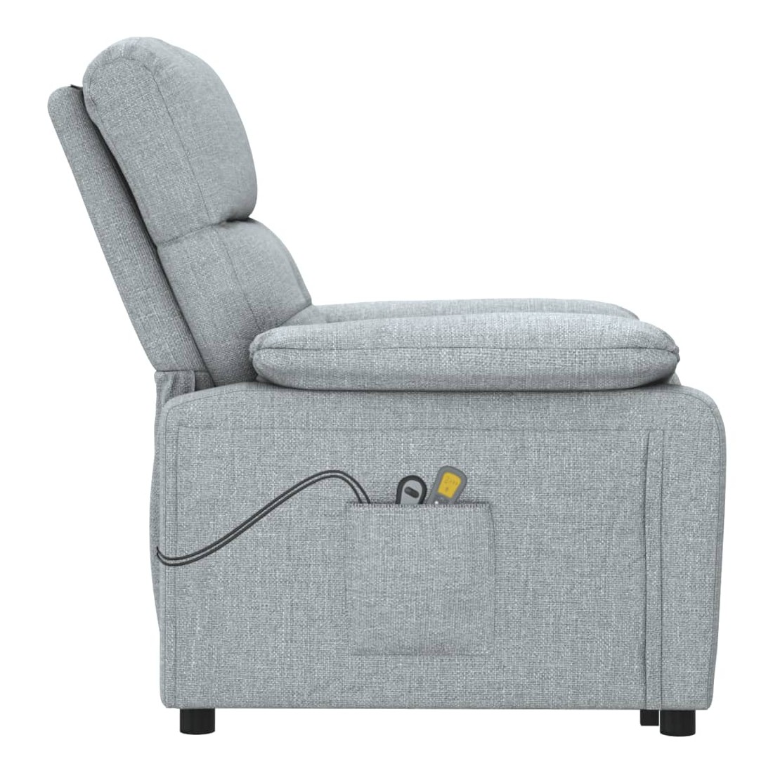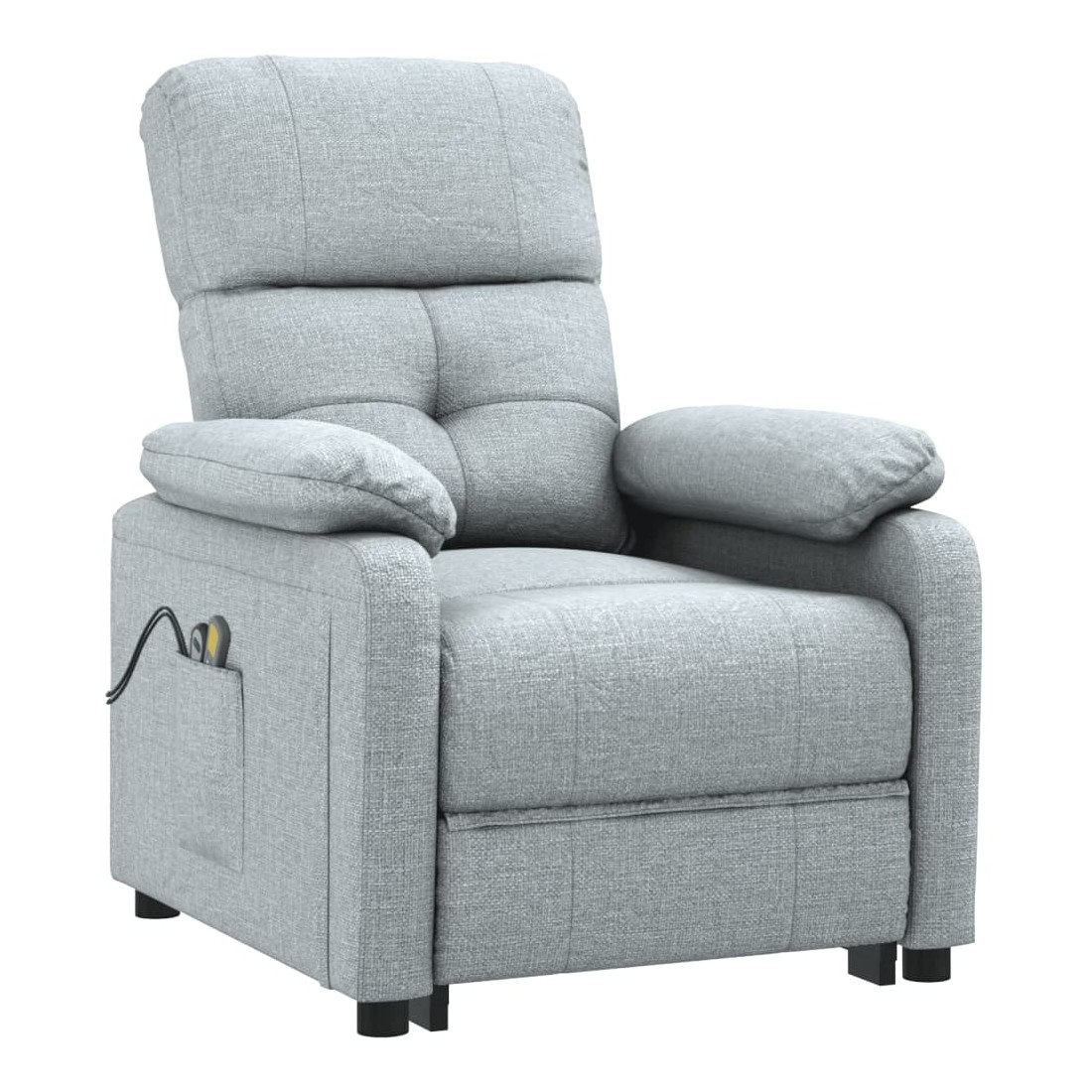 Asseyez-vous et détendez-vous dans ce fauteuil de massage électrique très confortable ! Fonction d'inclinaison électrique : le fauteuil inclinable est équipé d'un moteur électrique pour la fonction d'inclinaison. Il offre 3 positions d'inclinaison et vous pouvez facilement régler le dossier et le repose-pied à l'aide de la commande manuelle à 2 boutons incluse, en fonction de votre confort.Fonction de vibration : les 6 points de massage vous permettent de faire l'expérience d'un massage mieux ciblé. De plus, la télécommande incluse vous permet de choisir différents programmes de massage. La fonction de massage est alimentée par le connecteur USB, mais la source d'alimentation USB 5V certifiée n'est pas incluse.Expérience d'assise confortable : le siège, le dossier et les larges accoudoirs rembourrés épais recouverts de tissu procurent une sensation confortable et chaleureuse, vous permettant de vous sentir enveloppé lorsque vous êtes assis. Le tissu présente un aspect simple et épuré, et est respirant et durable.Cadre solide et stable : le cadre en bois et en métal offre une structure solide et une grande stabilité. Ce fauteuil inclinable est confortable et durable.