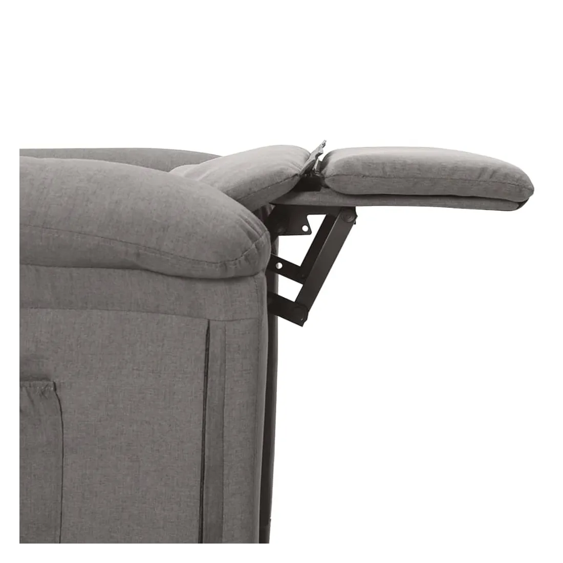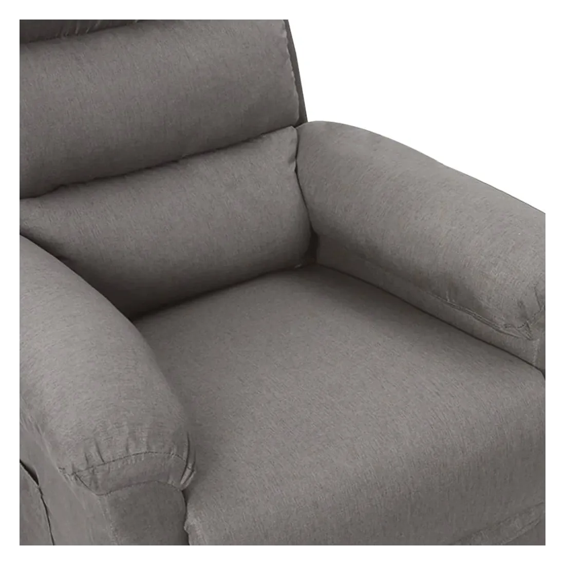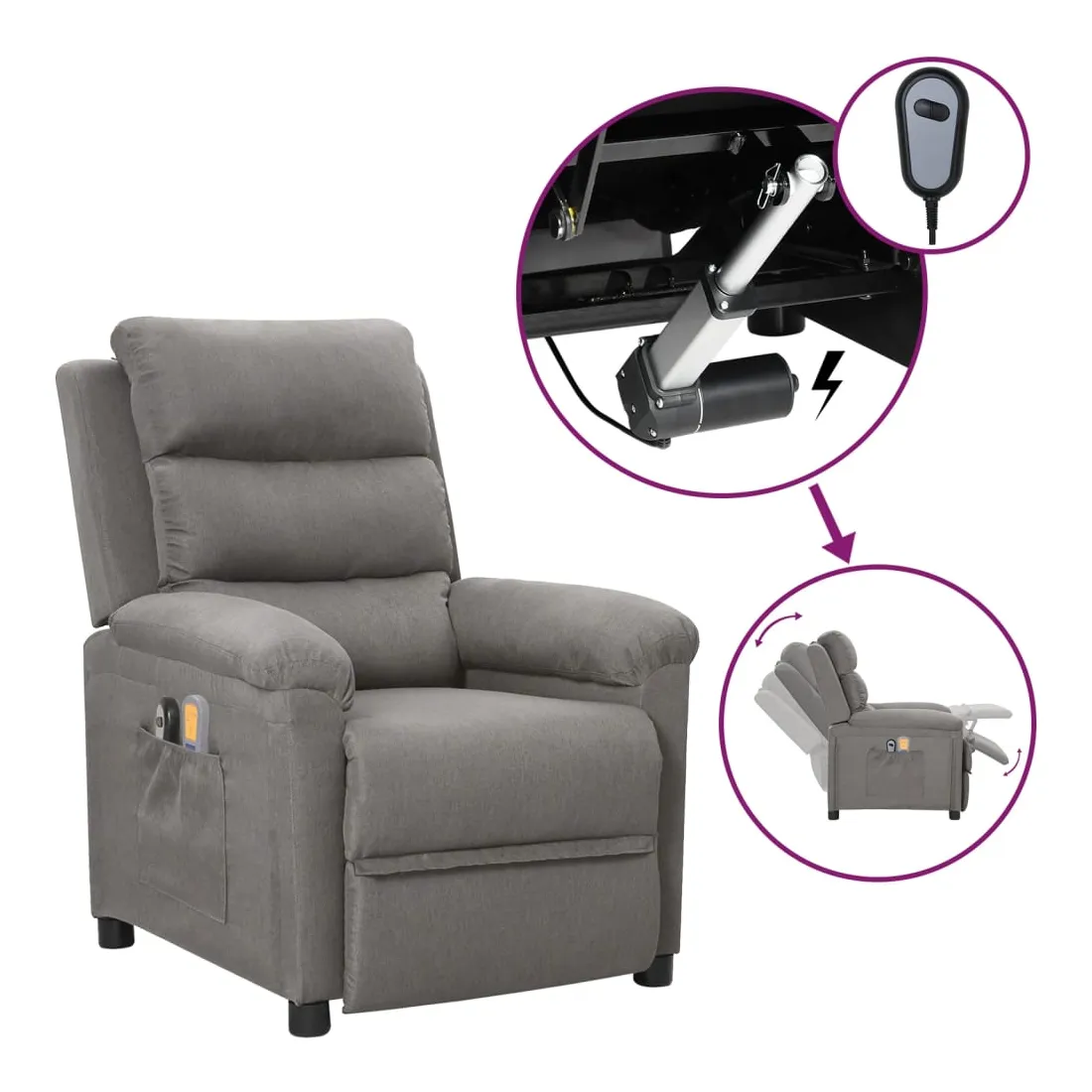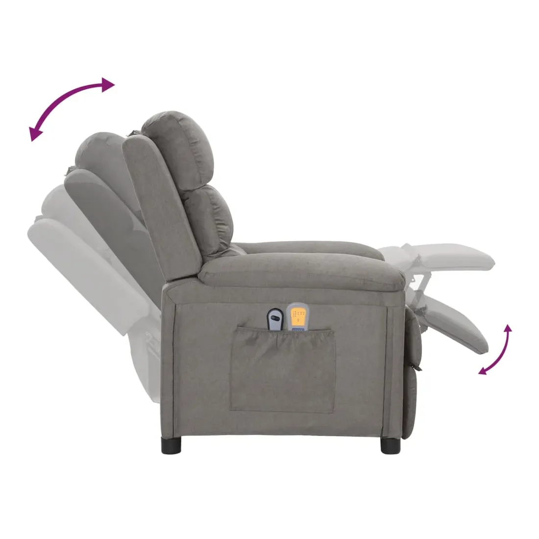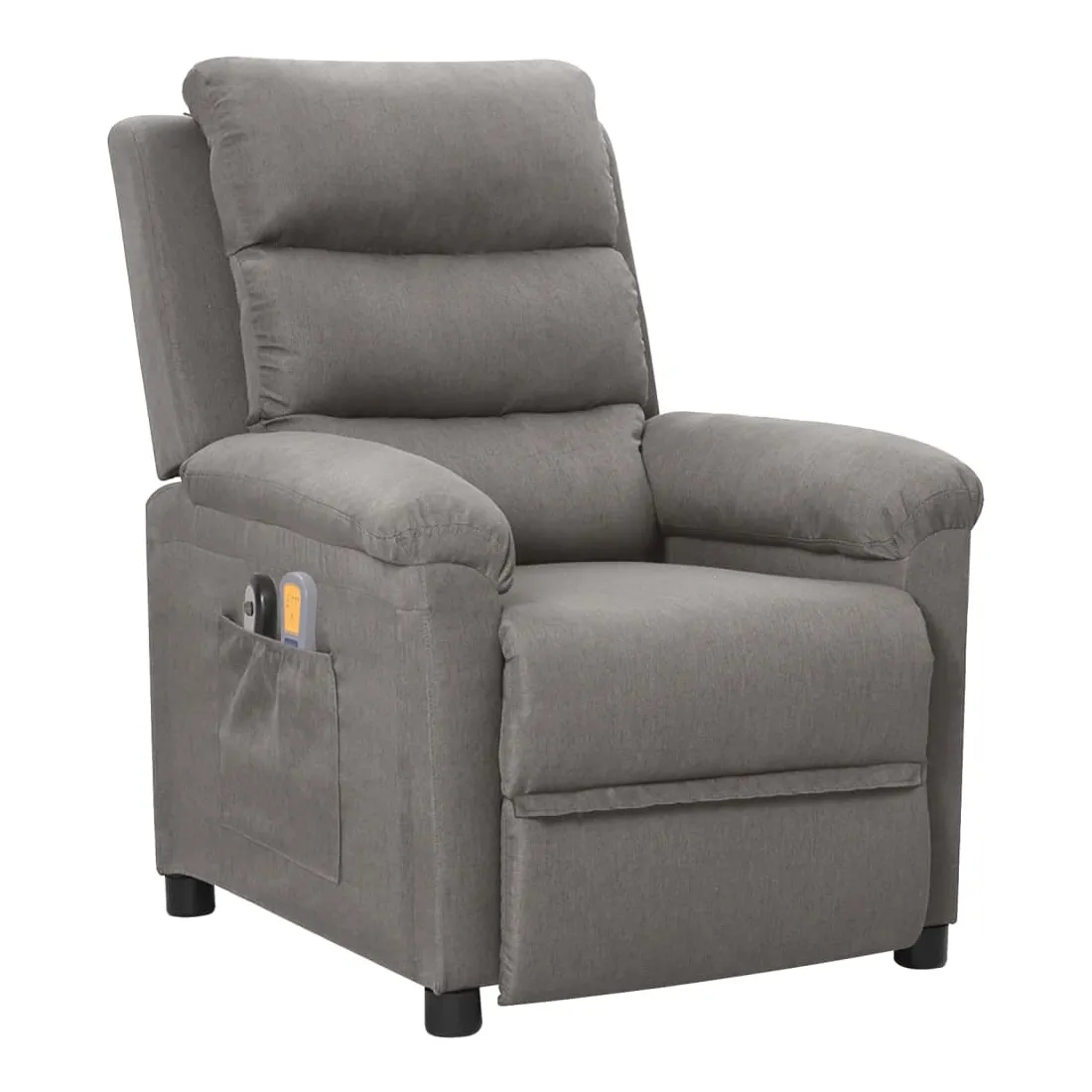 Asseyez-vous et détendez-vous dans ce fauteuil de massage électrique très confortable ! Fonction d'inclinaison électrique : le fauteuil inclinable est équipé d'un moteur électrique pour la fonction d'inclinaison. Il offre 3 positions d'inclinaison et vous pouvez facilement régler le dossier et le repose-pied à l'aide de la commande manuelle à 2 boutons incluse, en fonction de votre confort.Fonction de vibration : les 6 points de massage vous permettent de faire l'expérience d'un massage mieux ciblé. De plus, la télécommande incluse vous permet de choisir différents programmes de massage. La fonction de massage est alimentée par le connecteur USB, mais la source d'alimentation USB 5V certifiée n'est pas incluse.Expérience d'assise confortable : le siège, le dossier et les larges accoudoirs rembourrés épais recouverts de tissu procurent une sensation confortable et chaleureuse, vous permettant de vous sentir enveloppé lorsque vous êtes assis. Le tissu présente un aspect simple et épuré, et est respirant et durable.Cadre solide et stable : le cadre en bois et en métal offre une structure solide et une grande stabilité. Ce fauteuil inclinable est confortable et durable.