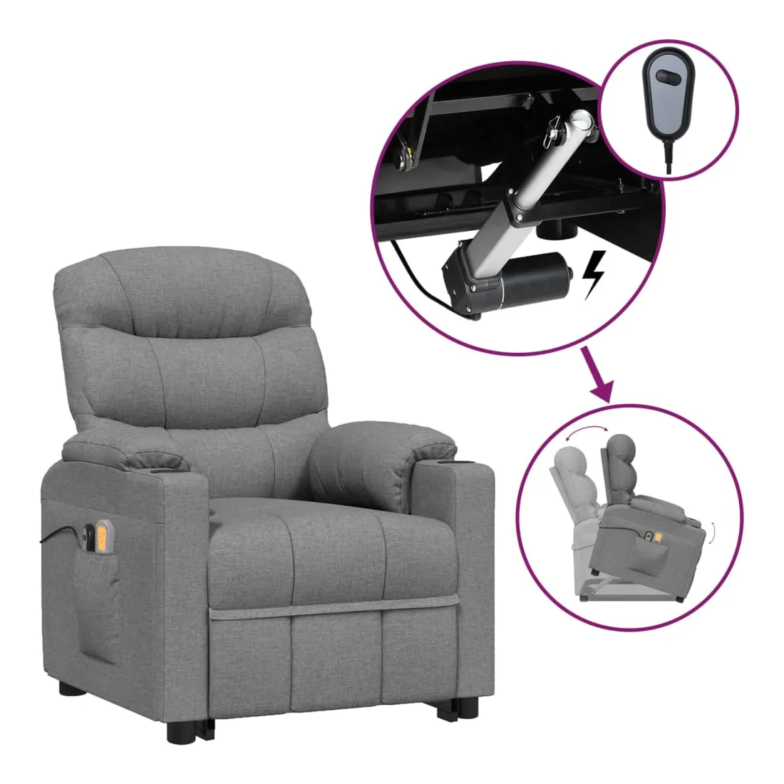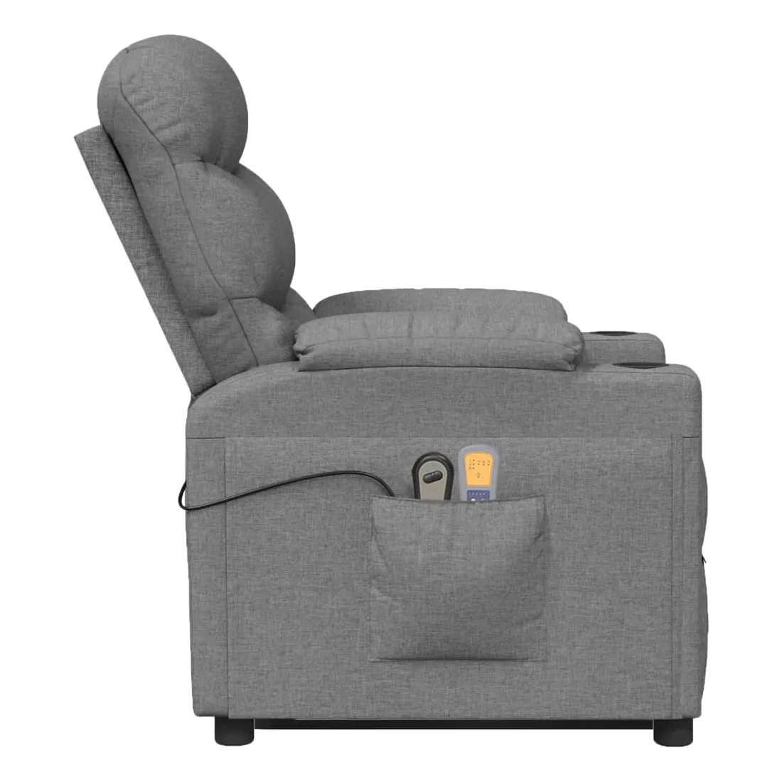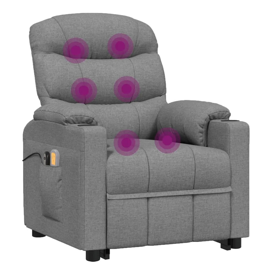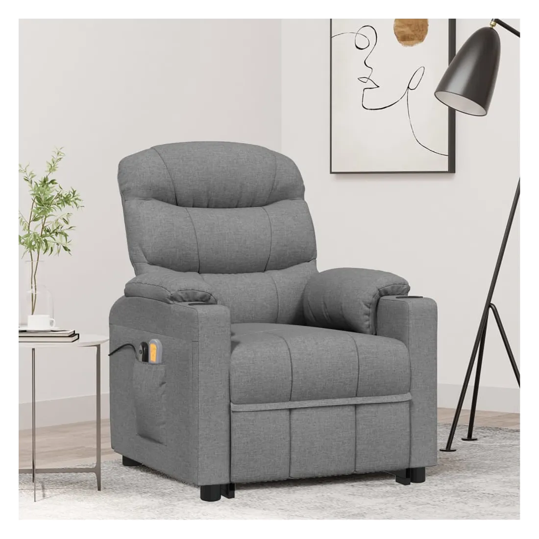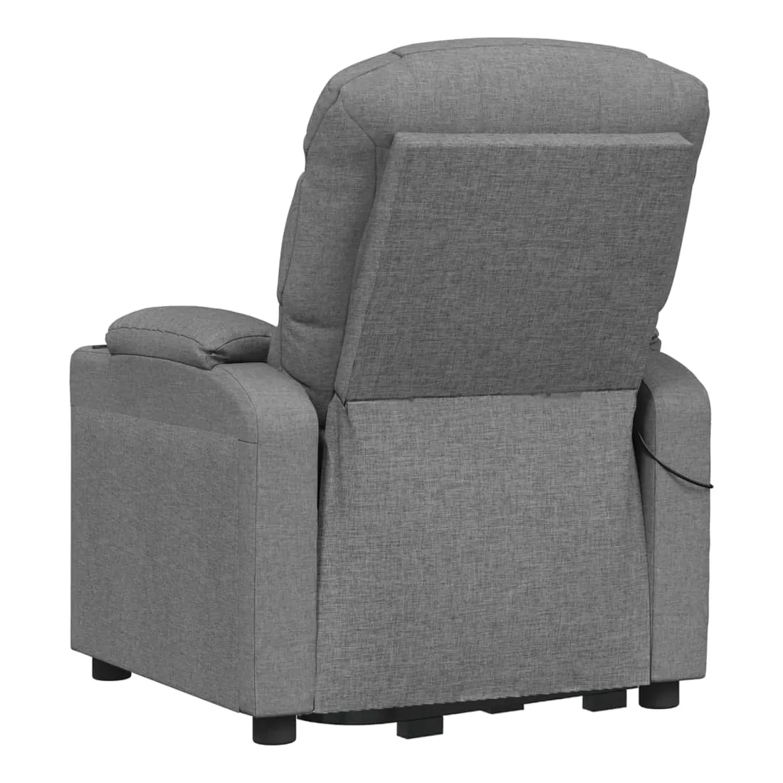 Asseyez-vous et détendez-vous dans ce fauteuil de massage très confortable ! Fonction d'inclinaison manuelle : le fauteuil inclinable est spécialement conçu avec 3 positions d'inclinaison afin que vous puissiez régler manuellement le dossier et le repose-pieds selon votre confort.Fonction de levage électrique : ce fauteuil inclinable pour personnes âgées est équipé d'un moteur électrique pour la fonction de levage. Grâce à la fonction qui pousse toute la chaise vers le haut, vous pouvez facilement vous tenir debout sans stresser votre dos et vos genoux grâce à la commande manuelle à 2 boutons.Fonction de vibration : les 6 points de massage vous permettent de faire l'expérience d'un massage mieux ciblé. De plus, la télécommande incluse vous permet de choisir différents programmes de massage. La fonction de massage est alimentée par le connecteur USB, mais la source d'alimentation USB 5V certifiée n'est pas incluse.Expérience d'assise confortable : le siège, le dossier et les larges accoudoirs rembourrés épais recouverts de tissu procurent une sensation confortable et chaleureuse, vous permettant de vous sentir enveloppé lorsque vous êtes assis. Le tissu présente un aspect simple et épuré, et est respirant et durable.Cadre solide et stable : le cadre en bois et en métal offre une structure solide et une grande stabilité. Ce fauteuil inclinable est confortable et durable.