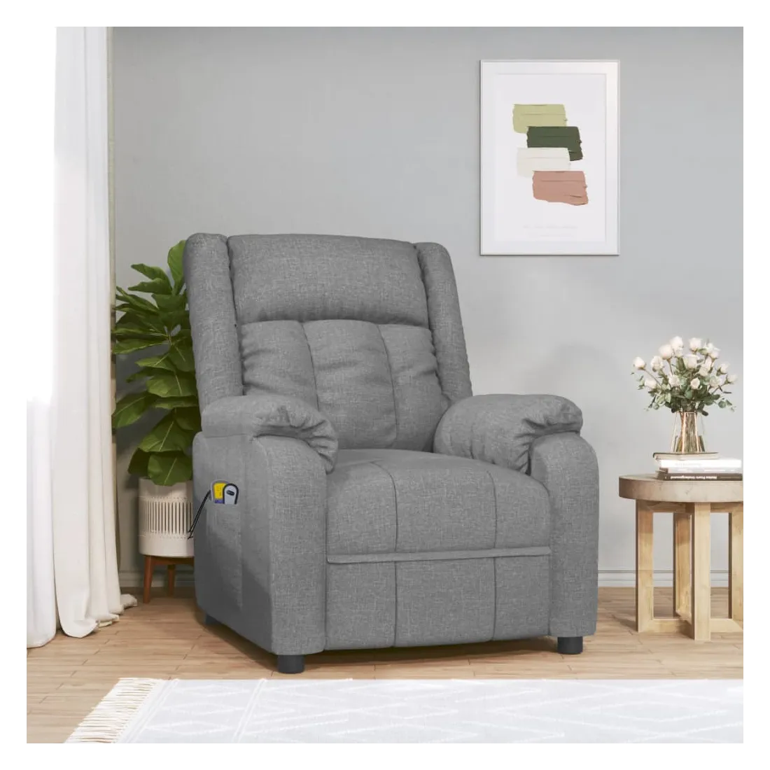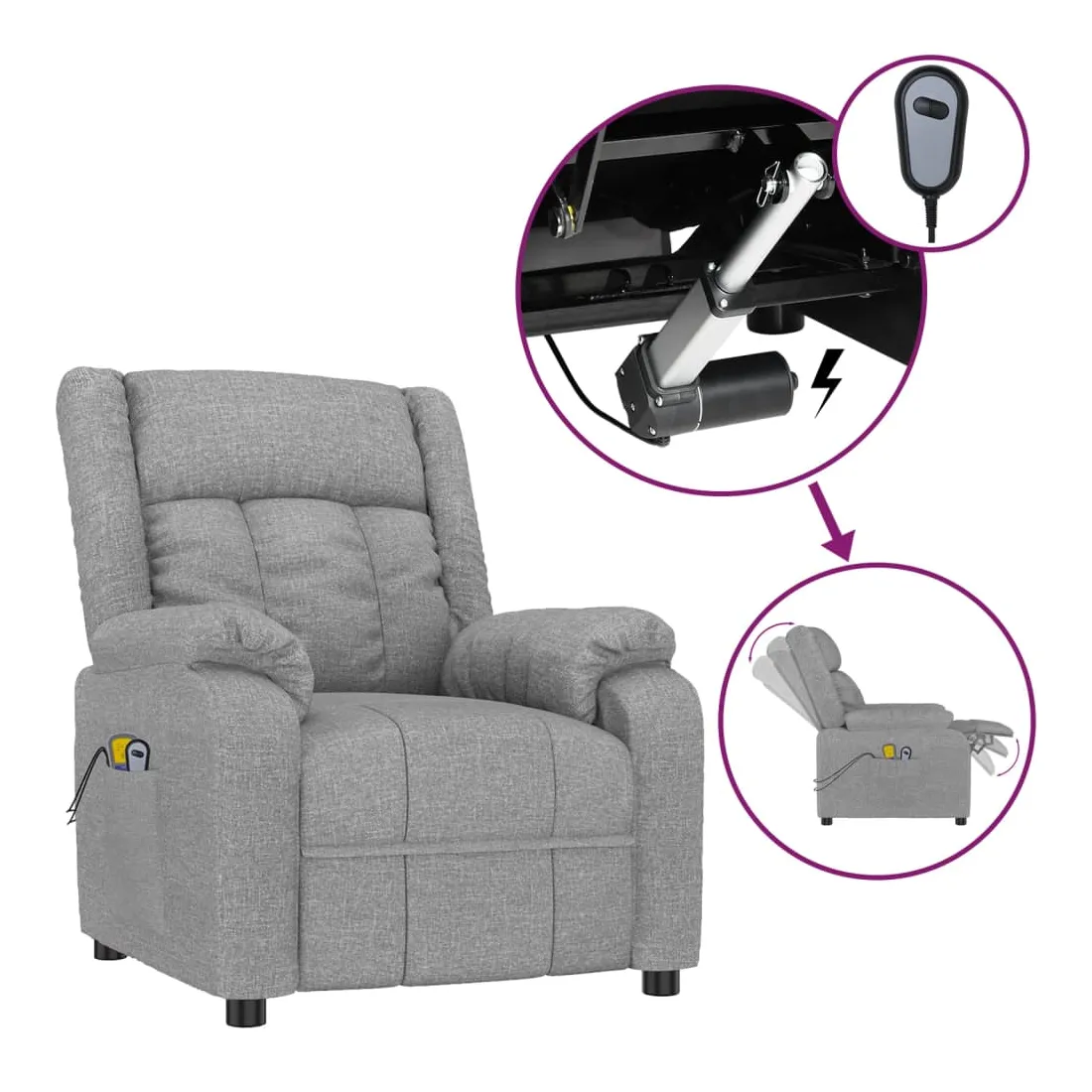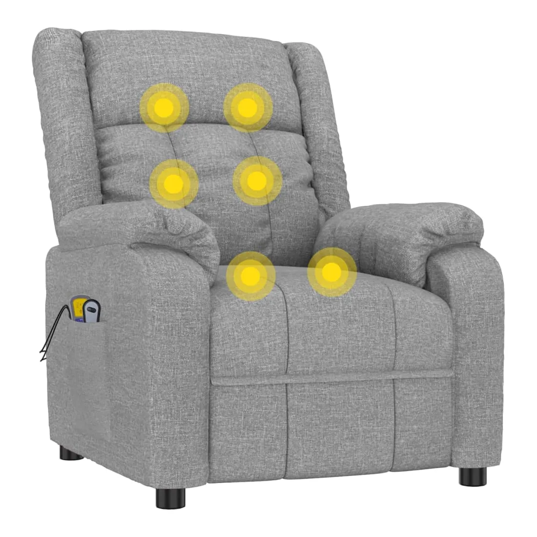 Asseyez-vous et détendez-vous dans ce fauteuil de massage électrique très confortable ! Fonction d'inclinaison électrique : le fauteuil inclinable est équipé d'un moteur électrique pour la fonction d'inclinaison. Il offre 3 positions d'inclinaison et vous pouvez facilement régler le dossier et le repose-pied à l'aide de la commande manuelle à 2 boutons incluse, en fonction de votre confort.Fonction de vibration : les 6 points de massage vous permettent de faire l'expérience d'un massage mieux ciblé. De plus, la télécommande incluse vous permet de choisir différents programmes de massage. La fonction de massage est alimentée par le connecteur USB, mais la source d'alimentation USB 5V certifiée n'est pas incluse.Expérience d'assise confortable : le siège, le dossier et les larges accoudoirs rembourrés épais recouverts de tissu procurent une sensation confortable et chaleureuse, vous permettant de vous sentir enveloppé lorsque vous êtes assis. Le tissu présente un aspect simple et épuré, et est respirant et durable.Cadre solide et stable : le cadre en bois et en métal offre une structure solide et une grande stabilité. Ce fauteuil inclinable est confortable et durable.