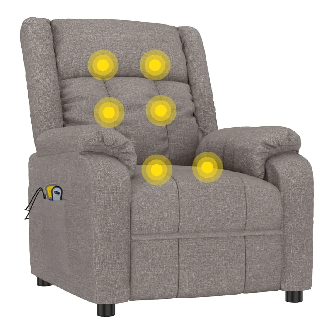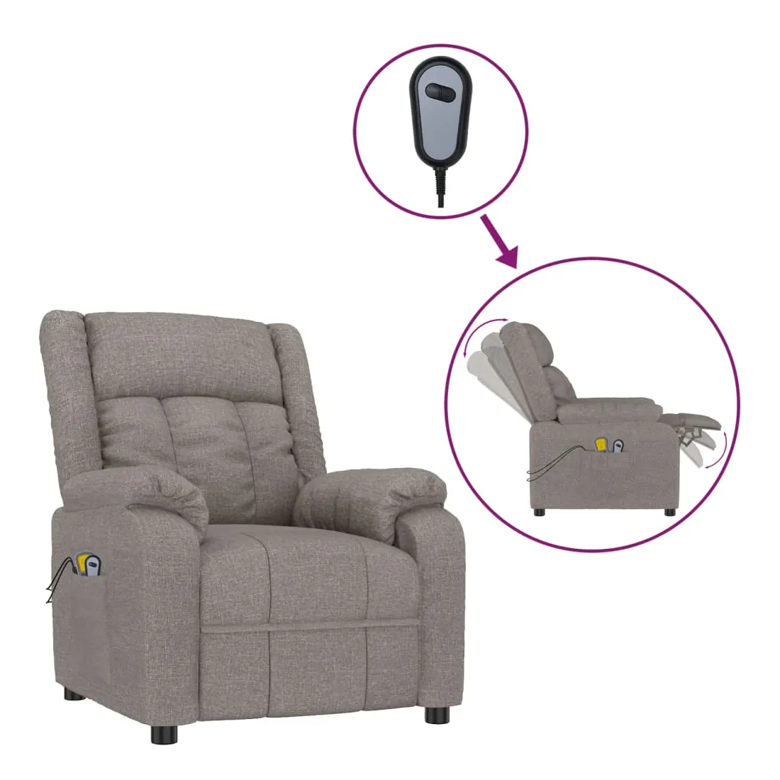 Asseyez-vous et détendez-vous dans ce fauteuil de massage électrique très confortable ! Fonction d'inclinaison électrique : le fauteuil inclinable est équipé d'un moteur électrique pour la fonction d'inclinaison. Il offre 3 positions d'inclinaison et vous pouvez facilement régler le dossier et le repose-pied à l'aide de la commande manuelle à 2 boutons incluse, en fonction de votre confort.Fonction de vibration : les 6 points de massage vous permettent de faire l'expérience d'un massage mieux ciblé. De plus, la télécommande incluse vous permet de choisir différents programmes de massage. La fonction de massage est alimentée par le connecteur USB, mais la source d'alimentation USB 5V certifiée n'est pas incluse.Expérience d'assise confortable : le siège, le dossier et les larges accoudoirs rembourrés épais recouverts de tissu procurent une sensation confortable et chaleureuse, vous permettant de vous sentir enveloppé lorsque vous êtes assis. Le tissu présente un aspect simple et épuré, et est respirant et durable.Cadre solide et stable : le cadre en bois et en métal offre une structure solide et une grande stabilité. Ce fauteuil inclinable est confortable et durable.
