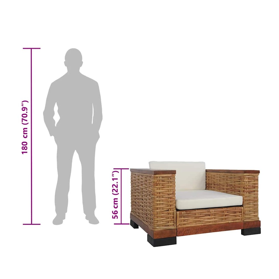 Ce fauteuil en rotin naturel associe style et fonctionnalité et sera un excellent supplément à votre maison. Grâce au matériau de rotin véritable, le fauteuil est facile à nettoyer, résistant à l'usure et adapté à une utilisation quotidienne. Il dispose d'un cadre en bois robuste, très durable et stable. Les coussins épais de dossier et de siège sont considérablement confortables et également lavables grâce à leurs housses amovibles. En outre, les accoudoirs larges s'ajoutent au confort de votre assise. La livraison inclut 1 fauteuil, 1 coussin de siège et 1 coussin de dossier.