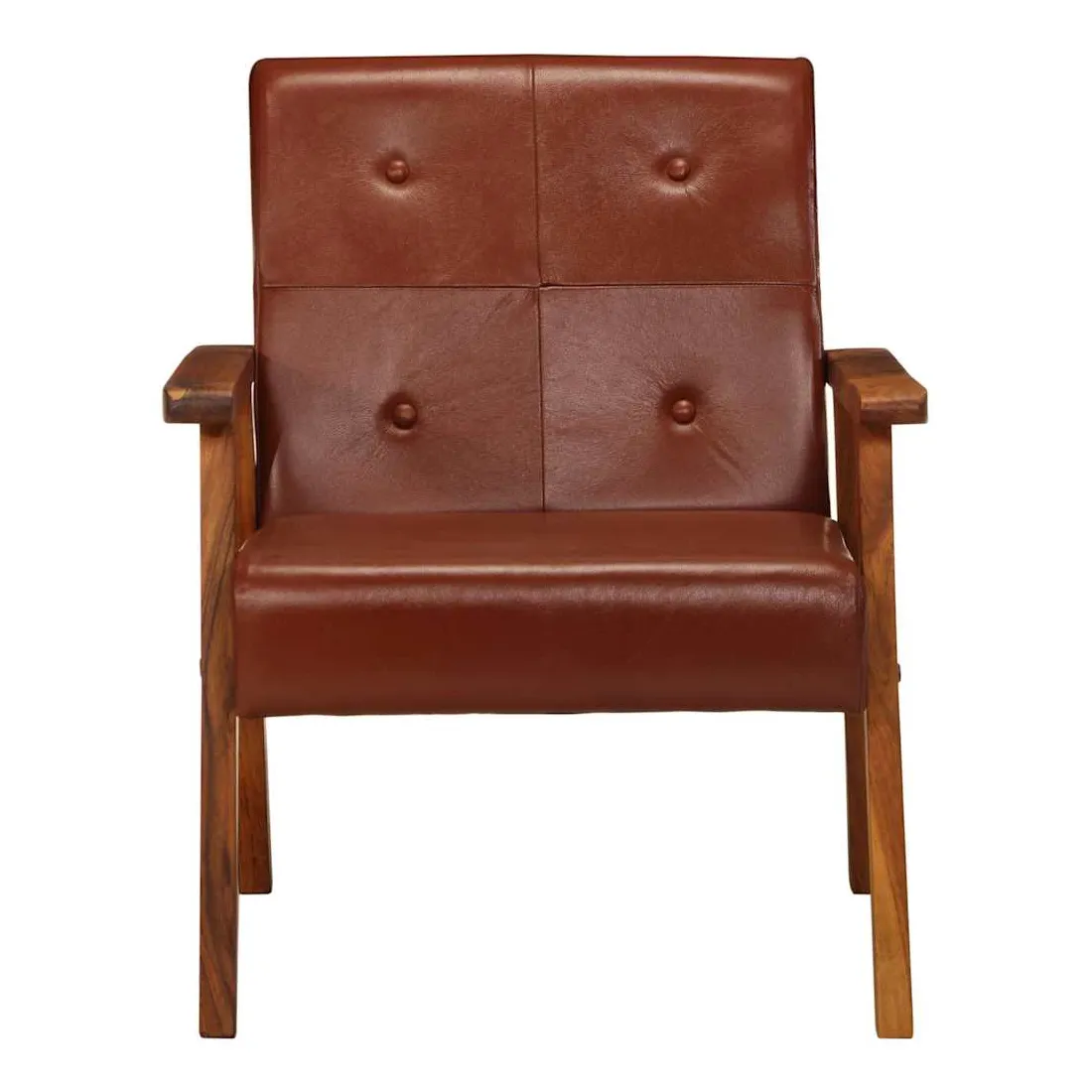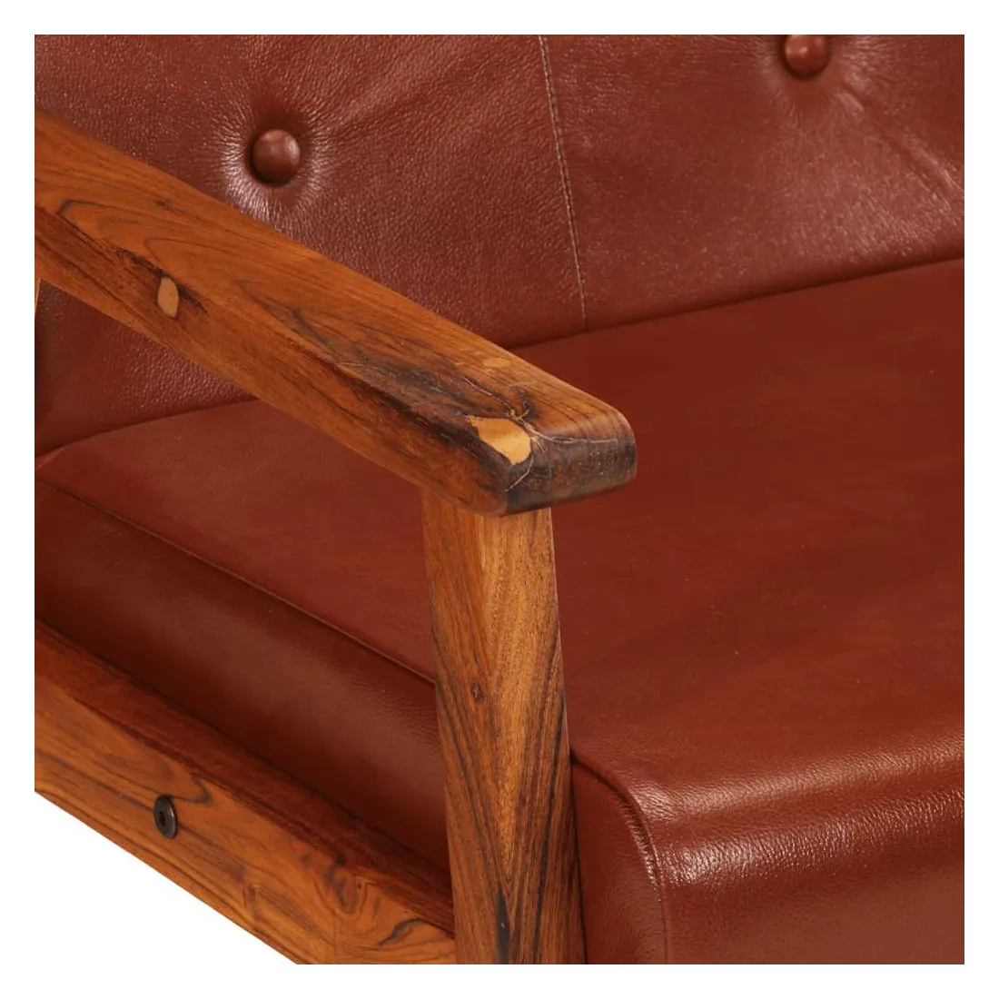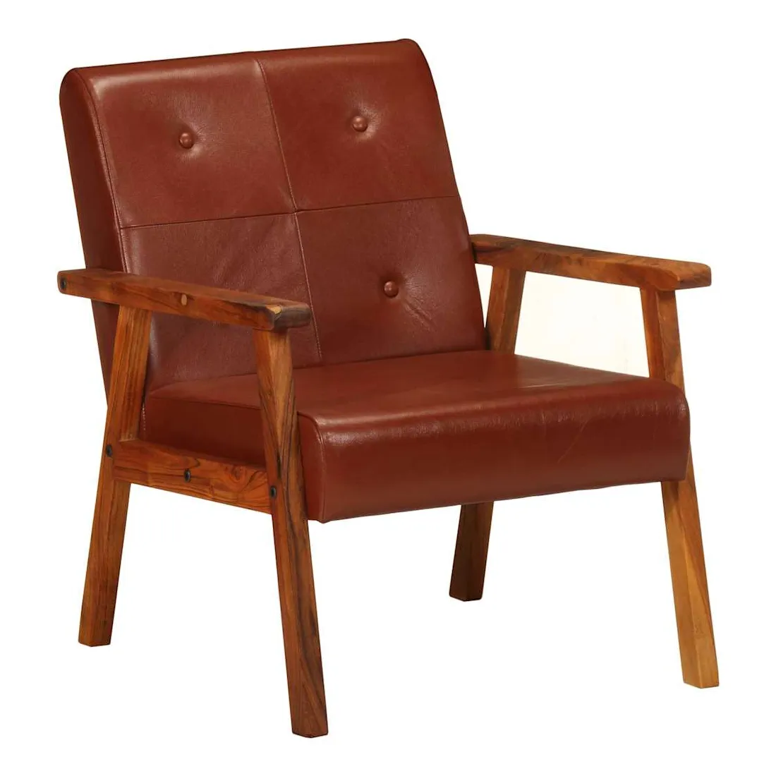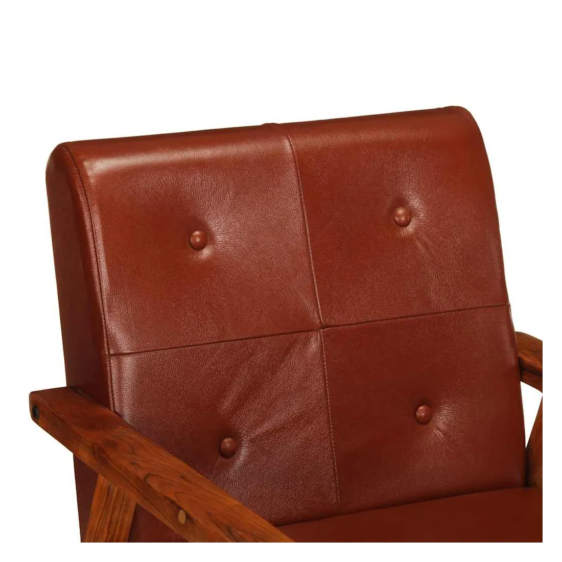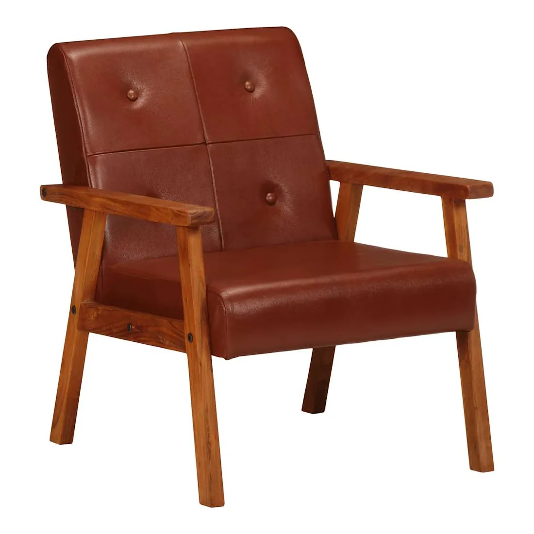 Notre fauteuil en cuir véritable sera un excellent complément à la décoration de votre salon, bureau ou chambre à coucher. Le fauteuil est fait de cuir véritable facile à nettoyer et décoré de boutons, ce qui ajoute une touche de luxe à tout intérieur. Son siège et son dossier bien rembourrés assurent un confort d'assise optimal. De plus, le cadre en bois d'acacia solide améliore la stabilité et la durabilité du fauteuil. C'est l'endroit idéal pour regarder un film, lire un livre ou tout simplement vous détendre ! Ce fauteuil est facile à assembler.