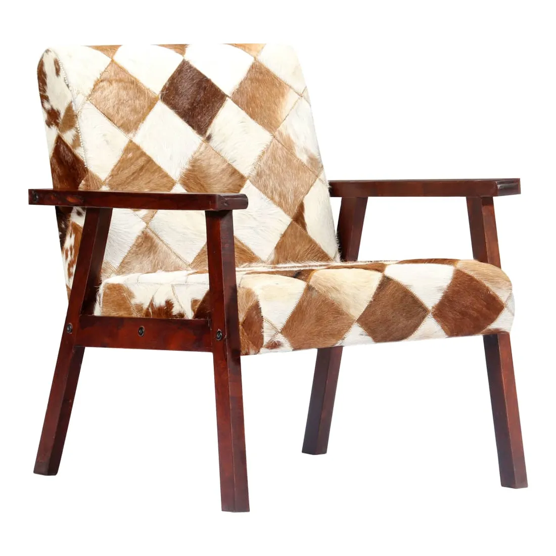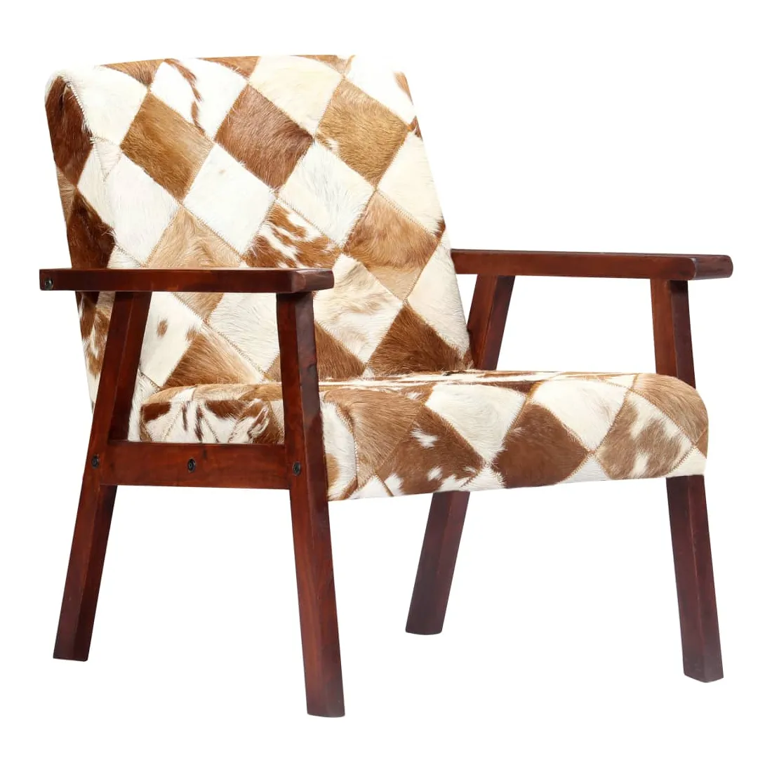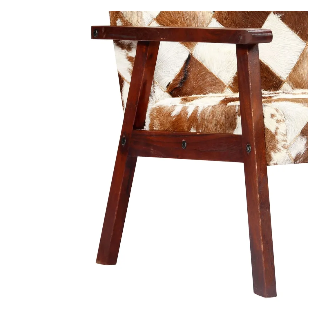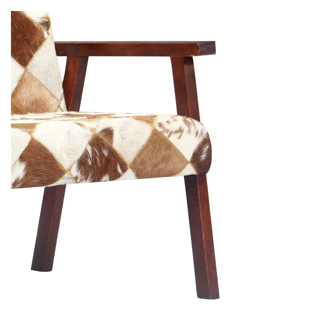 Ce fauteuil très confortable à l'aspect de cuir de vache, au design sobre, sera idéal pour bavarder, lire, regarder la télévision ou simplement vous détendre. Fait de cuir de chèvre velu de qualité supérieure avec une finition de couleur de miel, le fauteuil ajoute non seulement une touche de luxe à votre maison, mais vous procure également un confort supplémentaire. De plus, avec un cadre en bois d'acacia solide, le canapé unique est stable et durable. Grâce à ses accoudoirs et à son rembourrage en tissu épais, la chaise est très confortable. La chaise est facile à assembler. Remarque importante : les motifs en cuir peuvent varier d’une pièce à l’autre, ce qui rend chacune de nos chaises unique. La livraison est aléatoire, ce qui garantit l'exclusivité et l'individualité de votre produit.