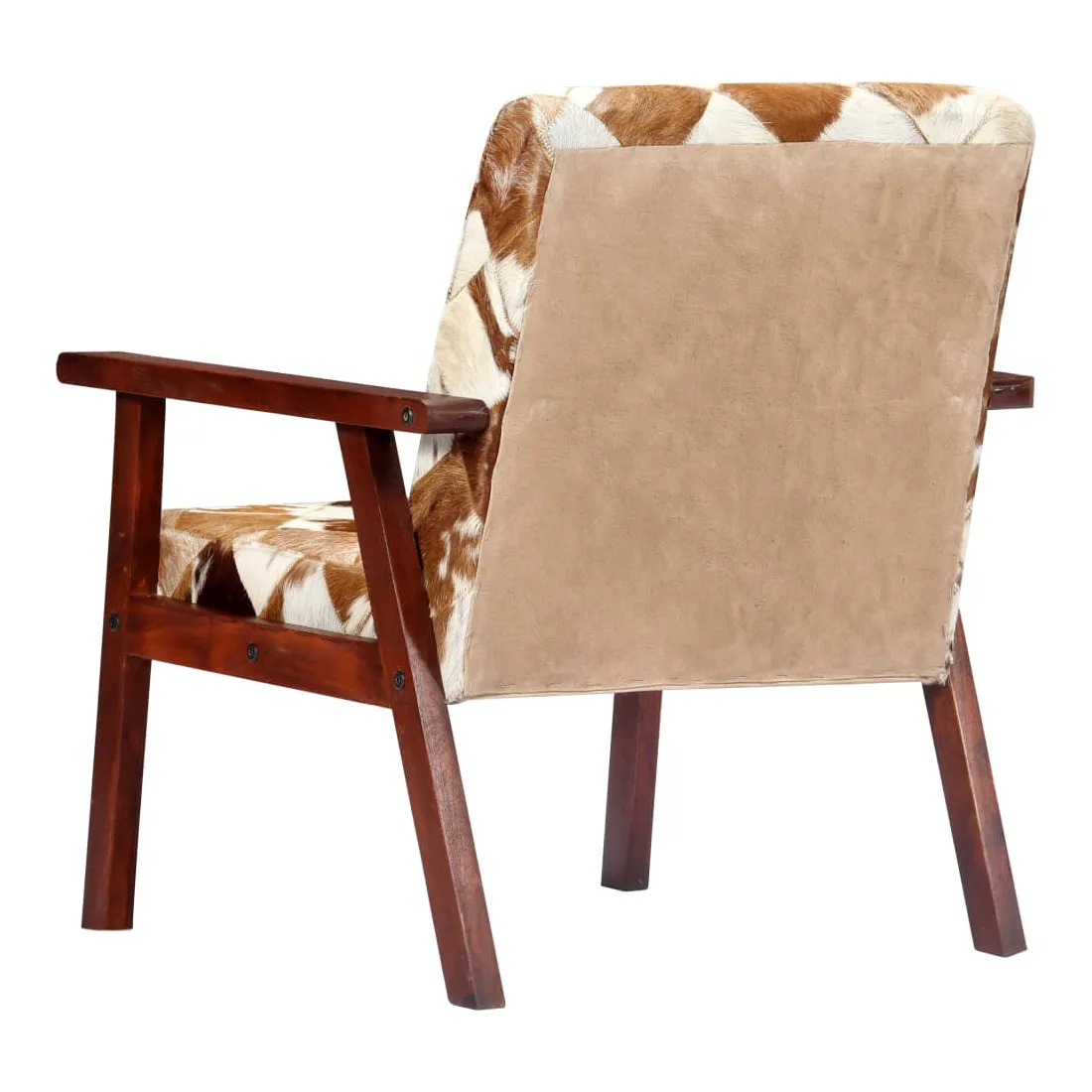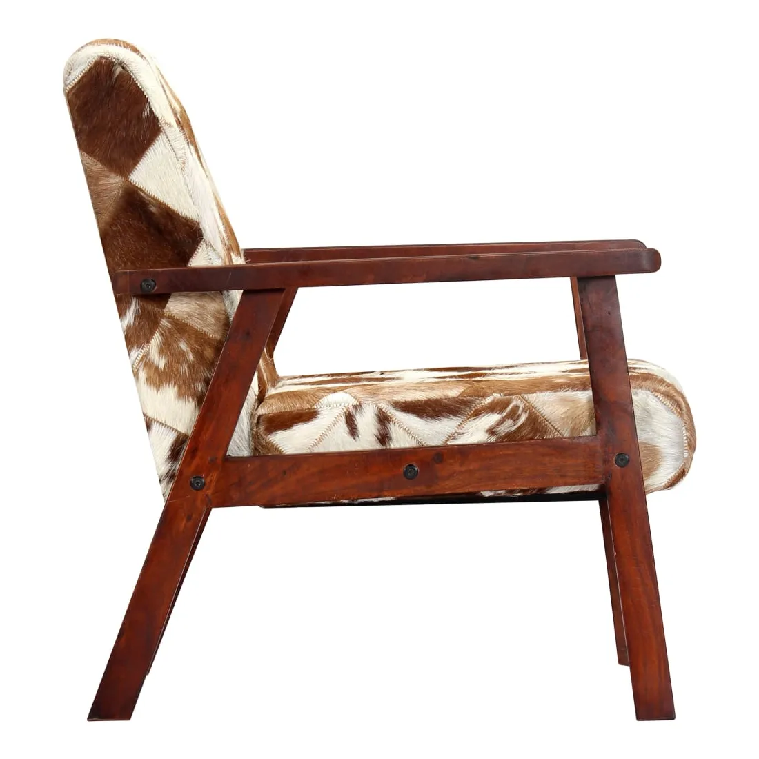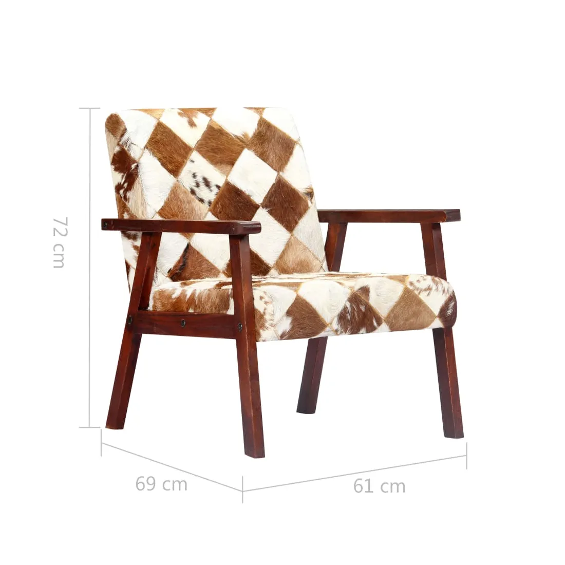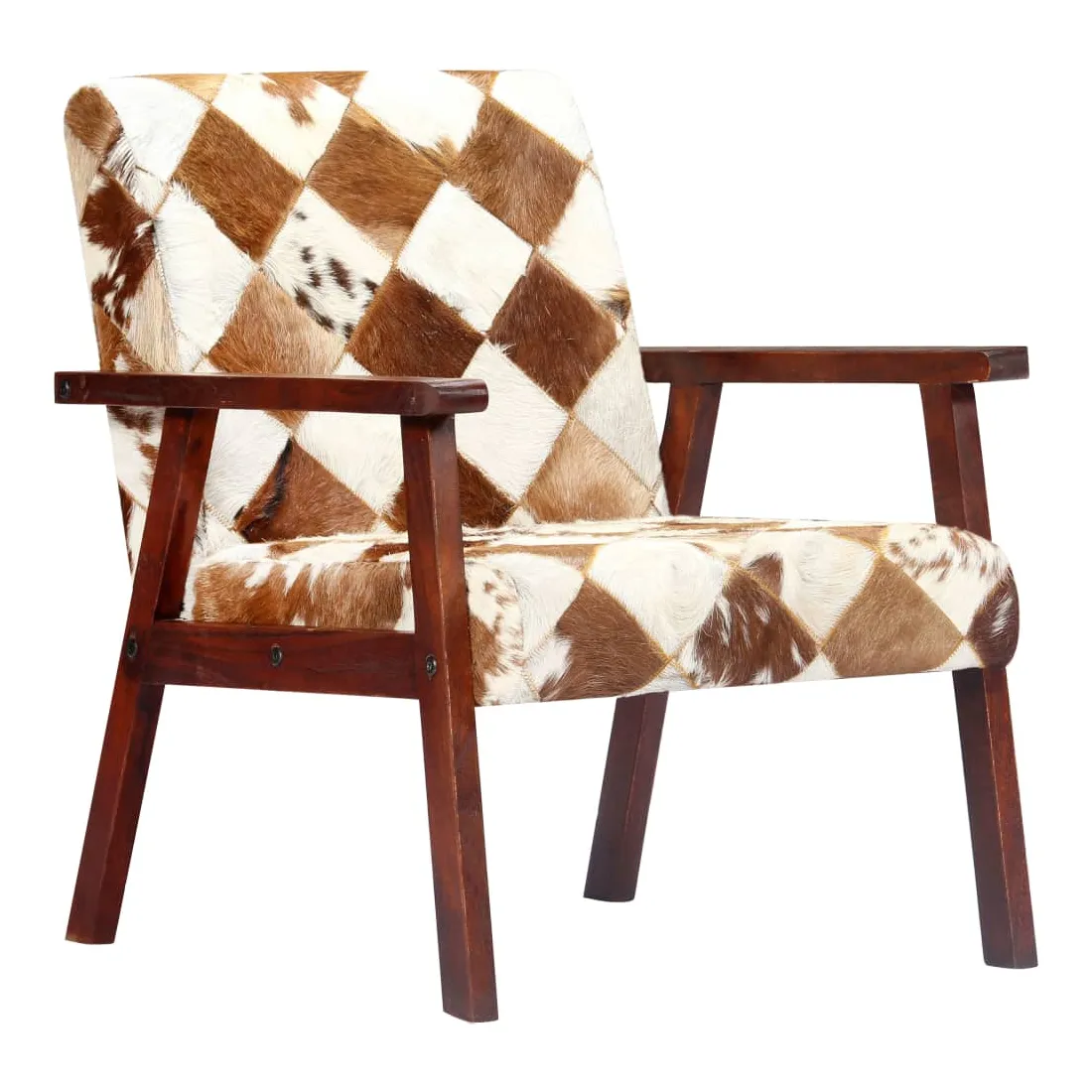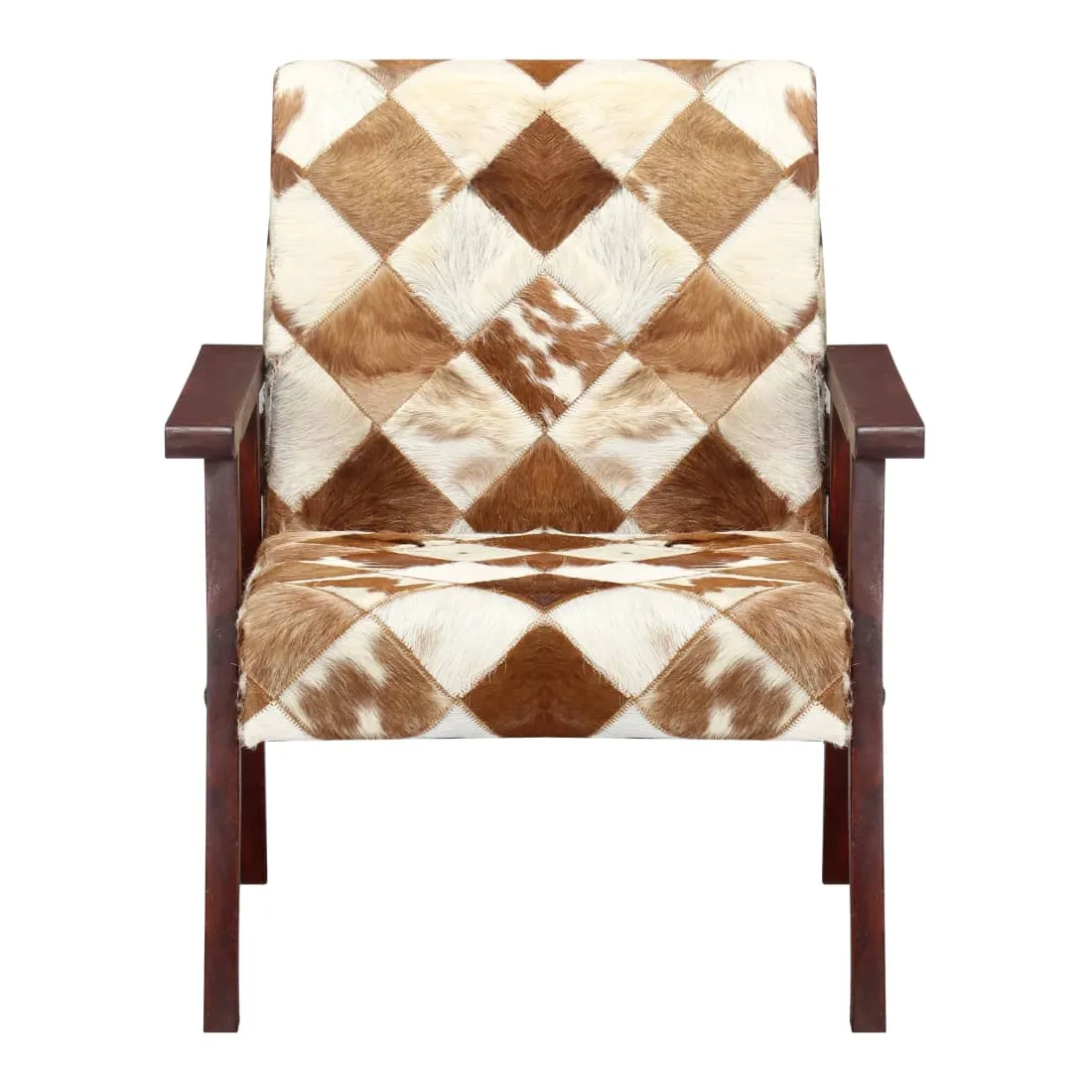 Ce fauteuil très confortable à l'aspect de cuir de vache, au design sobre, sera idéal pour bavarder, lire, regarder la télévision ou simplement vous détendre. Fait de cuir de chèvre velu de qualité supérieure avec une finition de couleur de miel, le fauteuil ajoute non seulement une touche de luxe à votre maison, mais vous procure également un confort supplémentaire. De plus, avec un cadre en bois d'acacia solide, le canapé unique est stable et durable. Grâce à ses accoudoirs et à son rembourrage en tissu épais, la chaise est très confortable. La chaise est facile à assembler. Remarque importante : les motifs en cuir peuvent varier d’une pièce à l’autre, ce qui rend chacune de nos chaises unique. La livraison est aléatoire, ce qui garantit l'exclusivité et l'individualité de votre produit.