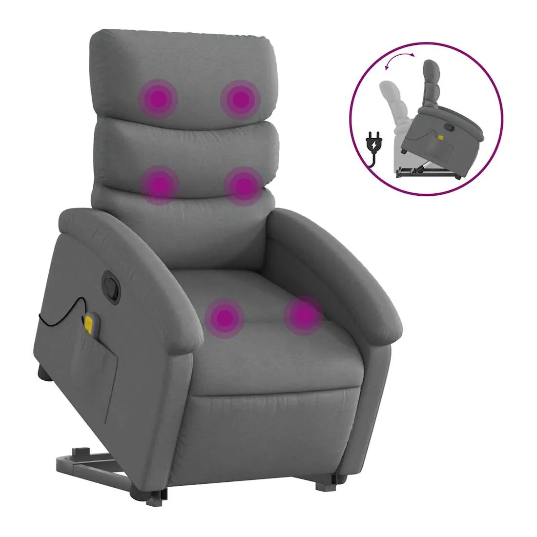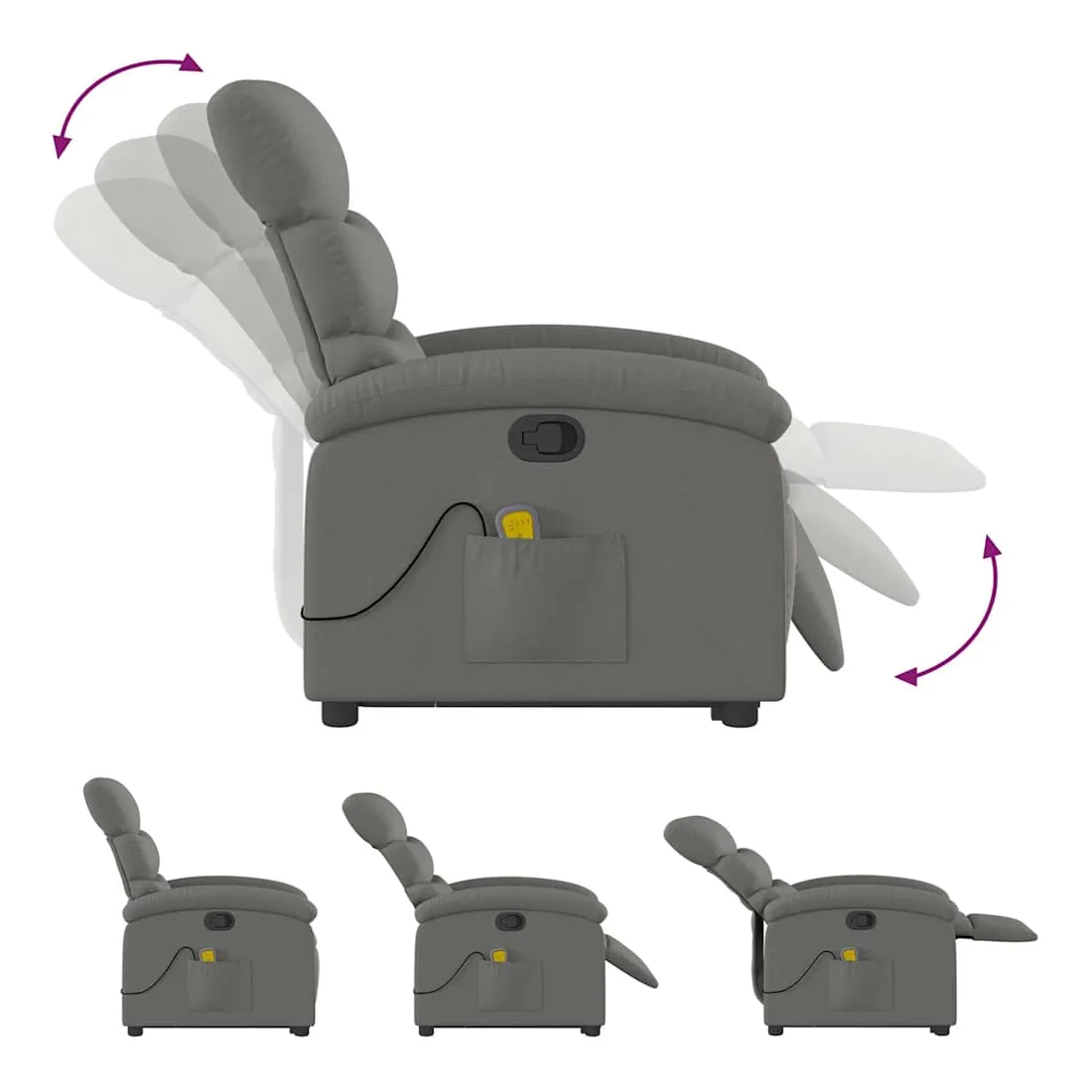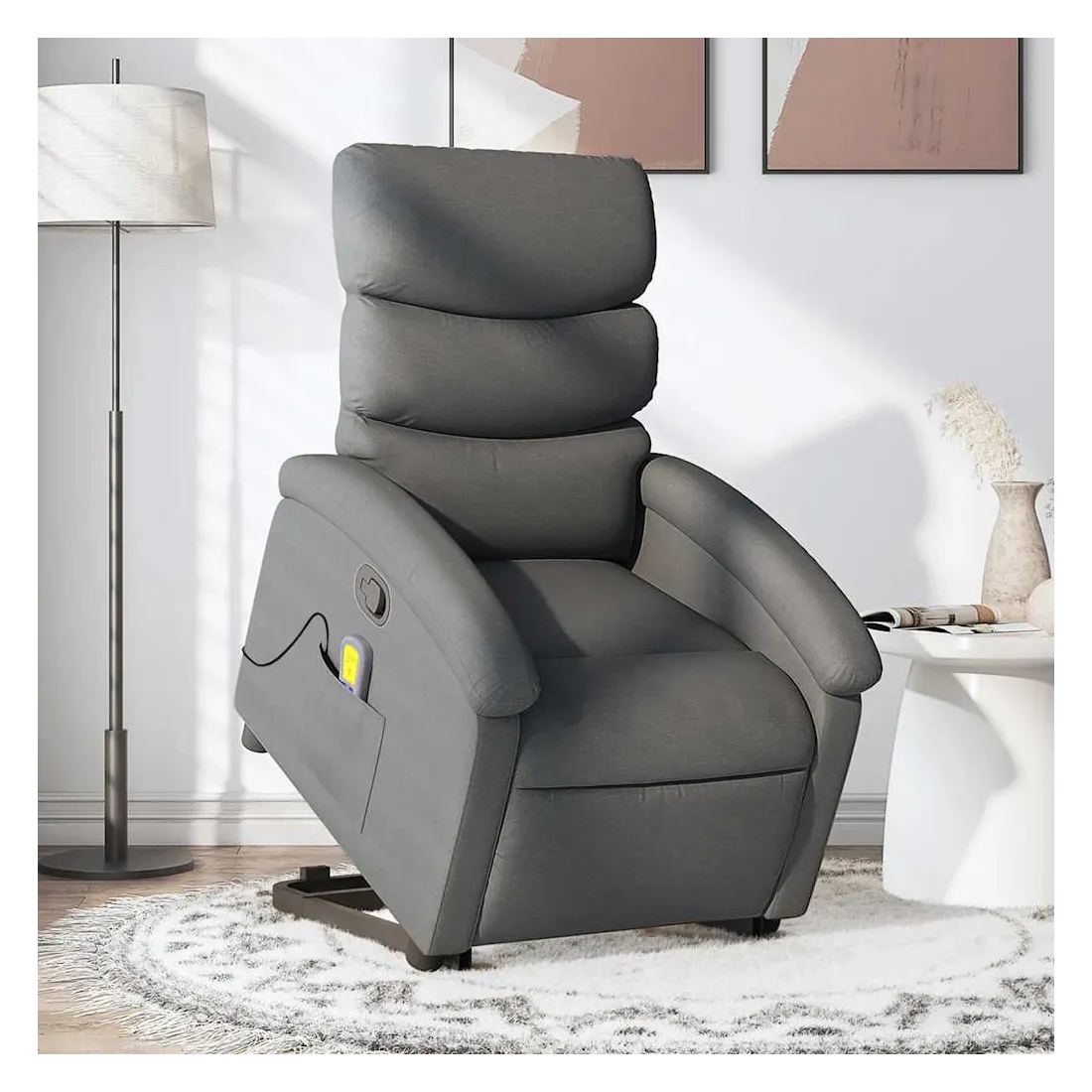 Asseyez-vous et détendez-vous dans ce fauteuil inclinable de massage très confortable ! Fonction de levage électrique : ce fauteuil inclinable pour personnes âgées est équipé d'un moteur électrique pour la fonction de levage. Grâce à la fonction qui pousse toute la chaise vers le haut, vous pouvez facilement vous tenir debout sans stresser votre dos et vos genoux en appuyant simplement sur le bouton.Fonction d'inclinaison manuelle : ce fauteuil inclinable est doté d'une poignée du côté droit. Vous pouvez régler manuellement le repose-pieds et le dossier dans n'importe quelle position selon votre confort en tirant simplement sur la poignée. Cette fonction permet une inclinaison maximale de 135 degrés. De plus, le dossier peut revenir rapidement à sa position d'origine en tirant simplement sur la poignée.Fonction de vibration : les 6 points de massage vous permettent de faire l'expérience d'un massage mieux ciblé. De plus, la télécommande incluse vous permet de choisir différents programmes de massage. La fonction de massage est alimentée par le connecteur USB qui nécessite une source d'alimentation USB certifiée de 5 V (non fournie).Expérience d'assise confortable : le siège, le dossier et les larges accoudoirs bien rembourrés recouverts de tissu procurent une sensation confortable et chaleureuse, vous permettant de vous sentir enveloppé lorsque vous êtes assis. Le tissu présente un aspect simple et épuré et est respirant et durable.Poche latérale pratique : ce fauteuil est doté d'une poche latérale pour ranger votre télécommande ou garder vos objets essentiels à portée de main.Cadre solide et stable : le cadre en bois et en métal offre une structure solide et une grande stabilité. Ce fauteuil inclinable est confortable et durable.