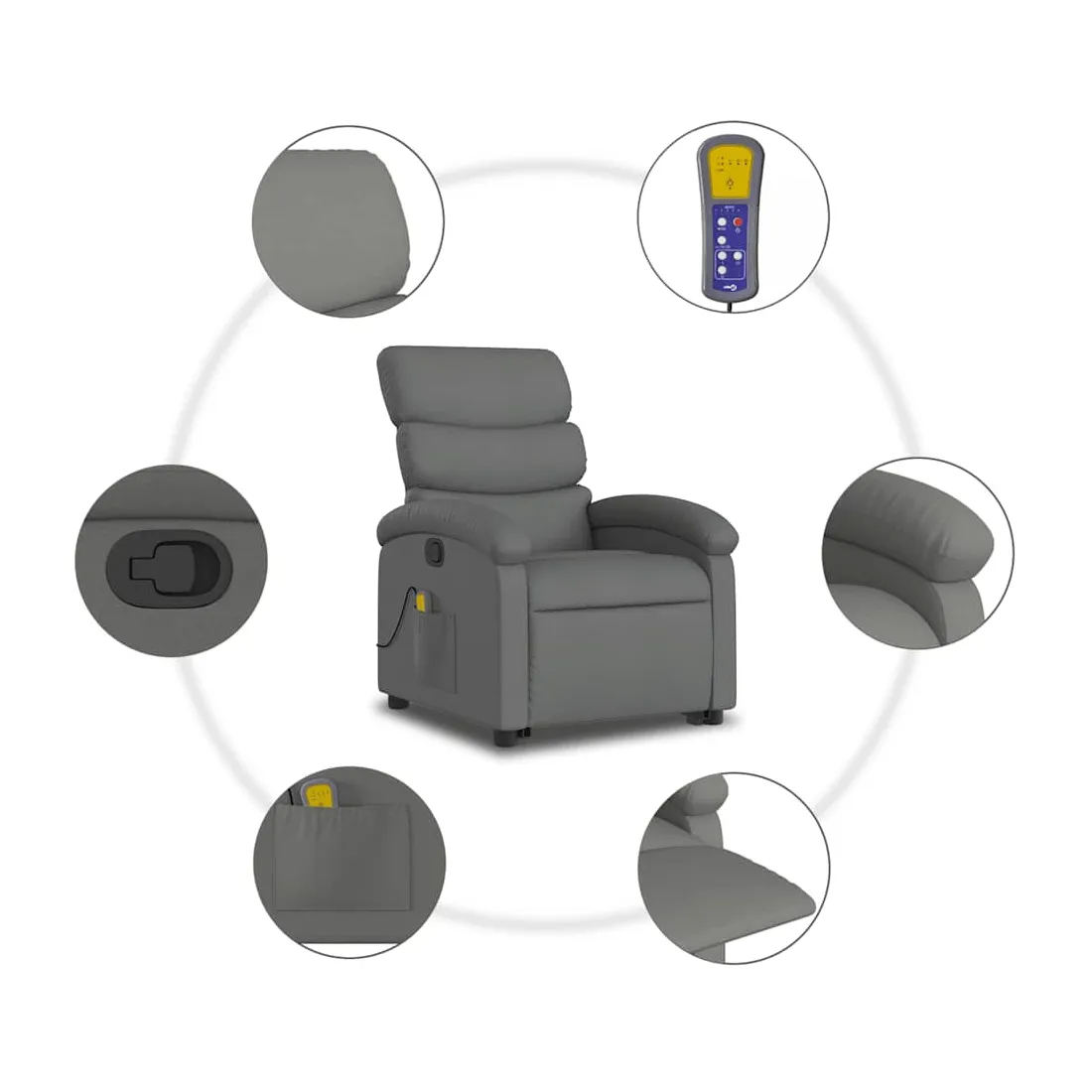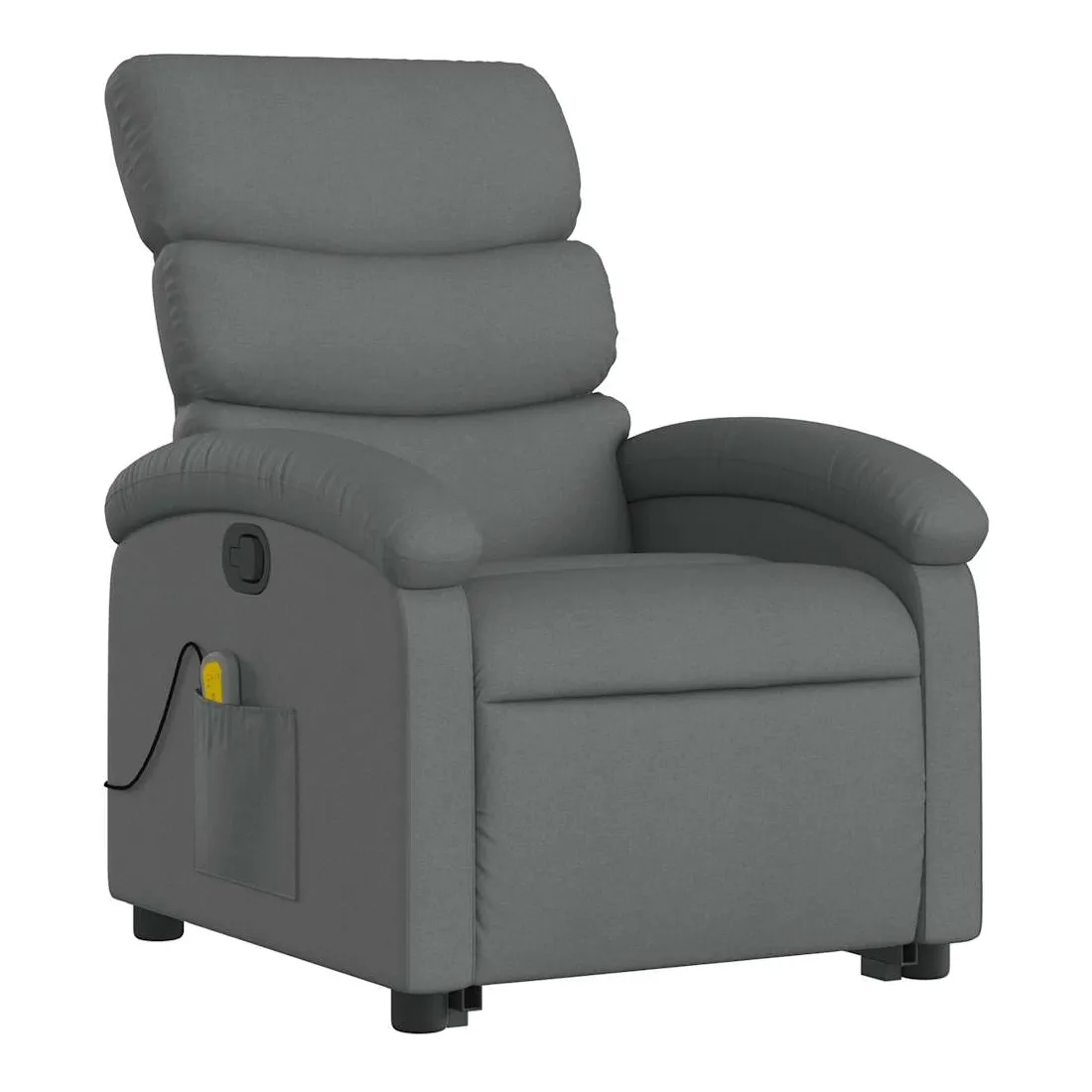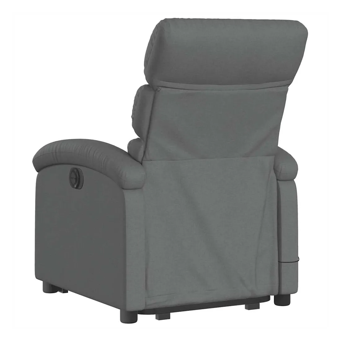 Asseyez-vous et détendez-vous dans ce fauteuil inclinable de massage très confortable ! Fonction de levage électrique : ce fauteuil inclinable pour personnes âgées est équipé d'un moteur électrique pour la fonction de levage. Grâce à la fonction qui pousse toute la chaise vers le haut, vous pouvez facilement vous tenir debout sans stresser votre dos et vos genoux en appuyant simplement sur le bouton.Fonction d'inclinaison manuelle : ce fauteuil inclinable est doté d'une poignée du côté droit. Vous pouvez régler manuellement le repose-pieds et le dossier dans n'importe quelle position selon votre confort en tirant simplement sur la poignée. Cette fonction permet une inclinaison maximale de 135 degrés. De plus, le dossier peut revenir rapidement à sa position d'origine en tirant simplement sur la poignée.Fonction de vibration : les 6 points de massage vous permettent de faire l'expérience d'un massage mieux ciblé. De plus, la télécommande incluse vous permet de choisir différents programmes de massage. La fonction de massage est alimentée par le connecteur USB qui nécessite une source d'alimentation USB certifiée de 5 V (non fournie).Expérience d'assise confortable : le siège, le dossier et les larges accoudoirs bien rembourrés recouverts de tissu procurent une sensation confortable et chaleureuse, vous permettant de vous sentir enveloppé lorsque vous êtes assis. Le tissu présente un aspect simple et épuré et est respirant et durable.Poche latérale pratique : ce fauteuil est doté d'une poche latérale pour ranger votre télécommande ou garder vos objets essentiels à portée de main.Cadre solide et stable : le cadre en bois et en métal offre une structure solide et une grande stabilité. Ce fauteuil inclinable est confortable et durable.