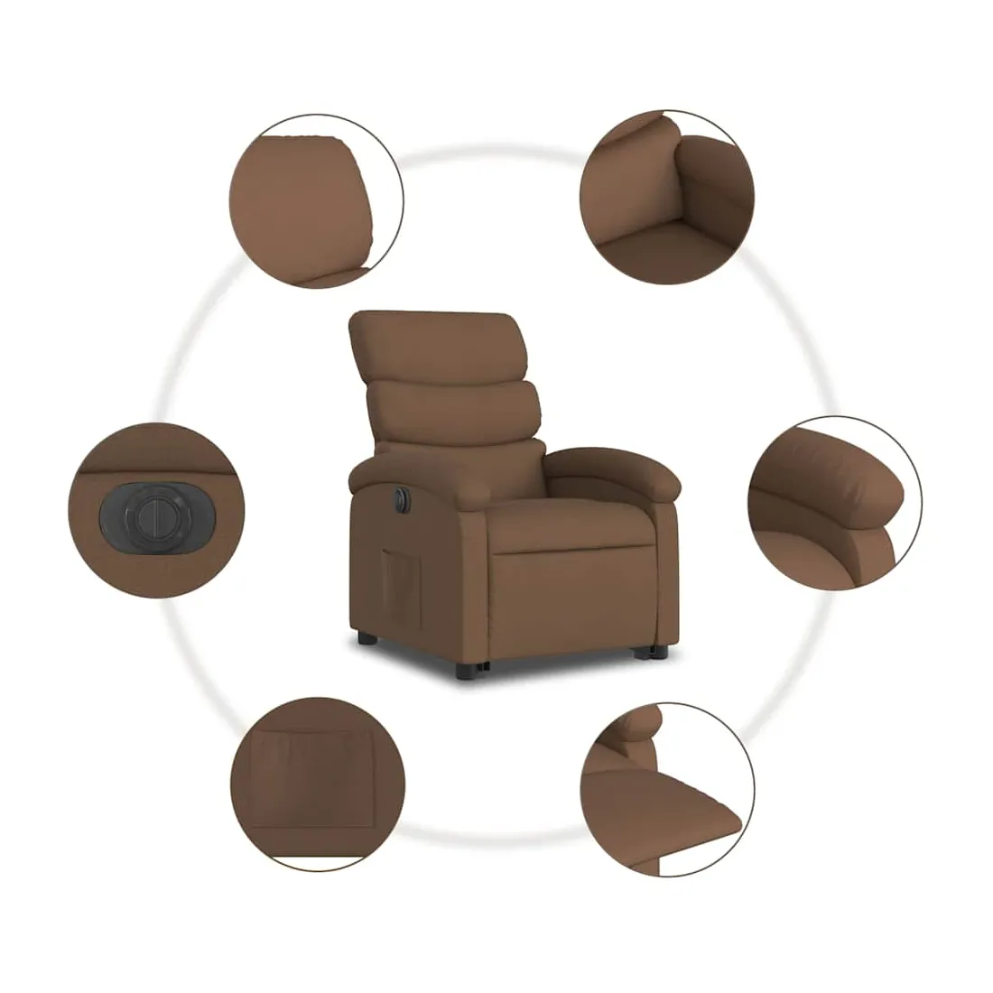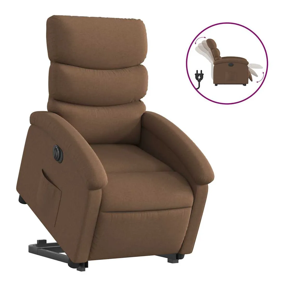 Asseyez-vous et détendez-vous dans ce fauteuil inclinable électrique très confortable ! Fonction de levage électrique : ce fauteuil inclinable pour personnes âgées est équipé d'un moteur électrique pour la fonction de levage. Grâce à la fonction qui pousse toute la chaise vers le haut, vous pouvez facilement vous tenir debout sans stresser votre dos et vos genoux en appuyant simplement sur le bouton.Fonction d'inclinaison électrique : ce fauteuil inclinable est également équipé d'un moteur électrique qui permet de régler automatiquement le repose-pied et le dossier dans n'importe quelle position, selon votre confort, en appuyant simplement sur le bouton situé sur le côté du fauteuil. Cette fonction permet une inclinaison maximale de 135 degrés. En outre, le dossier peut revenir automatiquement à sa position d'origine par une simple pression sur le bouton.Expérience d'assise confortable : le siège, le dossier et les larges accoudoirs bien rembourrés recouverts de tissu procurent une sensation confortable et chaleureuse, vous permettant de vous sentir enveloppé lorsque vous êtes assis. Le tissu présente un aspect simple et épuré et est respirant et durable.Poche latérale pratique : ce fauteuil est doté d'une poche latérale pour vous permettre de garder vos objets essentiels à portée de main.Cadre solide et stable : le cadre en bois et en métal offre une structure solide et une grande stabilité. Ce fauteuil inclinable est confortable et durable.