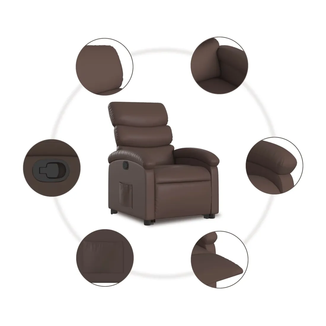 Asseyez-vous et détendez-vous dans ce fauteuil inclinable très confortable ! Fonction de levage électrique : ce fauteuil inclinable pour personnes âgées est équipé d'un moteur électrique pour la fonction de levage. Grâce à la fonction qui pousse toute la chaise vers le haut, vous pouvez facilement vous tenir debout sans stresser votre dos et vos genoux en appuyant simplement sur le bouton.Fonction d'inclinaison manuelle : ce fauteuil inclinable est doté d'une poignée du côté droit. Vous pouvez régler manuellement le repose-pieds et le dossier dans n'importe quelle position selon votre confort en tirant simplement sur la poignée. Cette fonction permet une inclinaison maximale de 135 degrés. De plus, le dossier peut revenir rapidement à sa position d'origine en tirant simplement sur la poignée.Expérience de siège confortable : le siège, le dossier et les larges accoudoirs rembourrés épais recouverts de similicuir procurent une sensation confortable, vous faisant vous sentir enlacé lorsque vous êtes assis. Le similicuir est un matériau très résistant. Il est résistant aux taches, ce qui le rend facile à nettoyer avec un chiffon humide. La surface lisse donne également un aspect luxueux et la beauté du cuir véritable.Poche latérale pratique : ce fauteuil est doté d'une poche latérale pour vous permettre de garder vos objets essentiels à portée de main.Cadre solide et stable : le cadre en bois et en métal offre une structure solide et une grande stabilité. Ce fauteuil inclinable est confortable et durable.