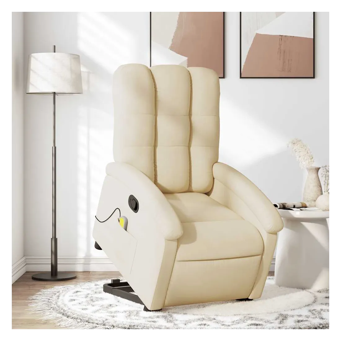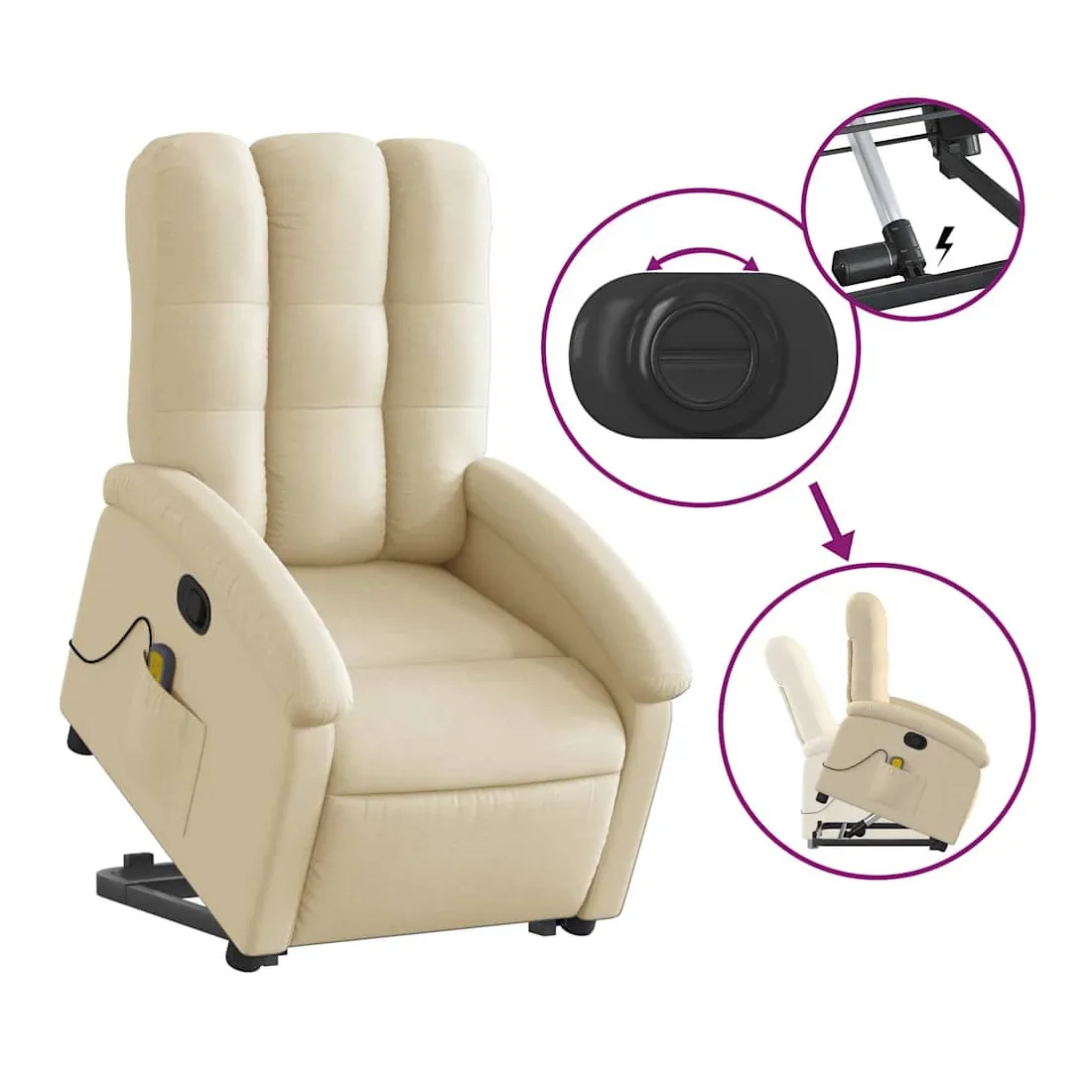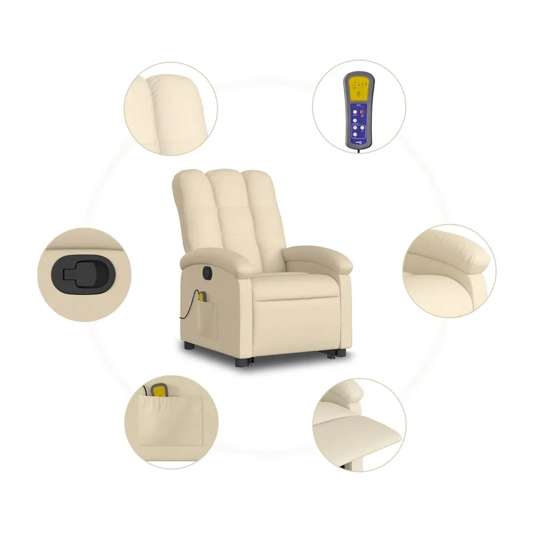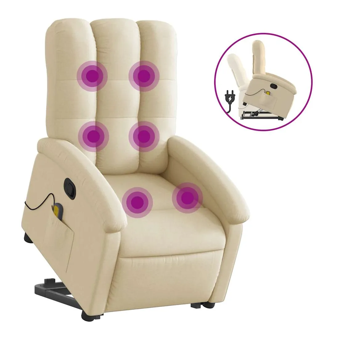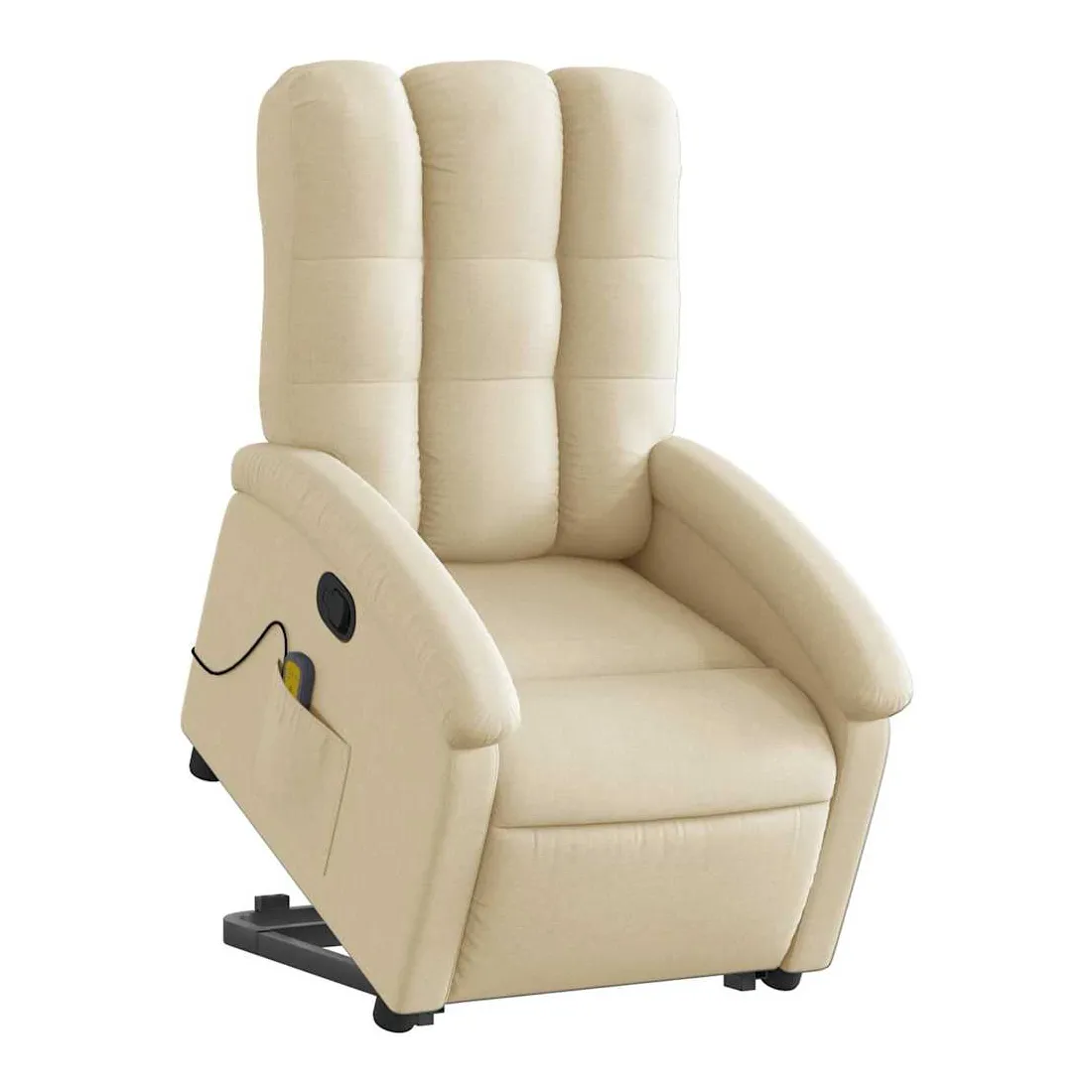 Asseyez-vous et détendez-vous dans ce fauteuil inclinable de massage très confortable ! Fonction de levage électrique : ce fauteuil inclinable pour personnes âgées est équipé d'un moteur électrique pour la fonction de levage. Grâce à la fonction qui pousse toute la chaise vers le haut, vous pouvez facilement vous tenir debout sans stresser votre dos et vos genoux en appuyant simplement sur le bouton.Fonction d'inclinaison manuelle : ce fauteuil inclinable est doté d'une poignée du côté droit. Vous pouvez régler manuellement le repose-pieds et le dossier dans n'importe quelle position selon votre confort en tirant simplement sur la poignée. Cette fonction permet une inclinaison maximale de 135 degrés. De plus, le dossier peut revenir rapidement à sa position d'origine en tirant simplement sur la poignée.Fonction de vibration : les 6 points de massage vous permettent de faire l'expérience d'un massage mieux ciblé. De plus, la télécommande incluse vous permet de choisir différents programmes de massage. La fonction de massage est alimentée par le connecteur USB qui nécessite une source d'alimentation USB certifiée de 5 V (non fournie).Expérience d'assise confortable : le siège, le dossier et les larges accoudoirs bien rembourrés recouverts de tissu procurent une sensation confortable et chaleureuse, vous permettant de vous sentir enveloppé lorsque vous êtes assis. Le tissu présente un aspect simple et épuré et est respirant et durable.Poche latérale pratique : ce fauteuil est doté d'une poche latérale pour ranger votre télécommande ou garder vos objets essentiels à portée de main.Cadre solide et stable : le cadre en bois et en métal offre une structure solide et une grande stabilité. Ce fauteuil inclinable est confortable et durable.