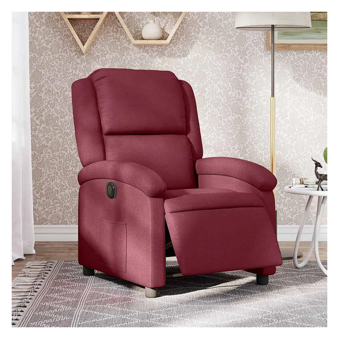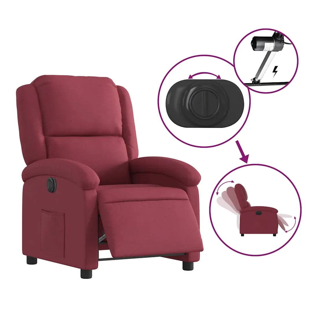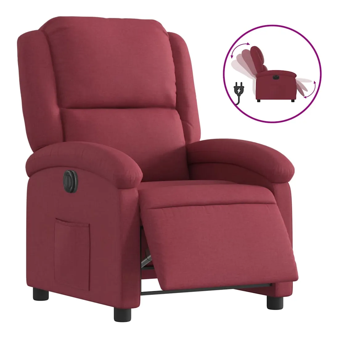Asseyez-vous et détendez-vous dans ce fauteuil inclinable électrique très confortable ! Fonction d'inclinaison électrique : ce fauteuil inclinable est équipé d'un moteur électrique qui permet de régler automatiquement le repose-pied et le dossier dans n'importe quelle position, selon votre confort, en appuyant simplement sur le bouton situé sur le côté du fauteuil. Cette fonction permet une inclinaison maximale de 135 degrés. En outre, le dossier peut revenir automatiquement à sa position d'origine par une simple pression sur le bouton.Expérience d'assise confortable : le siège, le dossier et les larges accoudoirs bien rembourrés recouverts de tissu procurent une sensation confortable et chaleureuse, vous permettant de vous sentir enveloppé lorsque vous êtes assis. Le tissu présente un aspect simple et épuré et est respirant et durable.Poche latérale pratique : ce fauteuil est doté d'une poche latérale pour vous permettre de garder vos objets essentiels à portée de main.Cadre solide et stable : le cadre en bois et en métal offre une structure solide et une grande stabilité. Ce fauteuil inclinable est confortable et durable.