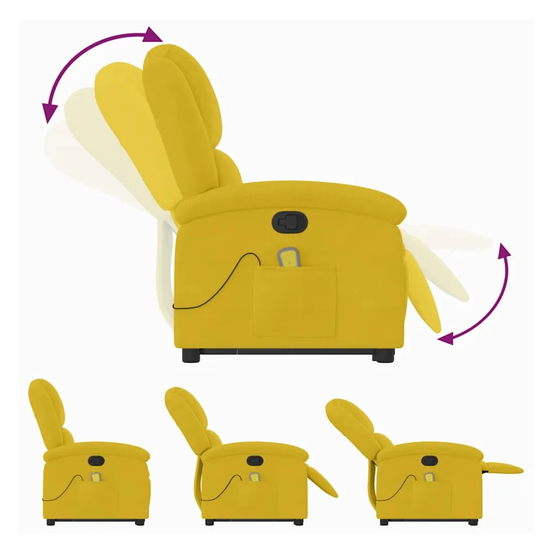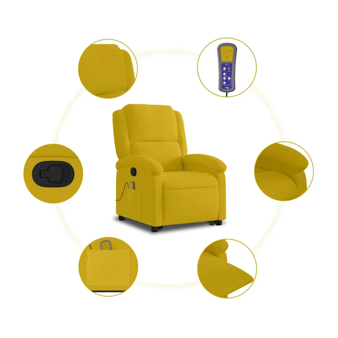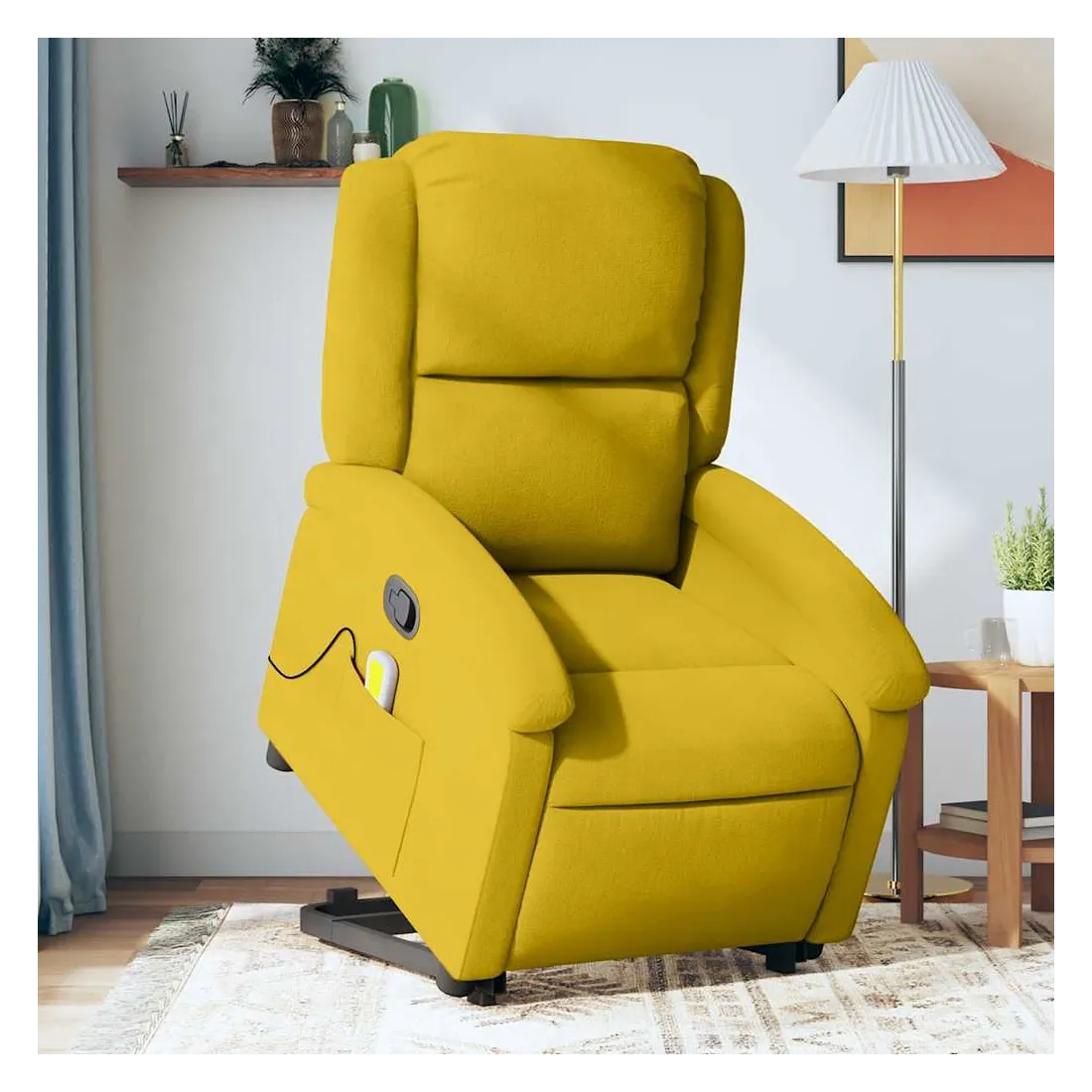 Asseyez-vous et détendez-vous dans ce fauteuil inclinable de massage très confortable ! Fonction de levage électrique : ce fauteuil inclinable pour personnes âgées est équipé d'un moteur électrique pour la fonction de levage. Grâce à la fonction qui pousse toute la chaise vers le haut, vous pouvez facilement vous tenir debout sans stresser votre dos et vos genoux en appuyant simplement sur le bouton.Fonction d'inclinaison manuelle : ce fauteuil inclinable est doté d'une poignée du côté droit. Vous pouvez régler manuellement le repose-pieds et le dossier dans n'importe quelle position selon votre confort en tirant simplement sur la poignée. Cette fonction permet une inclinaison maximale de 135 degrés. De plus, le dossier peut revenir rapidement à sa position d'origine en tirant simplement sur la poignée.Fonction de vibration : les 6 points de massage vous permettent de faire l'expérience d'un massage mieux ciblé. De plus, la télécommande incluse vous permet de choisir différents programmes de massage. La fonction de massage est alimentée par le connecteur USB qui nécessite une source d'alimentation USB certifiée de 5 V (non fournie).Expérience d'assise confortable : le siège, le dossier et les larges accoudoirs rembourrés épais recouverts de velours procurent une sensation confortable et chaleureuse, vous faisant vous sentir enlacé lorsque vous êtes assis. Le velours est un tissu doux et confortable qui est agréable sur la peau.Poche latérale pratique : ce fauteuil est doté d'une poche latérale pour ranger votre télécommande ou garder vos objets essentiels à portée de main.Cadre solide et stable : le cadre en bois et en métal offre une structure solide et une grande stabilité. Ce fauteuil inclinable est confortable et durable.