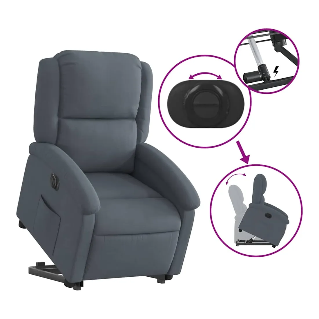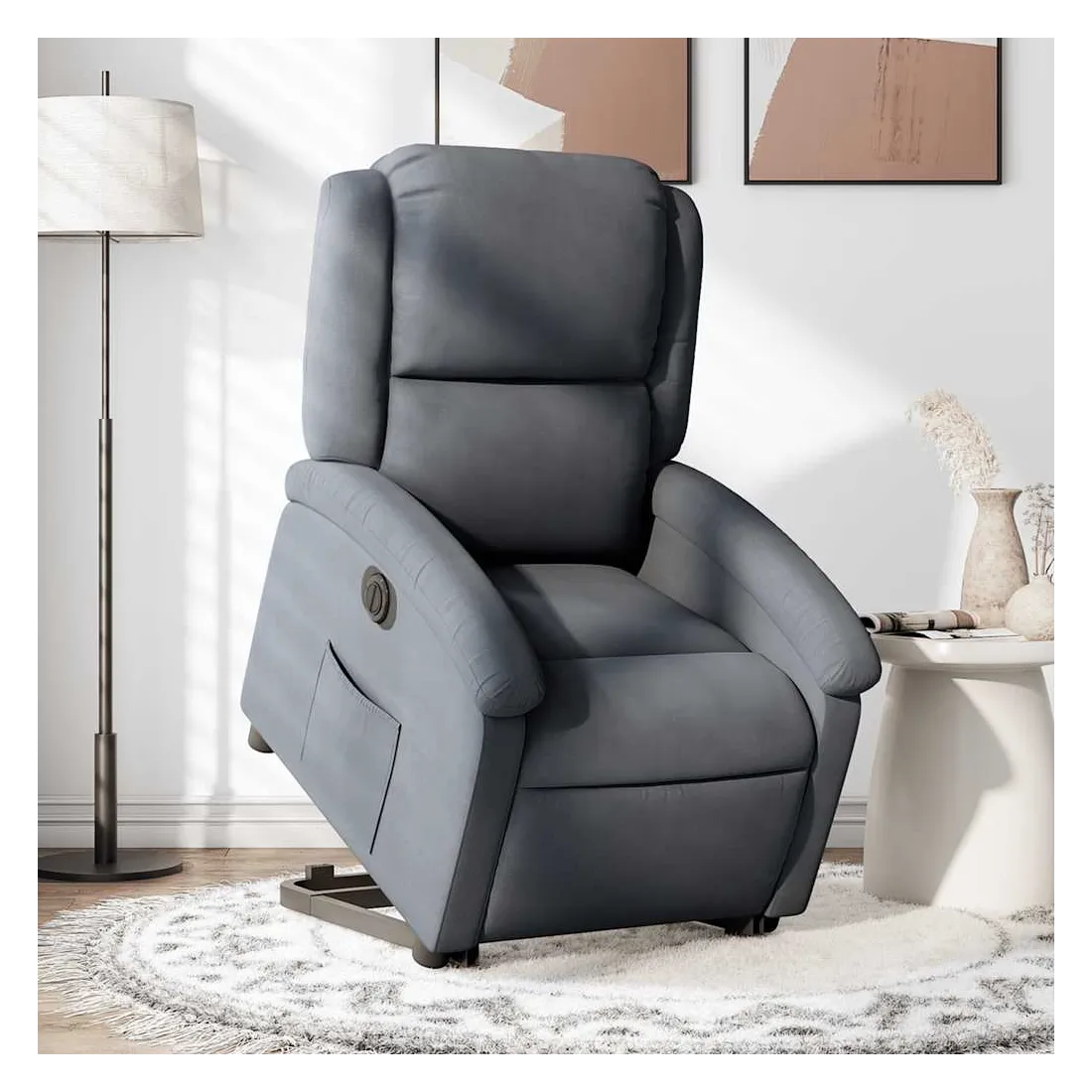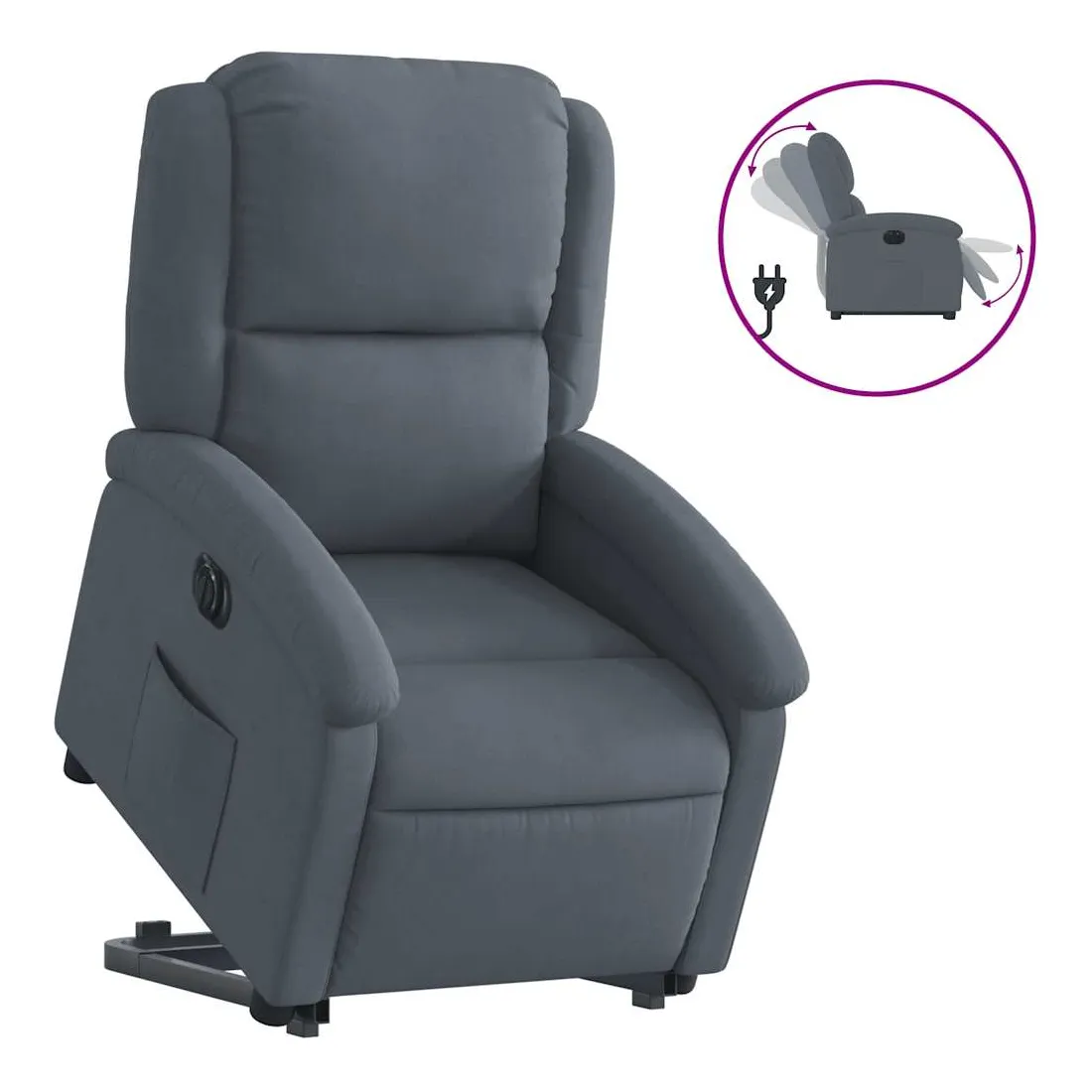 Asseyez-vous et détendez-vous dans ce fauteuil inclinable électrique très confortable ! Fonction de levage électrique : ce fauteuil inclinable pour personnes âgées est équipé d'un moteur électrique pour la fonction de levage. Grâce à la fonction qui pousse toute la chaise vers le haut, vous pouvez facilement vous tenir debout sans stresser votre dos et vos genoux en appuyant simplement sur le bouton.Fonction d'inclinaison électrique : ce fauteuil inclinable est également équipé d'un moteur électrique qui permet de régler automatiquement le repose-pied et le dossier dans n'importe quelle position, selon votre confort, en appuyant simplement sur le bouton situé sur le côté du fauteuil. Cette fonction permet une inclinaison maximale de 135 degrés. En outre, le dossier peut revenir automatiquement à sa position d'origine par une simple pression sur le bouton.Expérience d'assise confortable : le siège, le dossier et les larges accoudoirs rembourrés épais recouverts de velours procurent une sensation confortable et chaleureuse, vous faisant vous sentir enlacé lorsque vous êtes assis. Le velours est un tissu doux et confortable qui est agréable sur la peau.Poche latérale pratique : ce fauteuil est doté d'une poche latérale pour vous permettre de garder vos objets essentiels à portée de main.Cadre solide et stable : le cadre en bois et en métal offre une structure solide et une grande stabilité. Ce fauteuil inclinable est confortable et durable.