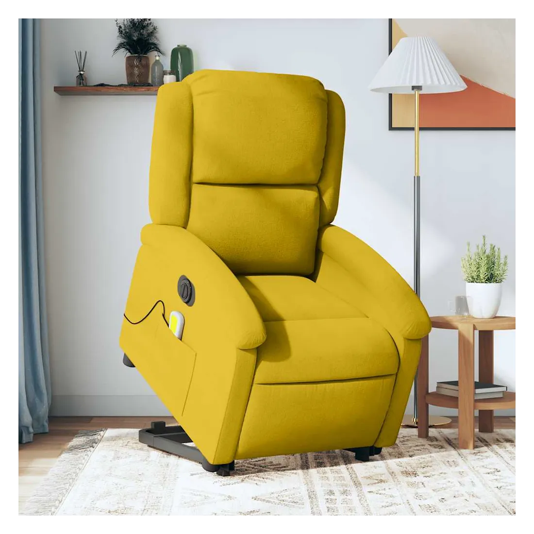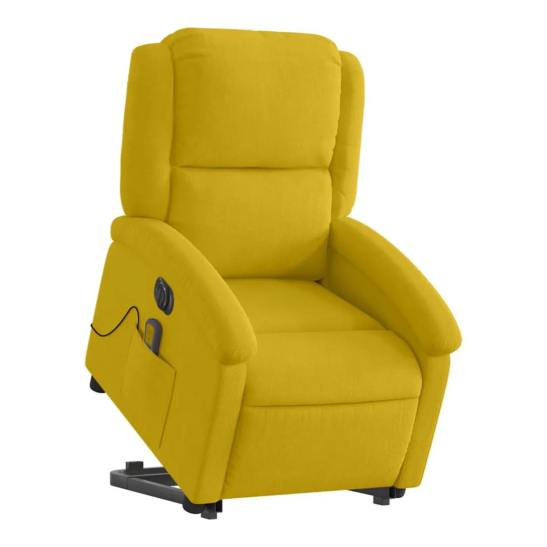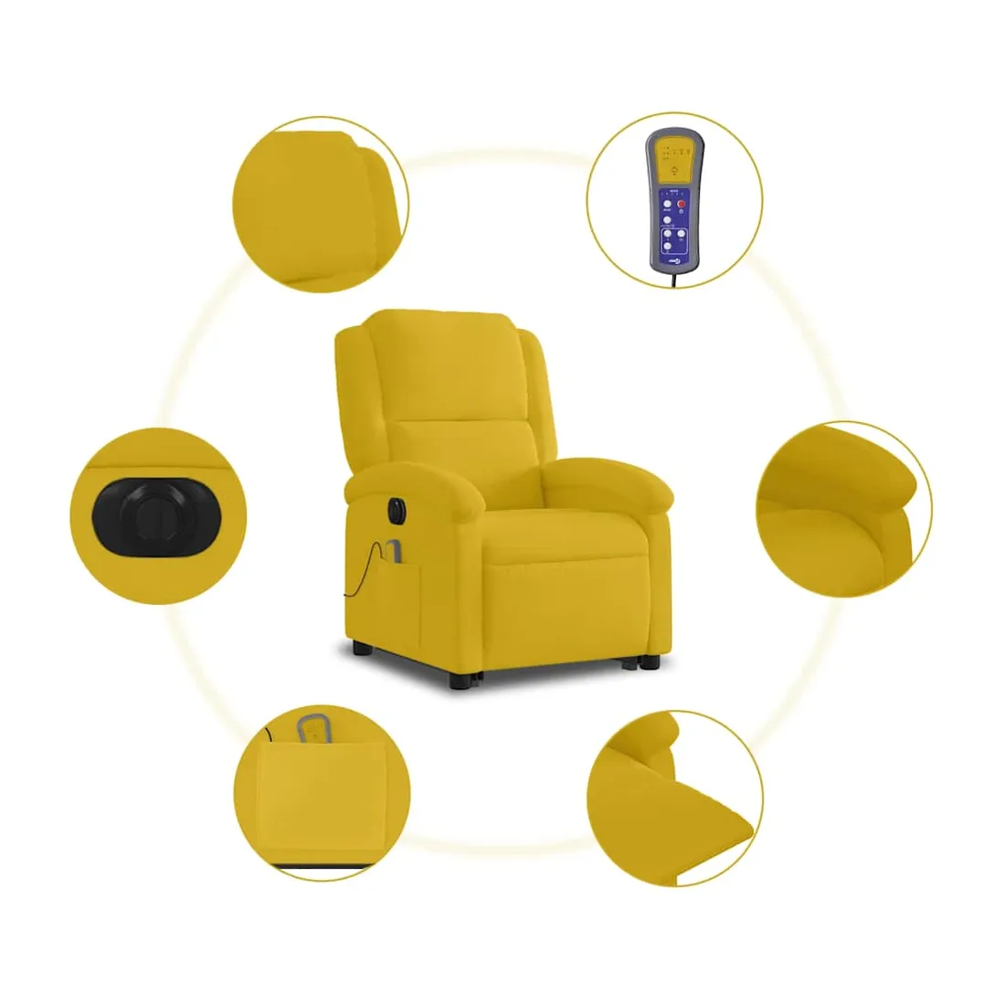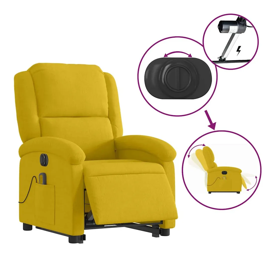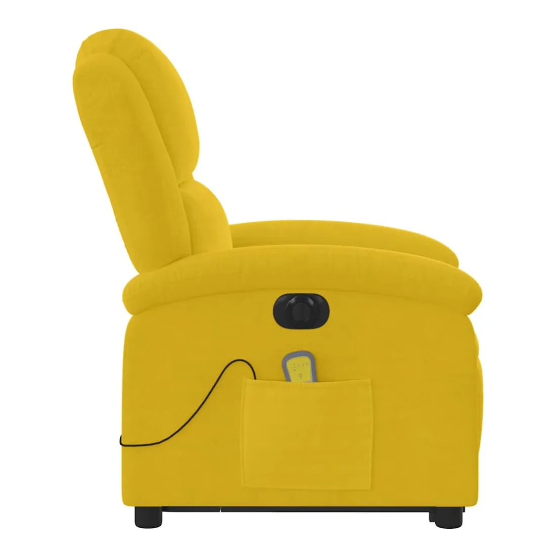Asseyez-vous et détendez-vous dans ce fauteuil inclinable de massage électrique très confortable ! Fonction de levage électrique : ce fauteuil inclinable pour personnes âgées est équipé d'un moteur électrique pour la fonction de levage. Grâce à la fonction qui pousse toute la chaise vers le haut, vous pouvez facilement vous tenir debout sans stresser votre dos et vos genoux en appuyant simplement sur le bouton.Fonction d'inclinaison électrique : ce fauteuil inclinable est également équipé d'un moteur électrique qui permet de régler automatiquement le repose-pied et le dossier dans n'importe quelle position, selon votre confort, en appuyant simplement sur le bouton situé sur le côté du fauteuil. Cette fonction permet une inclinaison maximale de 135 degrés. En outre, le dossier peut revenir automatiquement à sa position d'origine par une simple pression sur le bouton.Fonction de vibration : les 6 points de massage vous permettent de faire l'expérience d'un massage mieux ciblé. De plus, la télécommande incluse vous permet de choisir différents programmes de massage. La fonction de massage est alimentée par le connecteur USB qui nécessite une source d'alimentation USB certifiée de 5 V (non fournie).Expérience d'assise confortable : le siège, le dossier et les larges accoudoirs rembourrés épais recouverts de velours procurent une sensation confortable et chaleureuse, vous faisant vous sentir enlacé lorsque vous êtes assis. Le velours est un tissu doux et confortable qui est agréable sur la peau.Poche latérale pratique : ce fauteuil est doté d'une poche latérale pour ranger votre télécommande ou garder vos objets essentiels à portée de main.Cadre solide et stable : le cadre en bois et en métal offre une structure solide et une grande stabilité. Ce fauteuil inclinable est confortable et durable.