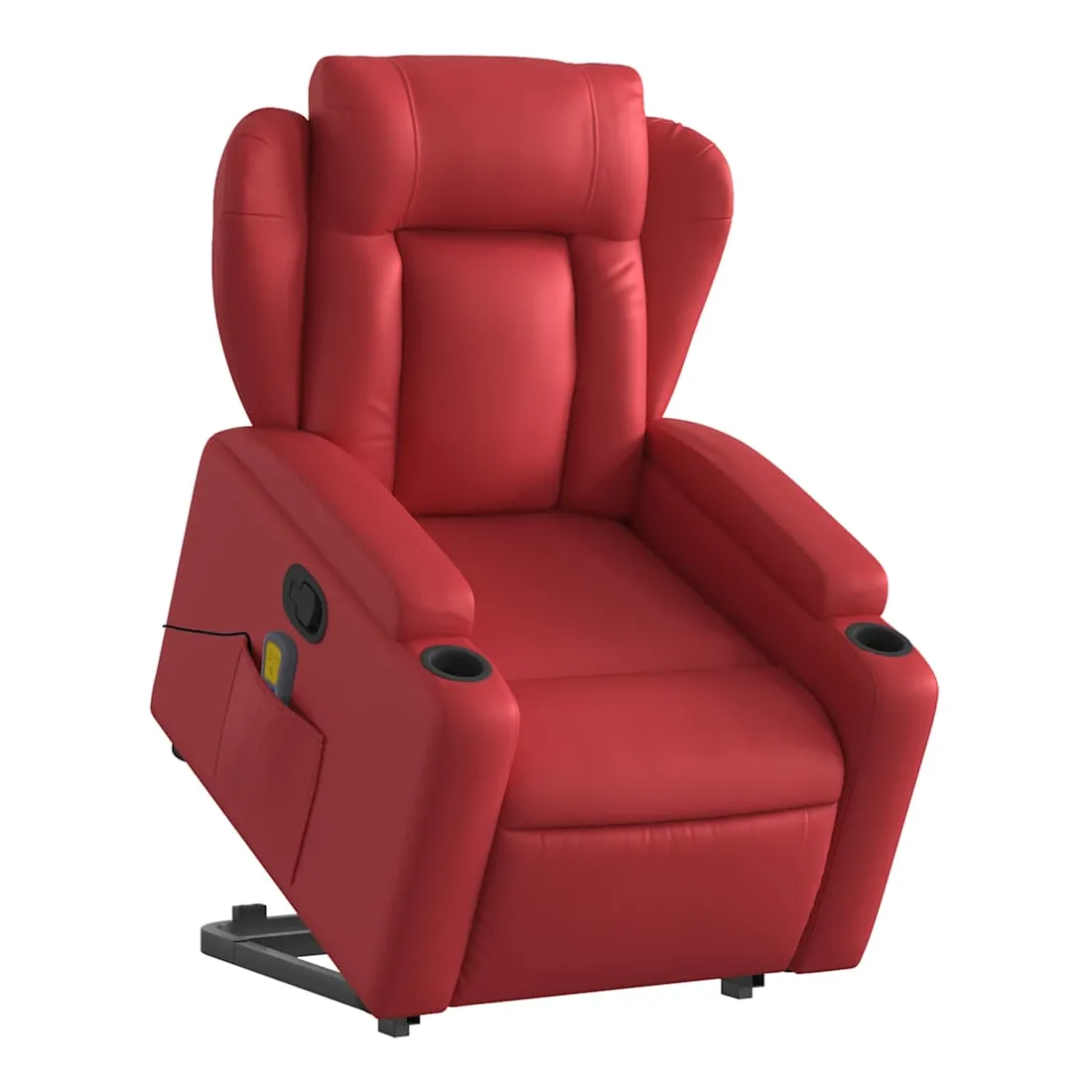 Asseyez-vous et détendez-vous dans ce fauteuil inclinable de massage très confortable ! Fonction de levage électrique : ce fauteuil inclinable pour personnes âgées est équipé d'un moteur électrique pour la fonction de levage. Grâce à la fonction qui pousse toute la chaise vers le haut, vous pouvez facilement vous tenir debout sans stresser votre dos et vos genoux en appuyant simplement sur le bouton.Fonction d'inclinaison manuelle : ce fauteuil inclinable est doté d'une poignée du côté droit. Vous pouvez régler manuellement le repose-pieds et le dossier dans n'importe quelle position selon votre confort en tirant simplement sur la poignée. Cette fonction permet une inclinaison maximale de 135 degrés. De plus, le dossier peut revenir rapidement à sa position d'origine en tirant simplement sur la poignée.Fonction de vibration : les 6 points de massage vous permettent de faire l'expérience d'un massage mieux ciblé. De plus, la télécommande incluse vous permet de choisir différents programmes de massage. La fonction de massage est alimentée par le connecteur USB qui nécessite une source d'alimentation USB certifiée de 5 V (non fournie).Expérience de siège confortable : le siège, le dossier et les larges accoudoirs rembourrés épais recouverts de similicuir procurent une sensation confortable, vous faisant vous sentir enlacé lorsque vous êtes assis. Le similicuir est un matériau très résistant. Il est résistant aux taches, ce qui le rend facile à nettoyer avec un chiffon humide. La surface lisse donne également un aspect luxueux et la beauté du cuir véritable.Porte-gobelets et poche latérale pratiques : ce fauteuil dispose de deux porte-gobelets pratiques pour vos boissons et d'une poche latérale pour garder vos objets essentiels à portée de main.Cadre solide et stable : le cadre en bois et en métal offre une structure solide et une grande stabilité. Ce fauteuil inclinable est confortable et durable.