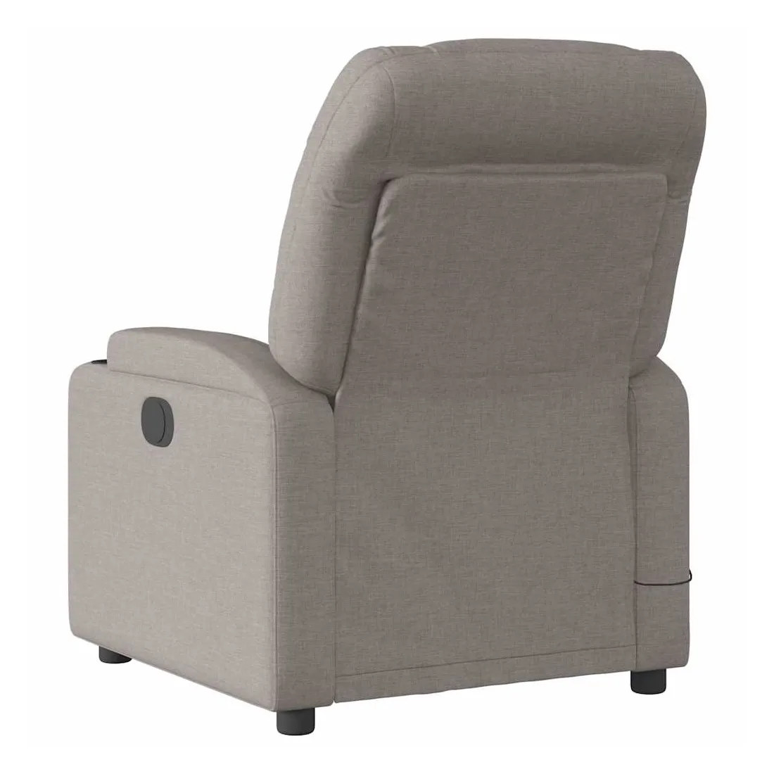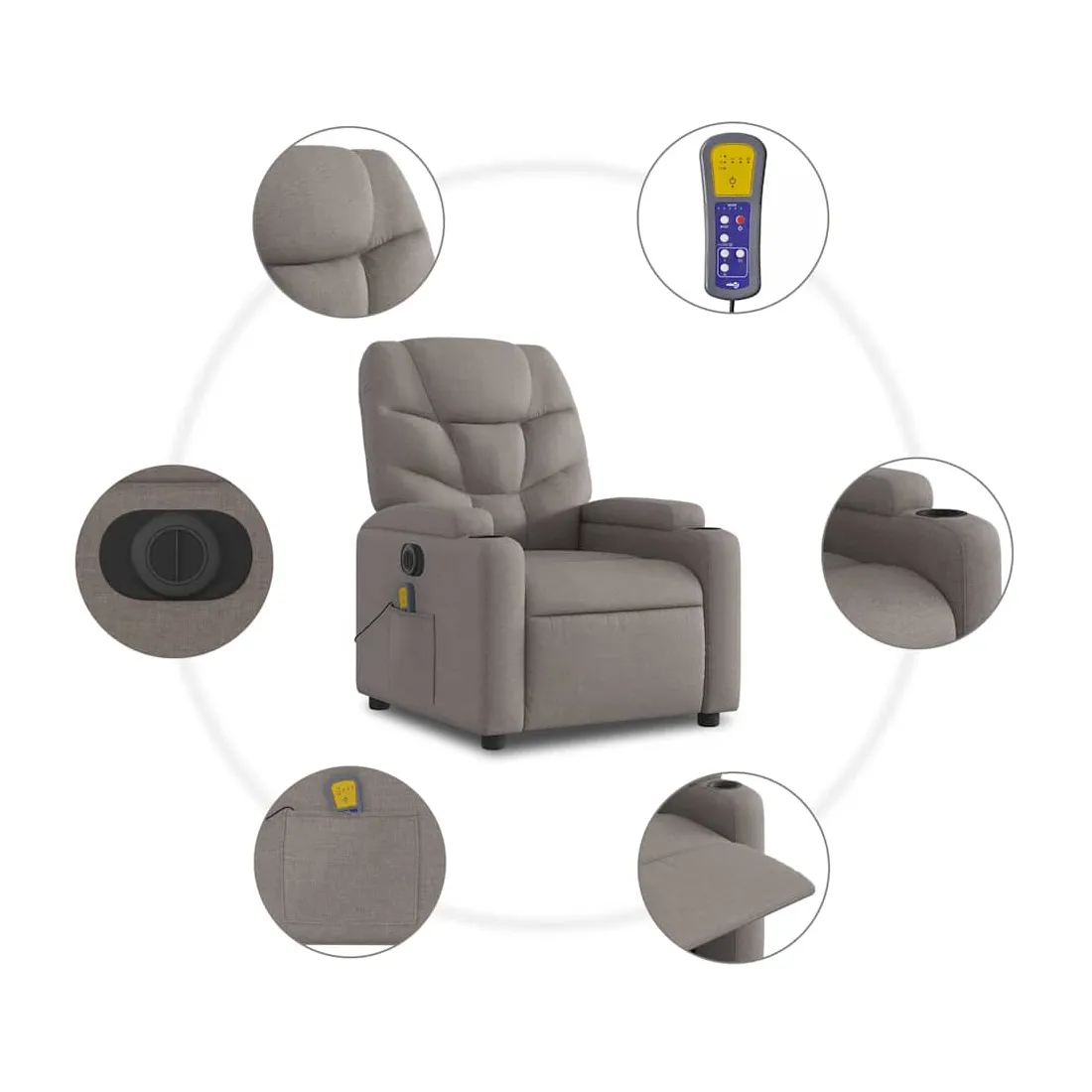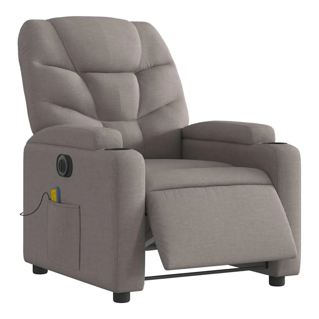 Asseyez-vous et détendez-vous dans ce fauteuil inclinable de massage électrique très confortable ! Fonction d'inclinaison électrique : ce fauteuil inclinable est équipé d'un moteur électrique qui permet de régler automatiquement le repose-pied et le dossier dans n'importe quelle position, selon votre confort, en appuyant simplement sur le bouton situé sur le côté du fauteuil. Cette fonction permet une inclinaison maximale de 135 degrés. En outre, le dossier peut revenir automatiquement à sa position d'origine par une simple pression sur le bouton.Fonction de vibration : les 6 points de massage vous permettent de faire l'expérience d'un massage mieux ciblé. De plus, la télécommande incluse vous permet de choisir différents programmes de massage. La fonction de massage est alimentée par le connecteur USB qui nécessite une source d'alimentation USB certifiée de 5 V (non fournie).Expérience d'assise confortable : le siège, le dossier et les larges accoudoirs bien rembourrés recouverts de tissu procurent une sensation confortable et chaleureuse, vous permettant de vous sentir enveloppé lorsque vous êtes assis. Le tissu présente un aspect simple et épuré et est respirant et durable.Porte-gobelets et poche latérale pratiques : ce fauteuil dispose de deux porte-gobelets pratiques pour vos boissons et d'une poche latérale pour garder vos objets essentiels à portée de main.Cadre solide et stable : le cadre en bois et en métal offre une structure solide et une grande stabilité. Ce fauteuil inclinable est confortable et durable.