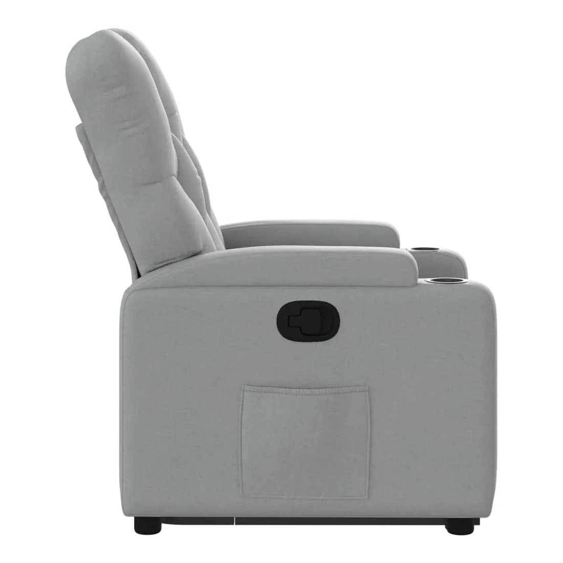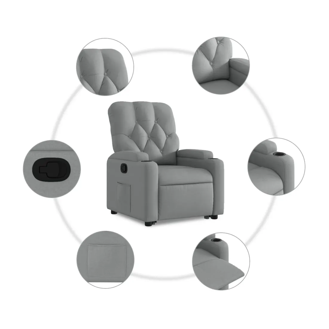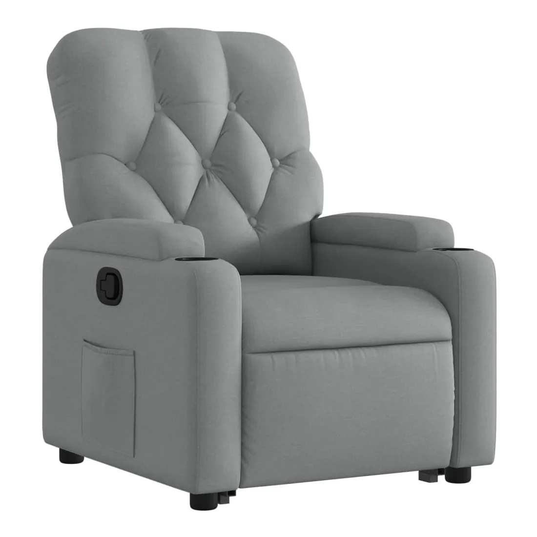 Asseyez-vous et détendez-vous dans ce fauteuil inclinable très confortable ! Fonction de levage électrique : ce fauteuil inclinable pour personnes âgées est équipé d'un moteur électrique pour la fonction de levage. Grâce à la fonction qui pousse toute la chaise vers le haut, vous pouvez facilement vous tenir debout sans stresser votre dos et vos genoux en appuyant simplement sur le bouton.Fonction d'inclinaison manuelle : ce fauteuil inclinable est doté d'une poignée du côté droit. Vous pouvez régler manuellement le repose-pieds et le dossier dans n'importe quelle position selon votre confort en tirant simplement sur la poignée. Cette fonction permet une inclinaison maximale de 135 degrés. De plus, le dossier peut revenir rapidement à sa position d'origine en tirant simplement sur la poignée.Expérience d'assise confortable : le siège, le dossier et les larges accoudoirs bien rembourrés recouverts de tissu procurent une sensation confortable et chaleureuse, vous permettant de vous sentir enveloppé lorsque vous êtes assis. Le tissu présente un aspect simple et épuré et est respirant et durable.Porte-gobelets et poche latérale pratiques : ce fauteuil dispose de deux porte-gobelets pratiques pour vos boissons et d'une poche latérale pour garder vos objets essentiels à portée de main.Cadre solide et stable : le cadre en bois et en métal offre une structure solide et une grande stabilité. Ce fauteuil inclinable est confortable et durable.