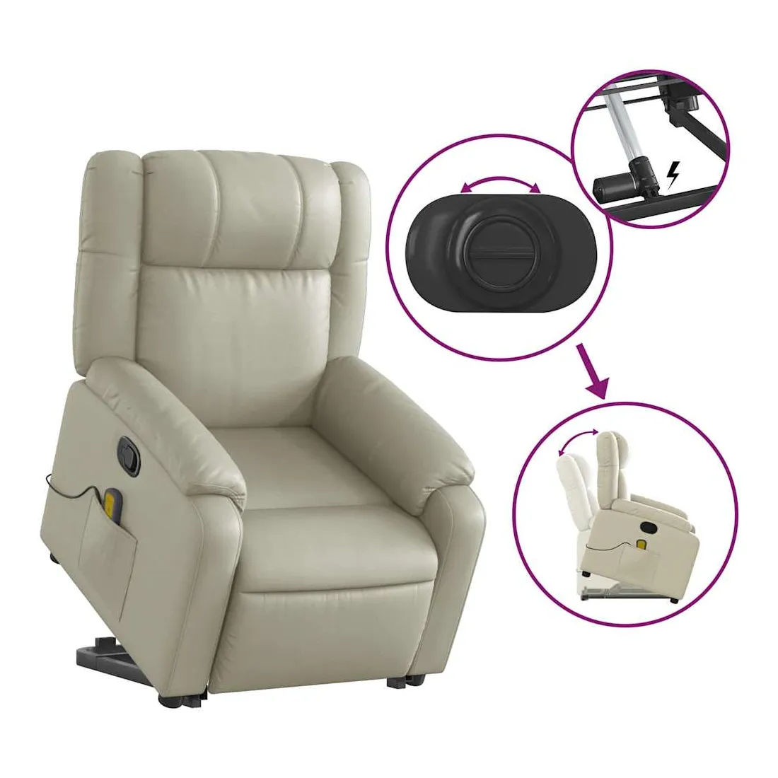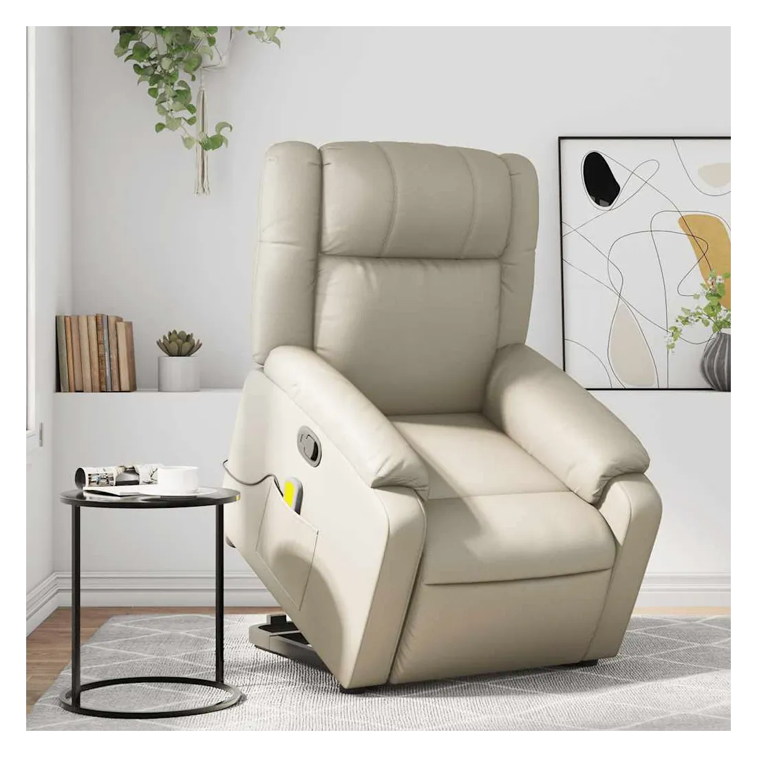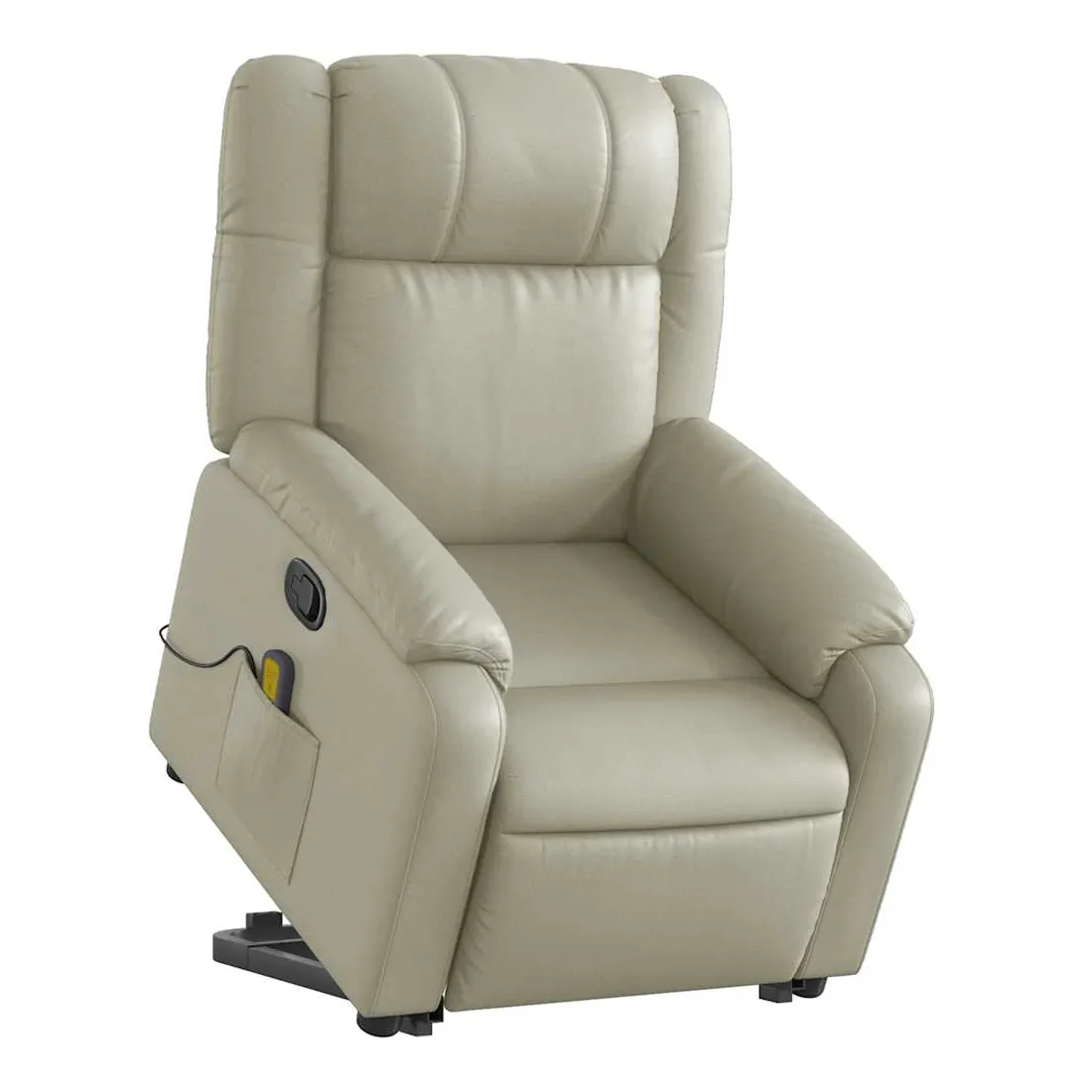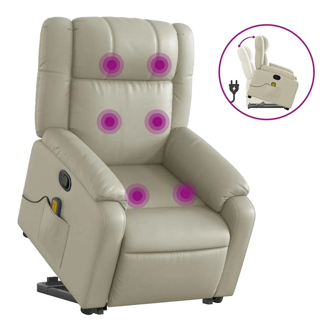 Asseyez-vous et détendez-vous dans ce fauteuil inclinable de massage très confortable ! Fonction de levage électrique : ce fauteuil inclinable pour personnes âgées est équipé d'un moteur électrique pour la fonction de levage. Grâce à la fonction qui pousse toute la chaise vers le haut, vous pouvez facilement vous tenir debout sans stresser votre dos et vos genoux en appuyant simplement sur le bouton.Fonction d'inclinaison manuelle : ce fauteuil inclinable est doté d'une poignée du côté droit. Vous pouvez régler manuellement le repose-pieds et le dossier dans n'importe quelle position selon votre confort en tirant simplement sur la poignée. Cette fonction permet une inclinaison maximale de 135 degrés. De plus, le dossier peut revenir rapidement à sa position d'origine en tirant simplement sur la poignée.Fonction de vibration : les 6 points de massage vous permettent de faire l'expérience d'un massage mieux ciblé. De plus, la télécommande incluse vous permet de choisir différents programmes de massage. La fonction de massage est alimentée par le connecteur USB qui nécessite une source d'alimentation USB certifiée de 5 V (non fournie).Expérience de siège confortable : le siège, le dossier et les larges accoudoirs rembourrés épais recouverts de similicuir procurent une sensation confortable et chaleureuse, vous faisant vous sentir enlacé lorsque vous êtes assis. Le simili cuir est un matériau très résistant. Il est résistant aux taches, ce qui le rend facile à nettoyer avec un chiffon humide. La surface lisse donne également un aspect luxueux et la beauté du cuir véritable.Poche latérale pratique : ce fauteuil est doté d'une poche latérale pour ranger votre télécommande ou garder vos objets essentiels à portée de main.Cadre solide et stable : le cadre en bois et en métal offre une structure solide et une grande stabilité. Ce fauteuil inclinable est confortable et durable.