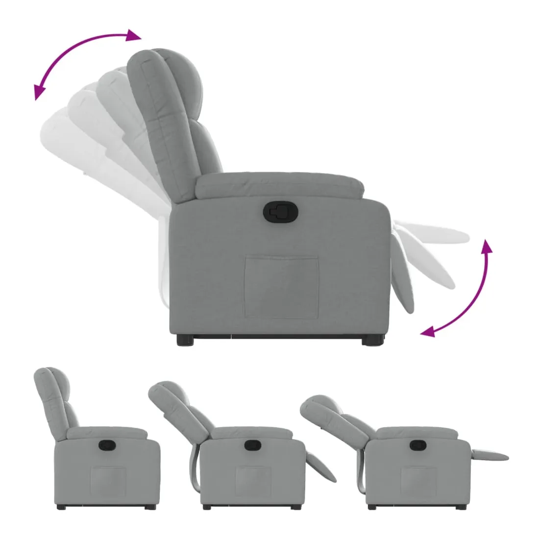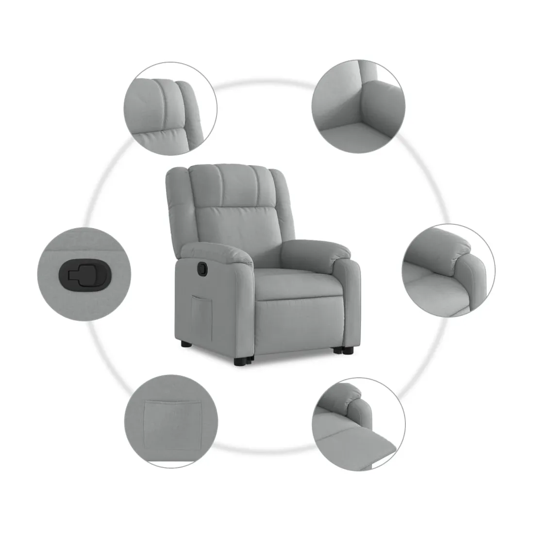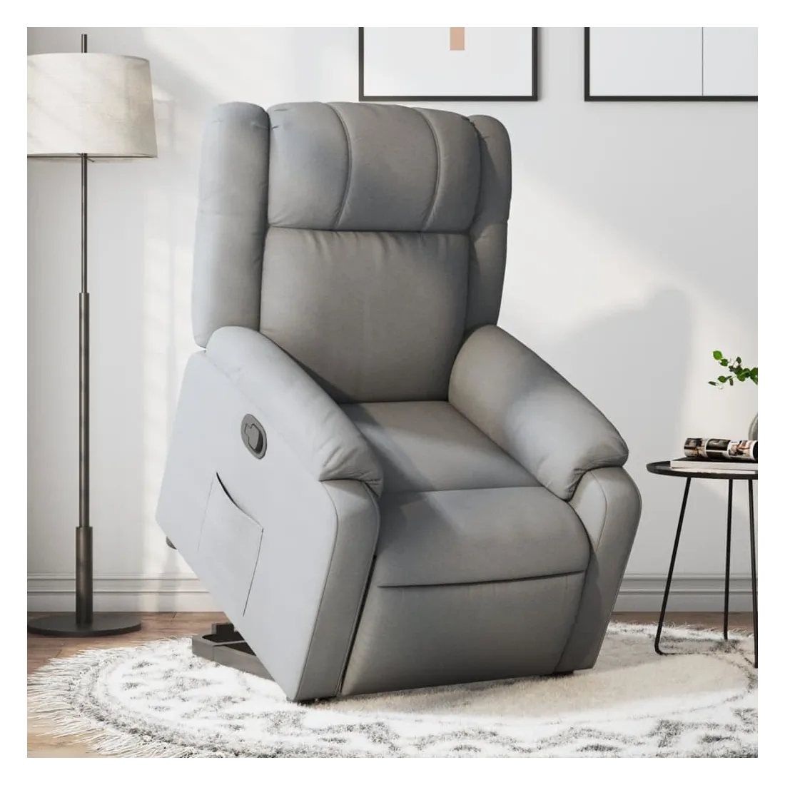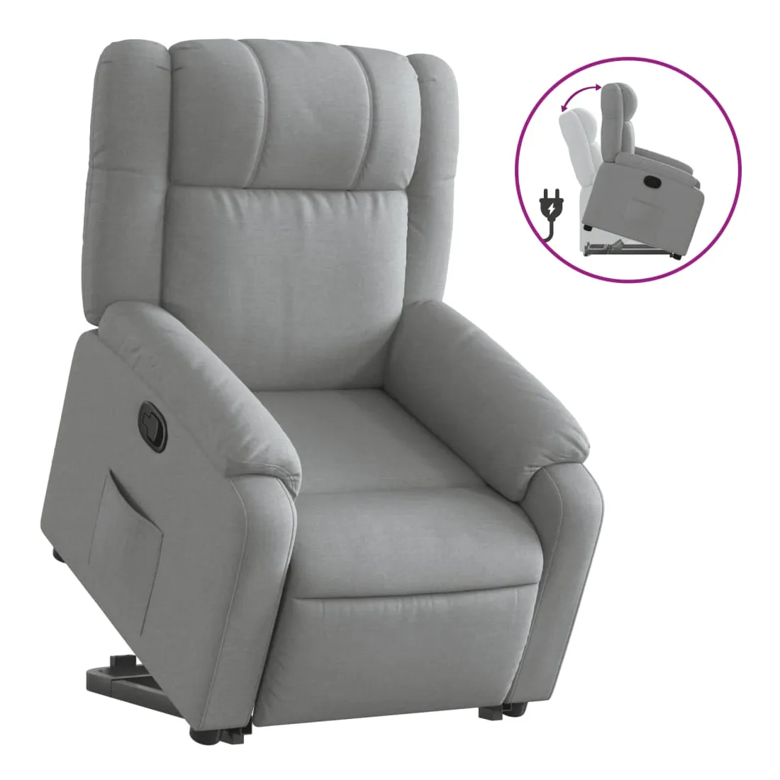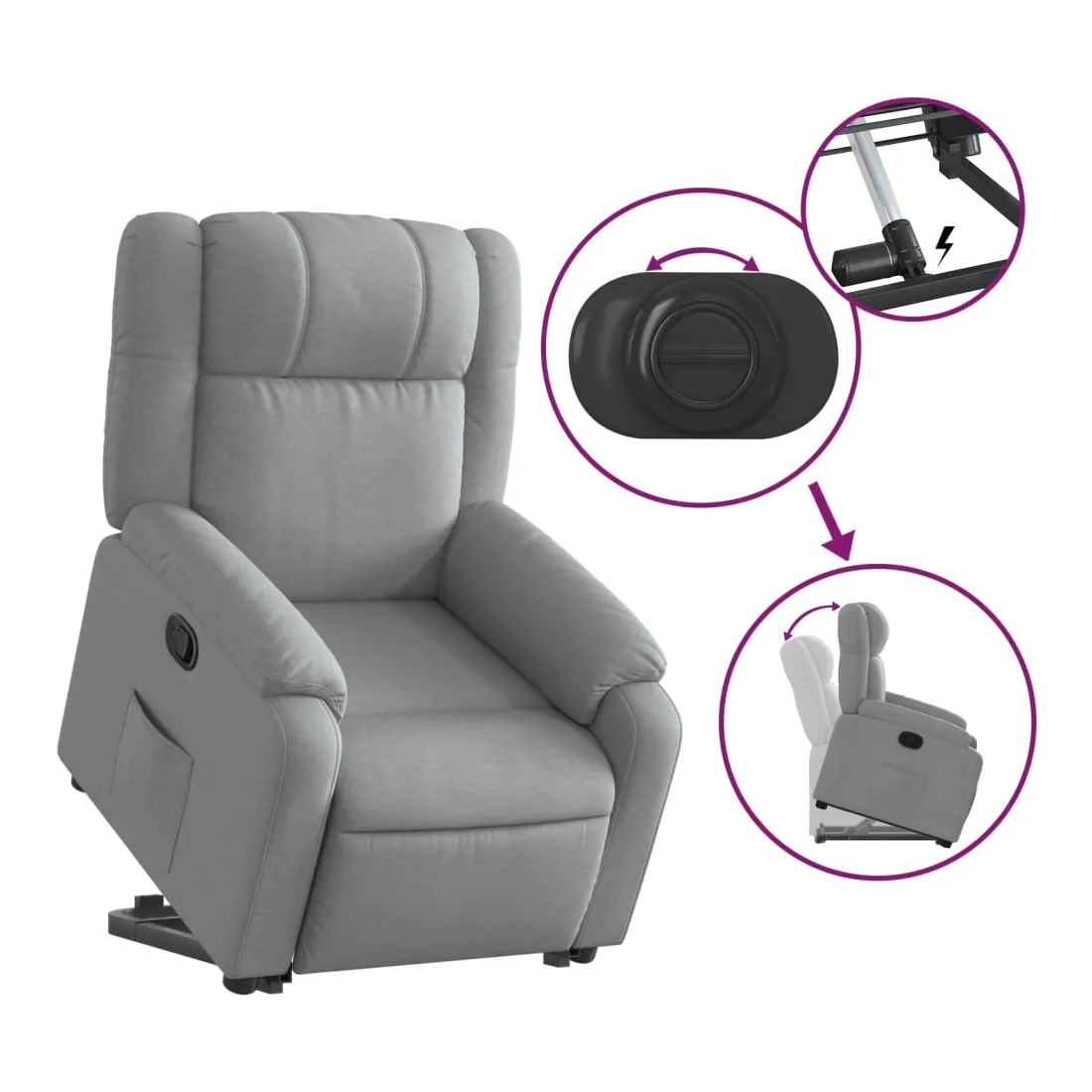 Asseyez-vous et détendez-vous dans ce fauteuil inclinable très confortable ! Fonction de levage électrique : ce fauteuil inclinable pour personnes âgées est équipé d'un moteur électrique pour la fonction de levage. Grâce à la fonction qui pousse toute la chaise vers le haut, vous pouvez facilement vous tenir debout sans stresser votre dos et vos genoux en appuyant simplement sur le bouton.Fonction d'inclinaison manuelle : ce fauteuil inclinable est doté d'une poignée du côté droit. Vous pouvez régler manuellement le repose-pieds et le dossier dans n'importe quelle position selon votre confort en tirant simplement sur la poignée. Cette fonction permet une inclinaison maximale de 135 degrés. De plus, le dossier peut revenir rapidement à sa position d'origine en tirant simplement sur la poignée.Expérience d'assise confortable : le siège, le dossier et les larges accoudoirs bien rembourrés recouverts de tissu procurent une sensation confortable et chaleureuse, vous permettant de vous sentir enveloppé lorsque vous êtes assis. Le tissu présente un aspect simple et épuré et est respirant et durable.Poche latérale pratique : ce fauteuil est doté d'une poche latérale pour vous permettre de garder vos objets essentiels à portée de main.Cadre solide et stable : le cadre en bois et en métal offre une structure solide et une grande stabilité. Ce fauteuil inclinable est confortable et durable.