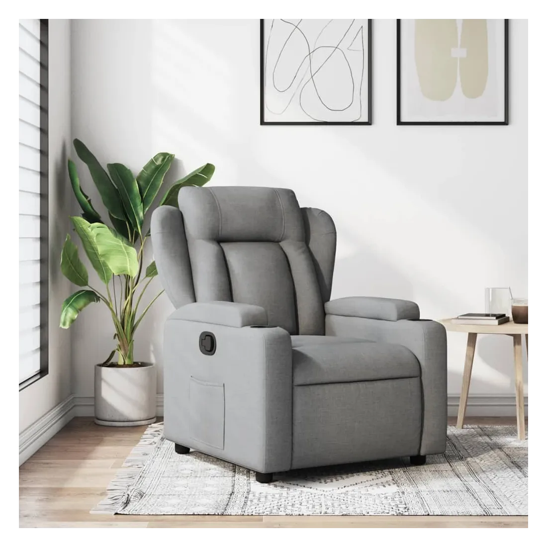 Asseyez-vous et laissez-vous emporter par ce fauteuil inclinable très confortable ! Fonction d'inclinaison manuelle : Ce fauteuil inclinable est doté d'un bouton sur le côté droit. Vous pouvez régler manuellement le repose-pieds et le dossier dans n'importe quelle position selon votre confort en tirant simplement sur la poignée. Cette fonction permet une inclinaison maximale de 135 degrés. De plus, le dossier peut revenir rapidement à sa position initiale en tirant facilement sur la poignée.Expérience d'assise confortable : L'assise, le dossier et les larges accoudoirs rembourrés et recouverts de tissu offrent une sensation de confort et de chaleur, vous donnant l'impression d'être bien installé. Le tissu présente un aspect simple et épuré, est respirant et durable.Porte-gobelets pratiques et poche latérale : Ce fauteuil est doté de deux porte-gobelets pratiques pour vos boissons et d'une poche latérale pour garder vos objets essentiels à portée de main.Cadre solide et stable : Le cadre en bois et en métal offre une structure solide et stable. Ce fauteuil inclinable est confortable et durable.