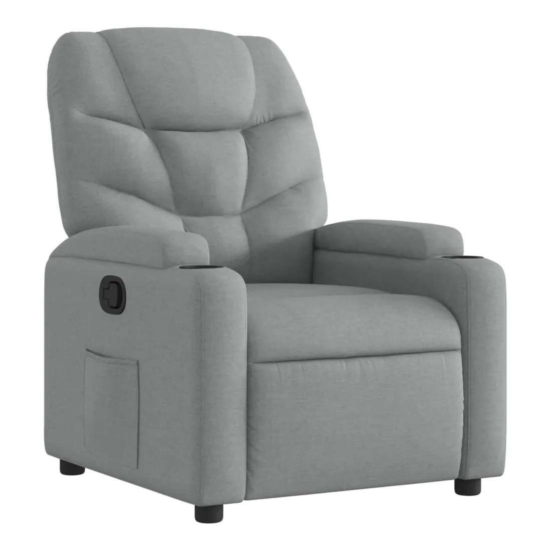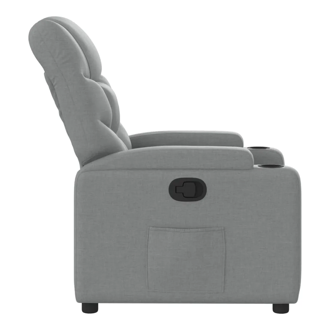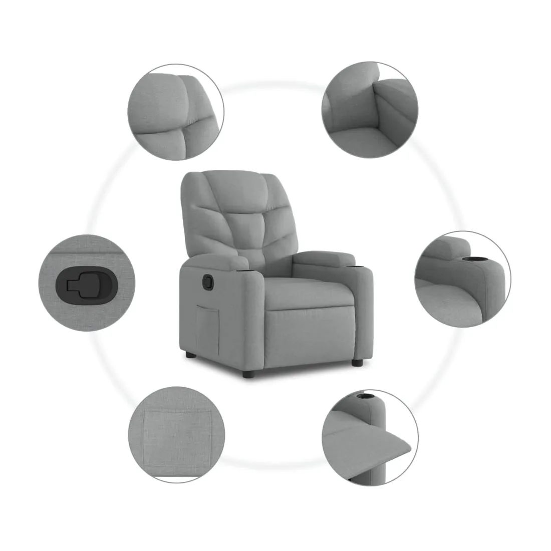 Asseyez-vous et laissez-vous emporter par ce fauteuil inclinable très confortable ! Fonction d'inclinaison manuelle : Ce fauteuil inclinable est doté d'une poignée sur le côté droit. Vous pouvez régler manuellement le repose-pieds et le dossier dans n'importe quelle position selon votre confort en tirant simplement sur la poignée. Cette fonction permet une inclinaison maximale de 135 degrés. De plus, le dossier peut revenir rapidement à sa position initiale en tirant facilement sur la poignée.Expérience d'assise confortable : L'assise, le dossier et les larges accoudoirs rembourrés et recouverts de tissu offrent une sensation de confort et de chaleur, vous donnant l'impression d'être enlacé en position assise. Le tissu présente un aspect simple et épuré, est respirant et durable.Porte-gobelets pratiques et poche latérale : Ce fauteuil est doté de deux porte-gobelets pratiques pour vos boissons et d'une poche latérale pour garder vos objets essentiels à portée de main.Cadre solide et stable : Le cadre en bois et en métal offre une structure solide et stable. Ce fauteuil inclinable est confortable et durable.