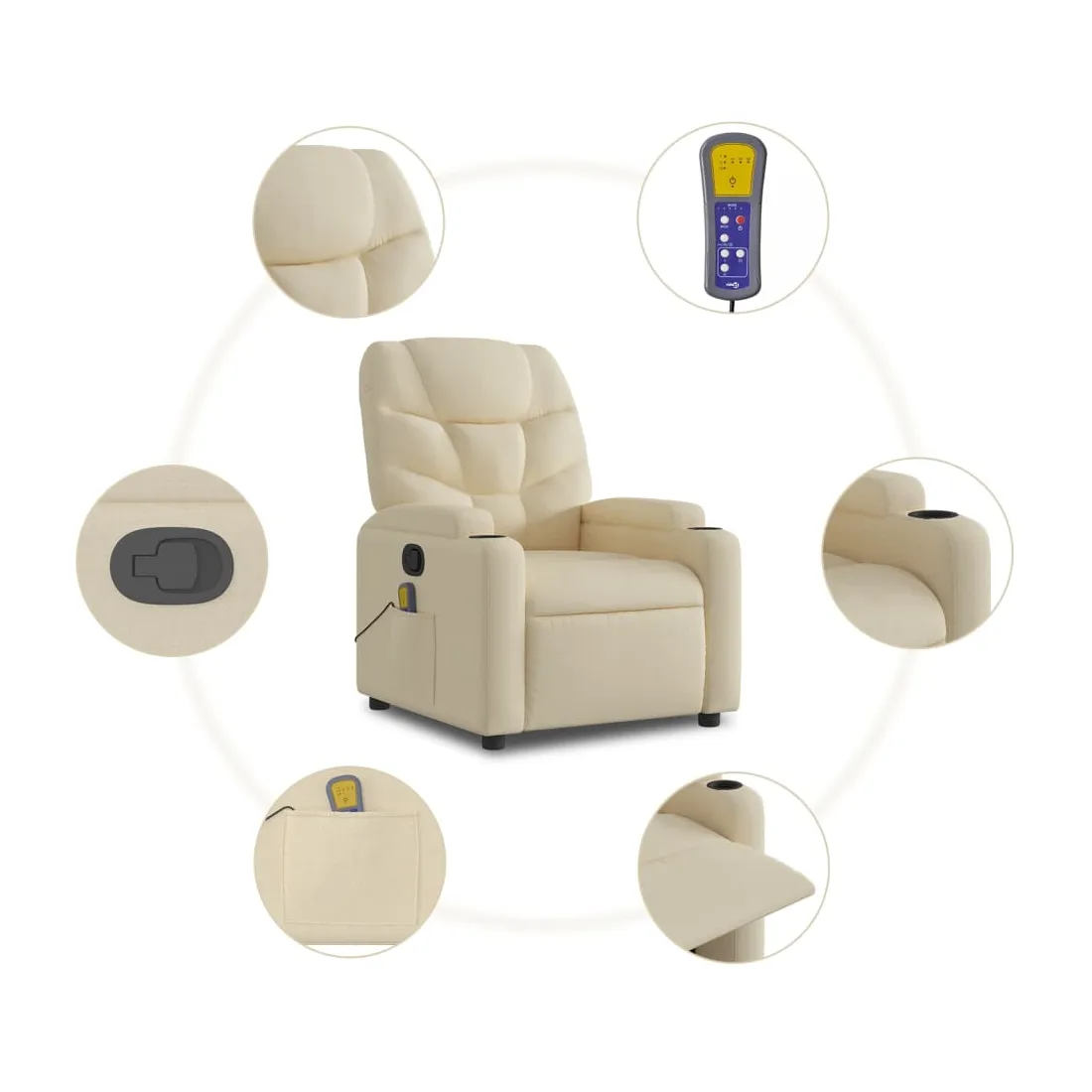 Asseyez-vous et détendez-vous dans ce fauteuil inclinable de massage très confortable ! Fonction d'inclinaison manuelle : ce fauteuil inclinable est doté d'une poignée du côté droit. Vous pouvez régler manuellement le repose-pieds et le dossier dans n'importe quelle position selon votre confort en tirant simplement sur la poignée. Cette fonction permet une inclinaison maximale de 135 degrés. De plus, le dossier peut revenir rapidement à sa position d'origine en tirant simplement sur la poignée.Fonction de vibration : les 6 points de massage vous permettent de faire l'expérience d'un massage mieux ciblé. De plus, la télécommande incluse vous permet de choisir différents programmes de massage. La fonction de massage est alimentée par le connecteur USB, mais la source d'alimentation USB 5V certifiée n'est pas incluse.Expérience d'assise confortable : le siège, le dossier et les larges accoudoirs bien rembourrés recouverts de tissu procurent une sensation confortable et chaleureuse, vous permettant de vous sentir enveloppé lorsque vous êtes assis. Le tissu présente un aspect simple et épuré et est respirant et durable.Porte-gobelets et poche latérale pratiques : ce fauteuil dispose de deux porte-gobelets pratiques pour vos boissons et d'une poche latérale pour votre télécommande ou pour garder vos objets essentiels à portée de main.Cadre solide et stable : le cadre en bois et en métal offre une structure solide et une grande stabilité. Ce fauteuil inclinable est confortable et durable.