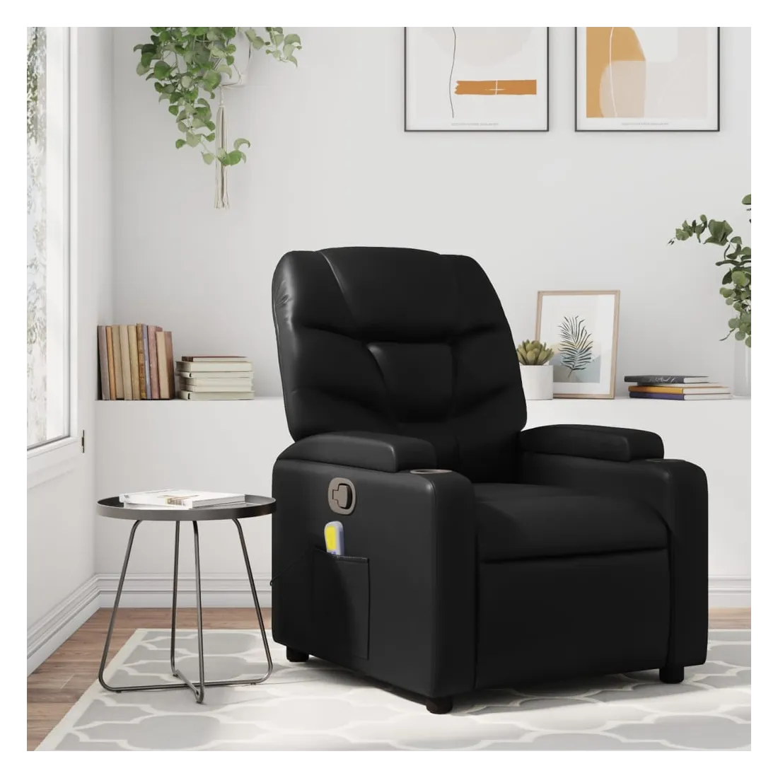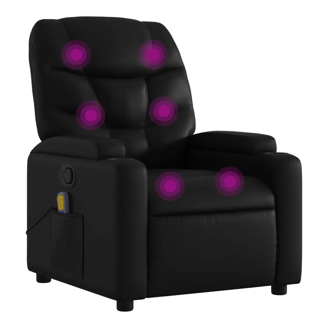 Asseyez-vous et détendez-vous dans ce fauteuil inclinable de massage très confortable ! Fonction d'inclinaison manuelle : ce fauteuil inclinable est doté d'une poignée du côté droit. Vous pouvez régler manuellement le repose-pieds et le dossier dans n'importe quelle position selon votre confort en tirant simplement sur la poignée. Cette fonction permet une inclinaison maximale de 135 degrés. De plus, le dossier peut revenir rapidement à sa position d'origine en tirant simplement sur la poignée.Fonction de vibration : les 6 points de massage vous permettent de faire l'expérience d'un massage mieux ciblé. De plus, la télécommande incluse vous permet de choisir différents programmes de massage. La fonction de massage est alimentée par le connecteur USB, mais la source d'alimentation USB 5V certifiée n'est pas incluse.Expérience de siège confortable : le siège, le dossier et les larges accoudoirs rembourrés épais recouverts de similicuir procurent une sensation confortable, vous faisant vous sentir enlacé lorsque vous êtes assis. Le similicuir est un matériau très résistant. Il est résistant aux taches, ce qui le rend facile à nettoyer avec un chiffon humide. La surface lisse donne également un aspect luxueux et la beauté du cuir véritable.Porte-gobelets et poche latérale pratiques : ce fauteuil dispose de deux porte-gobelets pratiques pour vos boissons et d'une poche latérale pour votre télécommande ou pour garder vos objets essentiels à portée de main.Cadre solide et stable : le cadre en bois et en métal offre une structure solide et une grande stabilité. Ce fauteuil inclinable est confortable et durable.