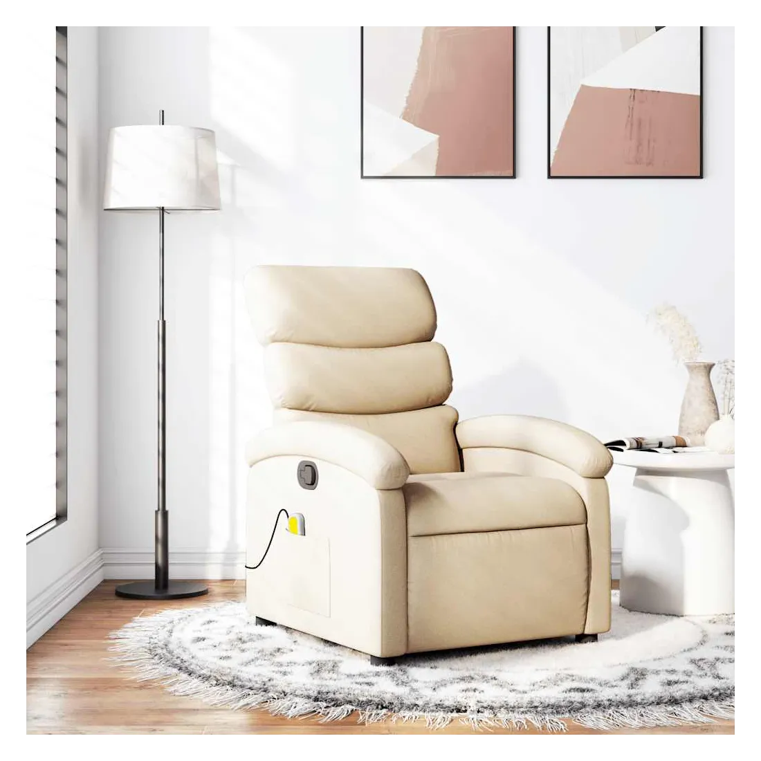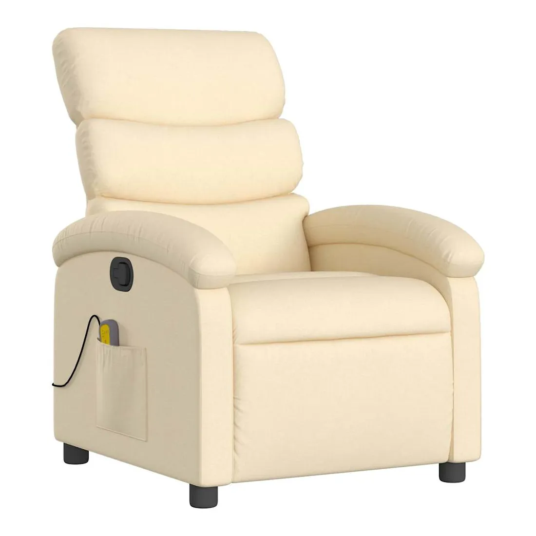 Asseyez-vous et détendez-vous dans ce fauteuil inclinable de massage très confortable ! Fonction d'inclinaison manuelle : ce fauteuil inclinable est doté d'une poignée du côté droit. Vous pouvez régler manuellement le repose-pieds et le dossier dans n'importe quelle position selon votre confort en tirant simplement sur la poignée. Cette fonction permet une inclinaison maximale de 135 degrés. De plus, le dossier peut revenir rapidement à sa position d'origine en tirant simplement sur la poignée.Fonction de vibration : les 6 points de massage vous permettent de faire l'expérience d'un massage mieux ciblé. De plus, la télécommande incluse vous permet de choisir différents programmes de massage. La fonction de massage est alimentée par le connecteur USB, mais la source d'alimentation USB 5V certifiée n'est pas incluse.Expérience d'assise confortable : le siège, le dossier et les larges accoudoirs bien rembourrés recouverts de tissu procurent une sensation confortable et chaleureuse, vous permettant de vous sentir enveloppé lorsque vous êtes assis. Le tissu présente un aspect simple et épuré et est respirant et durable.Poche latérale pratique : ce fauteuil est doté d'une poche latérale pour ranger votre télécommande ou garder vos objets essentiels à portée de main.Cadre solide et stable : le cadre en bois et en métal offre une structure solide et une grande stabilité. Ce fauteuil inclinable est confortable et durable.