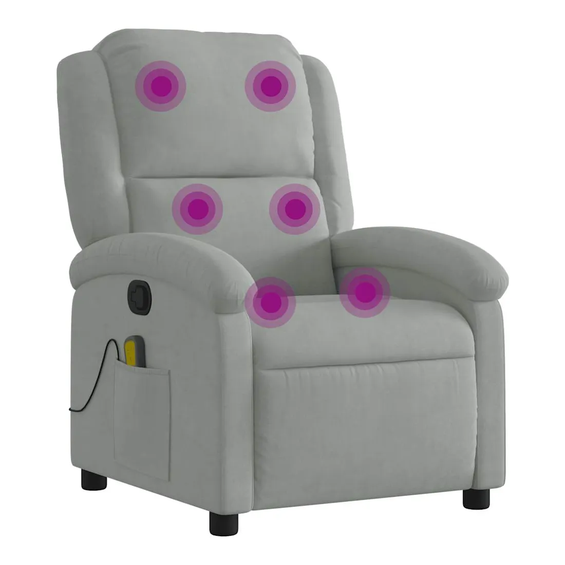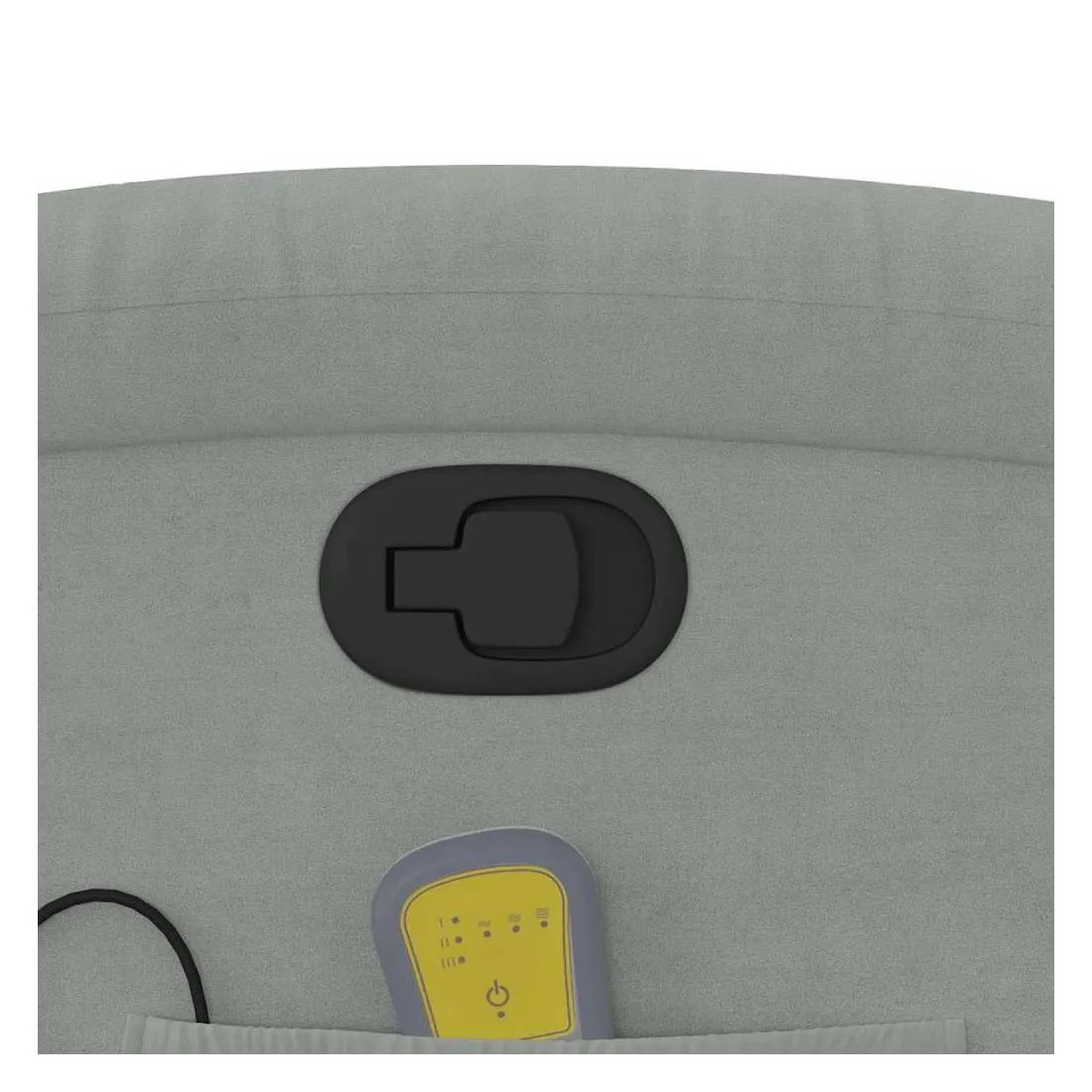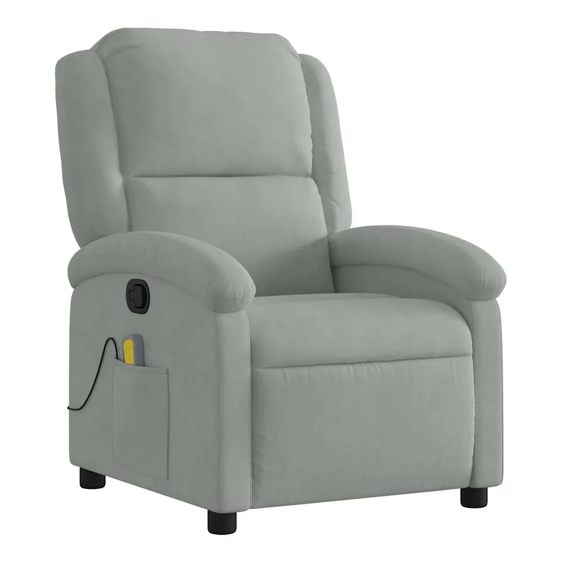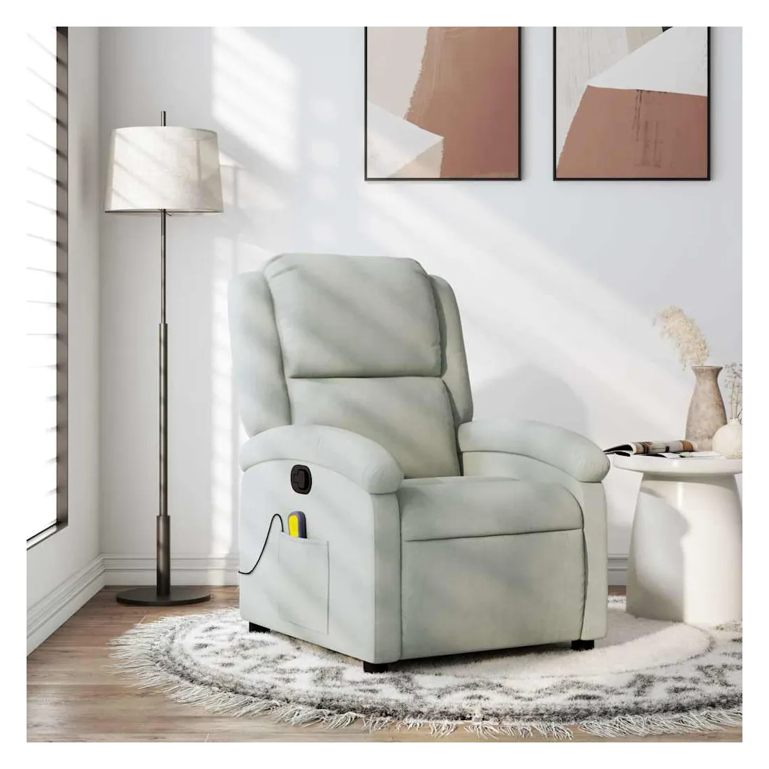 Asseyez-vous et détendez-vous dans ce fauteuil inclinable de massage très confortable ! Fonction d'inclinaison manuelle : ce fauteuil inclinable est doté d'une poignée du côté droit. Vous pouvez régler manuellement le repose-pieds et le dossier dans n'importe quelle position selon votre confort en tirant simplement sur la poignée. Cette fonction permet une inclinaison maximale de 135 degrés. De plus, le dossier peut revenir rapidement à sa position d'origine en tirant simplement sur la poignée.Fonction de vibration : les 6 points de massage vous permettent de faire l'expérience d'un massage mieux ciblé. De plus, la télécommande incluse vous permet de choisir différents programmes de massage. La fonction de massage est alimentée par le connecteur USB, mais la source d'alimentation USB 5V certifiée n'est pas incluse.Expérience d'assise confortable : le siège, le dossier et les larges accoudoirs rembourrés épais recouverts de velours procurent une sensation confortable et chaleureuse, vous faisant vous sentir enlacé lorsque vous êtes assis. Le velours est un tissu doux et confortable qui est agréable sur la peau.Poche latérale pratique : ce fauteuil est doté d'une poche latérale pour ranger votre télécommande ou garder vos objets essentiels à portée de main.Cadre solide et stable : le cadre en bois et en métal offre une structure solide et une grande stabilité. Ce fauteuil inclinable est confortable et durable.