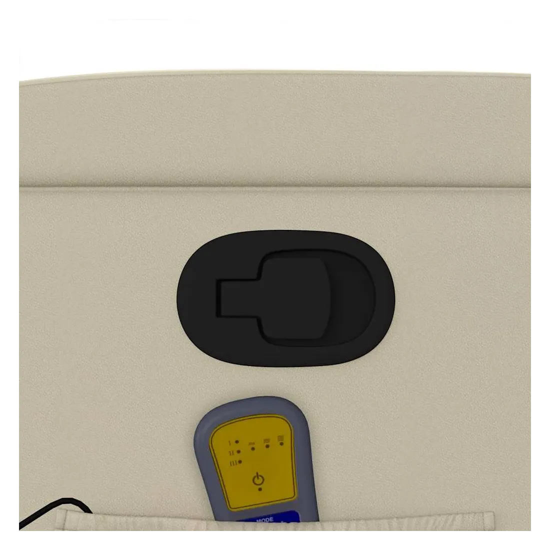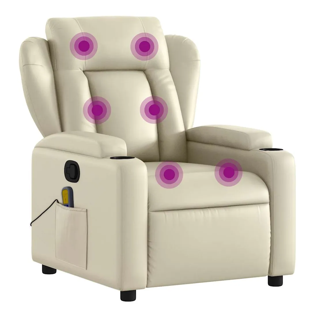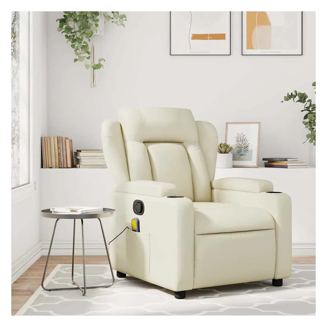 Asseyez-vous et détendez-vous dans ce fauteuil inclinable de massage très confortable ! Fonction d'inclinaison manuelle : ce fauteuil inclinable est doté d'une poignée du côté droit. Vous pouvez régler manuellement le repose-pieds et le dossier dans n'importe quelle position selon votre confort en tirant simplement sur la poignée. Cette fonction permet une inclinaison maximale de 135 degrés. De plus, le dossier peut revenir rapidement à sa position d'origine en tirant simplement sur la poignée.Fonction de vibration : les 6 points de massage vous permettent de faire l'expérience d'un massage mieux ciblé. De plus, la télécommande incluse vous permet de choisir différents programmes de massage. La fonction de massage est alimentée par le connecteur USB, mais la source d'alimentation USB 5V certifiée n'est pas incluse.Expérience de siège confortable : le siège, le dossier et les larges accoudoirs rembourrés épais recouverts de similicuir procurent une sensation confortable, vous faisant vous sentir enlacé lorsque vous êtes assis. Le similicuir est un matériau très résistant. Il est résistant aux taches, ce qui le rend facile à nettoyer avec un chiffon humide. La surface lisse donne également un aspect luxueux et la beauté du cuir véritable.Porte-gobelets et poche latérale pratiques : ce fauteuil dispose de deux porte-gobelets pratiques pour vos boissons et d'une poche latérale pour votre télécommande ou pour garder vos objets essentiels à portée de main.Cadre solide et stable : le cadre en bois et en métal offre une structure solide et une grande stabilité. Ce fauteuil inclinable est confortable et durable.