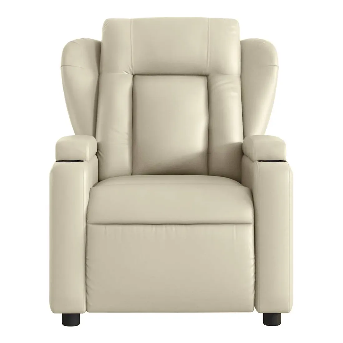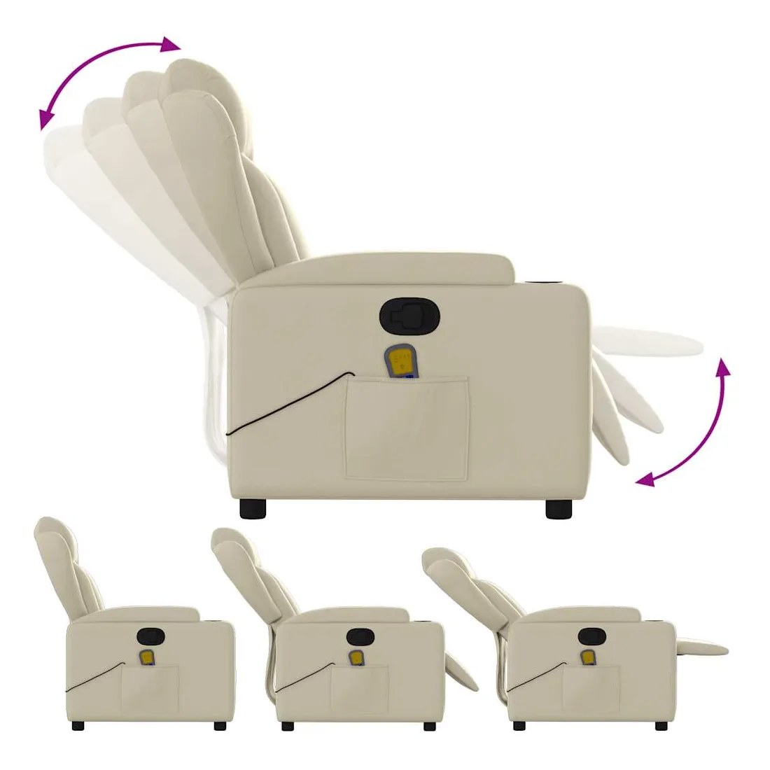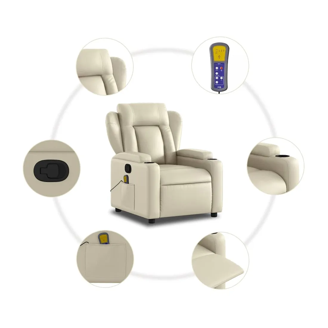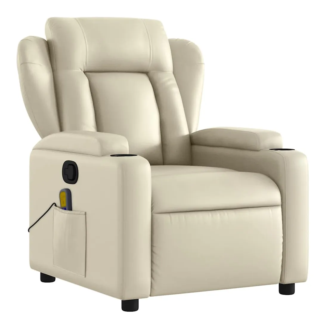 Asseyez-vous et détendez-vous dans ce fauteuil inclinable de massage très confortable ! Fonction d'inclinaison manuelle : ce fauteuil inclinable est doté d'une poignée du côté droit. Vous pouvez régler manuellement le repose-pieds et le dossier dans n'importe quelle position selon votre confort en tirant simplement sur la poignée. Cette fonction permet une inclinaison maximale de 135 degrés. De plus, le dossier peut revenir rapidement à sa position d'origine en tirant simplement sur la poignée.Fonction de vibration : les 6 points de massage vous permettent de faire l'expérience d'un massage mieux ciblé. De plus, la télécommande incluse vous permet de choisir différents programmes de massage. La fonction de massage est alimentée par le connecteur USB, mais la source d'alimentation USB 5V certifiée n'est pas incluse.Expérience de siège confortable : le siège, le dossier et les larges accoudoirs rembourrés épais recouverts de similicuir procurent une sensation confortable, vous faisant vous sentir enlacé lorsque vous êtes assis. Le similicuir est un matériau très résistant. Il est résistant aux taches, ce qui le rend facile à nettoyer avec un chiffon humide. La surface lisse donne également un aspect luxueux et la beauté du cuir véritable.Porte-gobelets et poche latérale pratiques : ce fauteuil dispose de deux porte-gobelets pratiques pour vos boissons et d'une poche latérale pour votre télécommande ou pour garder vos objets essentiels à portée de main.Cadre solide et stable : le cadre en bois et en métal offre une structure solide et une grande stabilité. Ce fauteuil inclinable est confortable et durable.