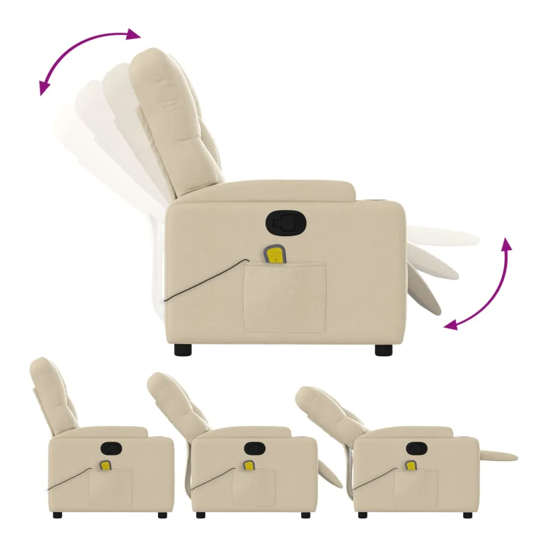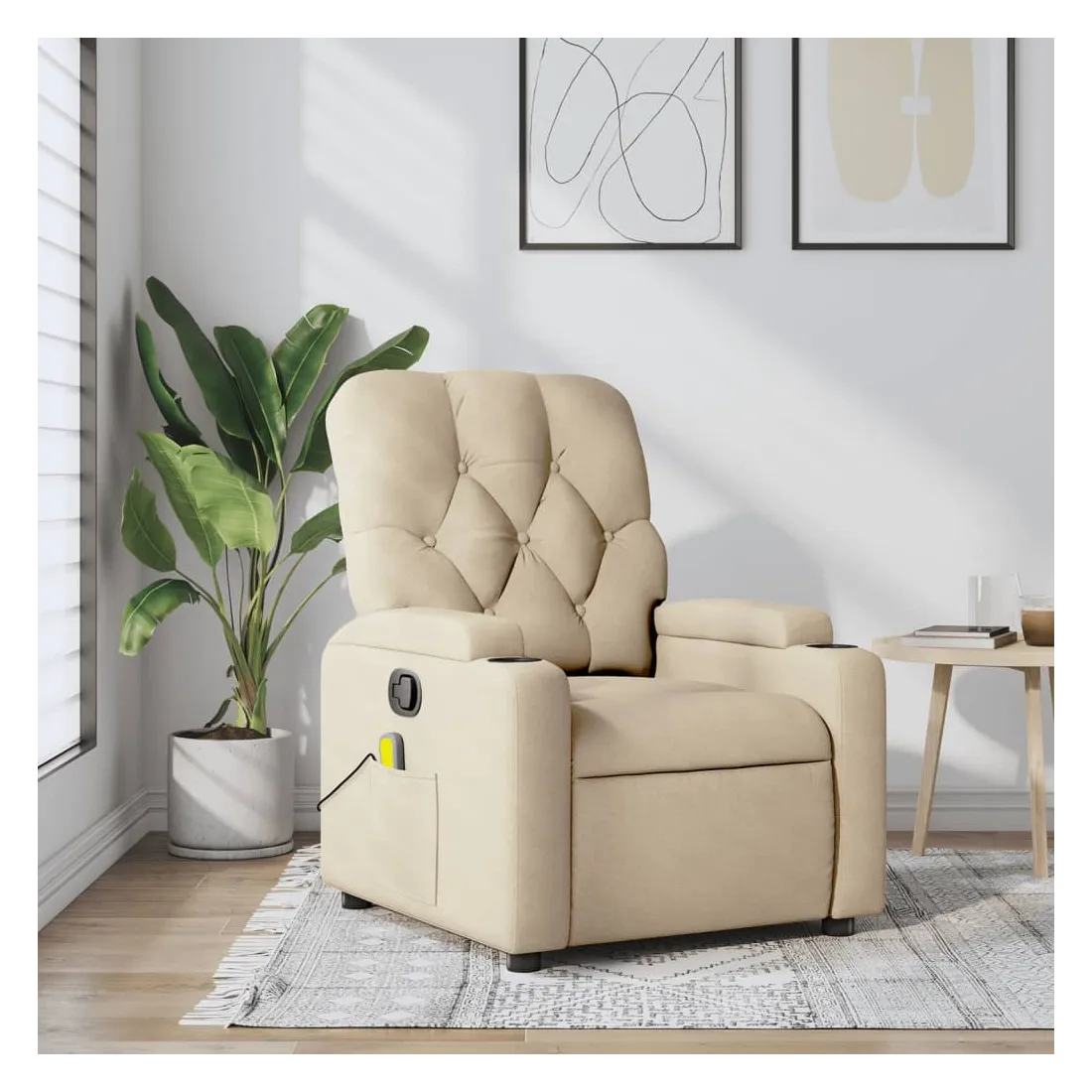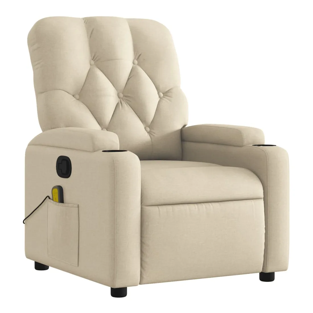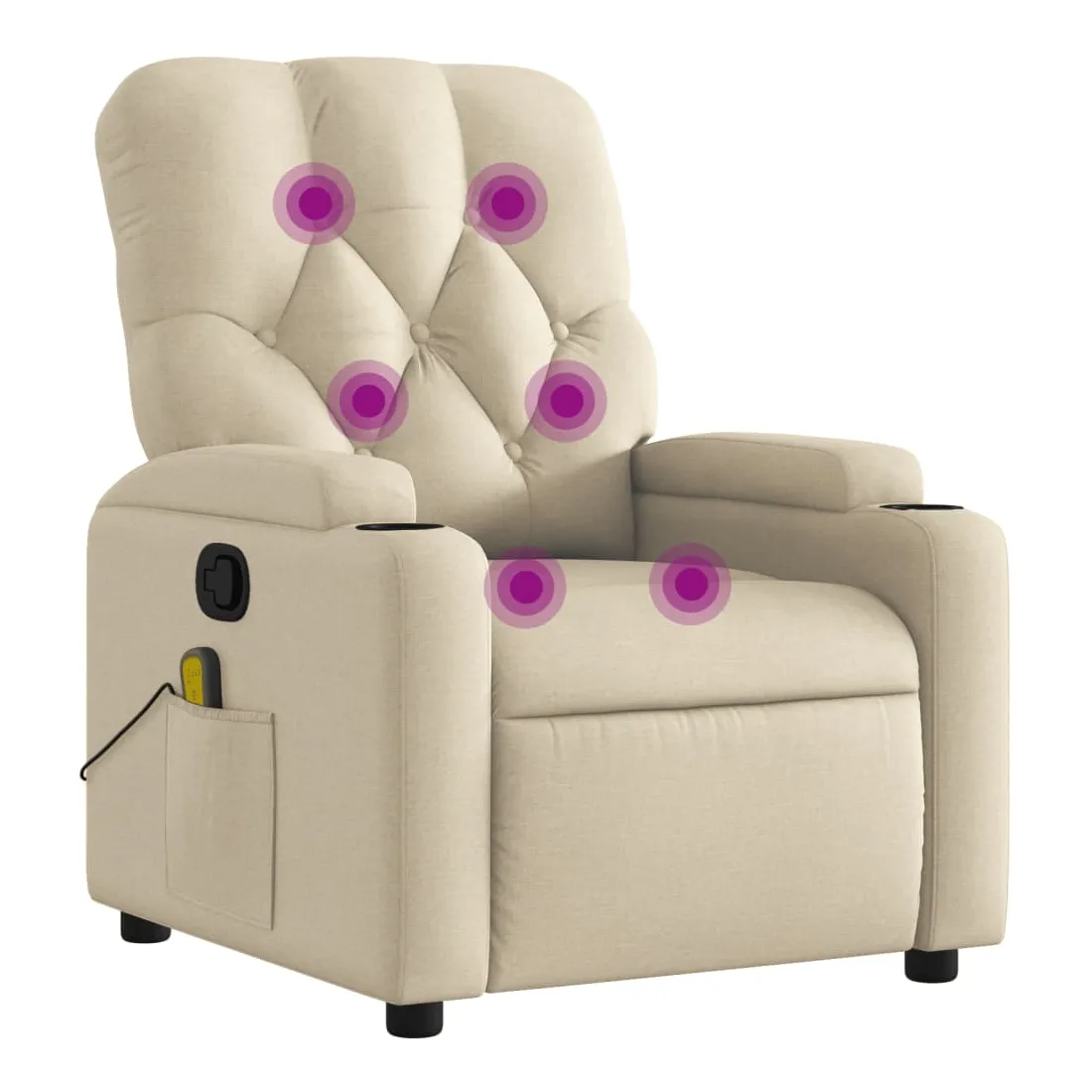 Asseyez-vous et détendez-vous dans ce fauteuil inclinable de massage très confortable ! Fonction d'inclinaison manuelle : ce fauteuil inclinable est doté d'une poignée du côté droit. Vous pouvez régler manuellement le repose-pieds et le dossier dans n'importe quelle position selon votre confort en tirant simplement sur la poignée. Cette fonction permet une inclinaison maximale de 135 degrés. De plus, le dossier peut revenir rapidement à sa position d'origine en tirant simplement sur la poignée.Fonction de vibration : les 6 points de massage vous permettent de faire l'expérience d'un massage mieux ciblé. De plus, la télécommande incluse vous permet de choisir différents programmes de massage. La fonction de massage est alimentée par le connecteur USB, mais la source d'alimentation USB 5V certifiée n'est pas incluse.Expérience d'assise confortable : le siège, le dossier et les larges accoudoirs bien rembourrés recouverts de tissu procurent une sensation confortable et chaleureuse, vous permettant de vous sentir enveloppé lorsque vous êtes assis. Le tissu présente un aspect simple et épuré et est respirant et durable.Porte-gobelets et poche latérale pratiques : ce fauteuil dispose de deux porte-gobelets pratiques pour vos boissons et d'une poche latérale pour votre télécommande ou pour garder vos objets essentiels à portée de main.Cadre solide et stable : le cadre en bois et en métal offre une structure solide et une grande stabilité. Ce fauteuil inclinable est confortable et durable.