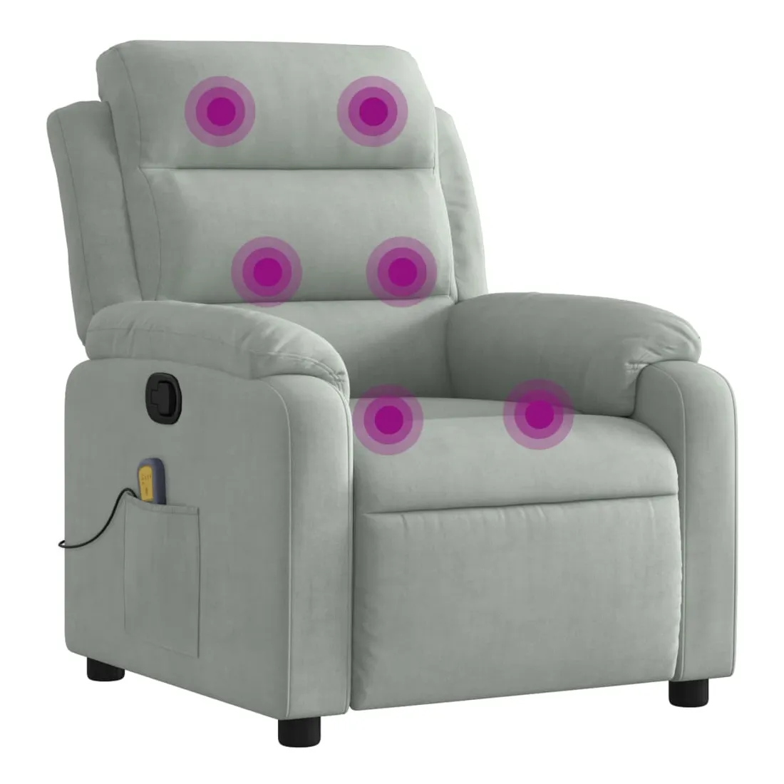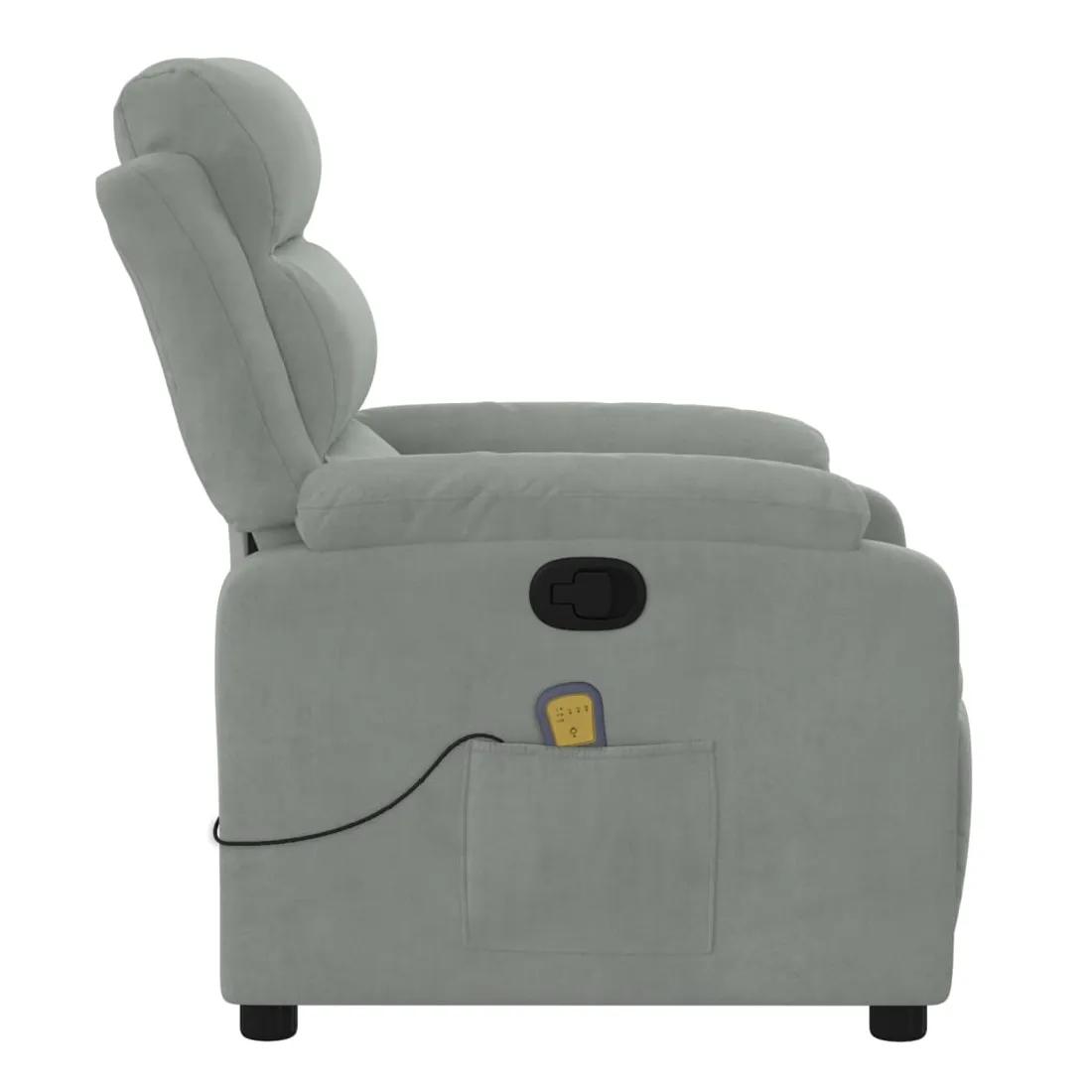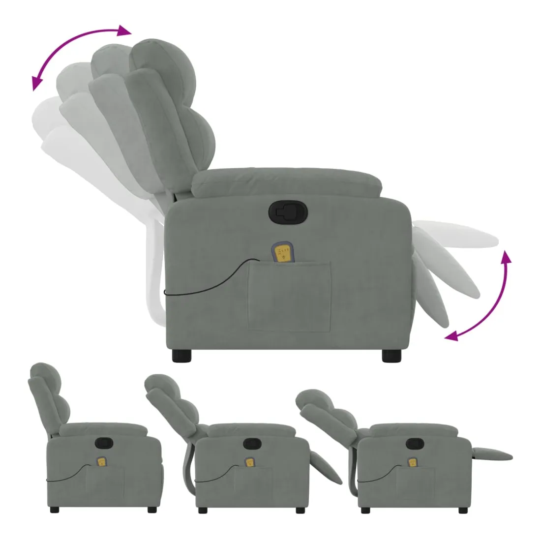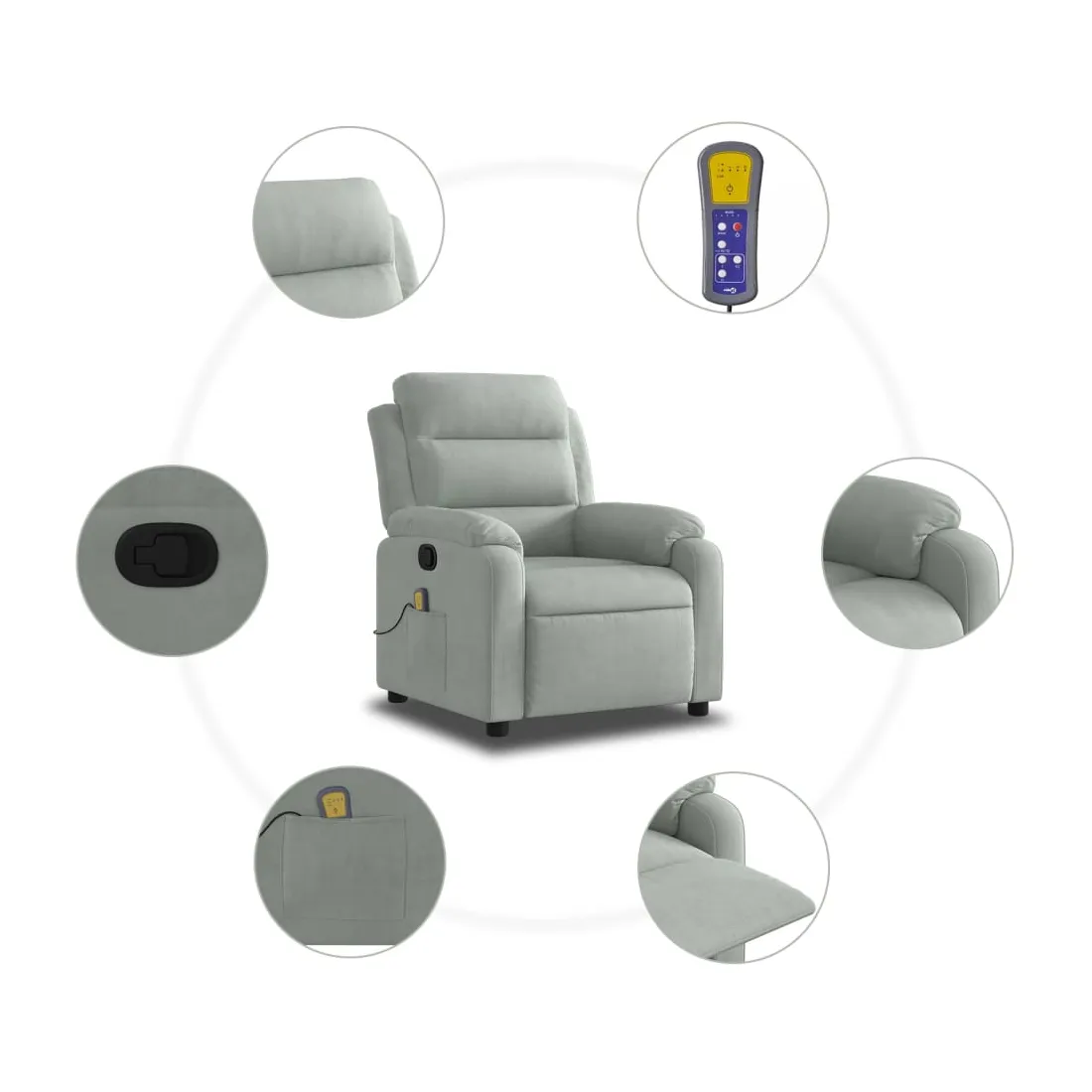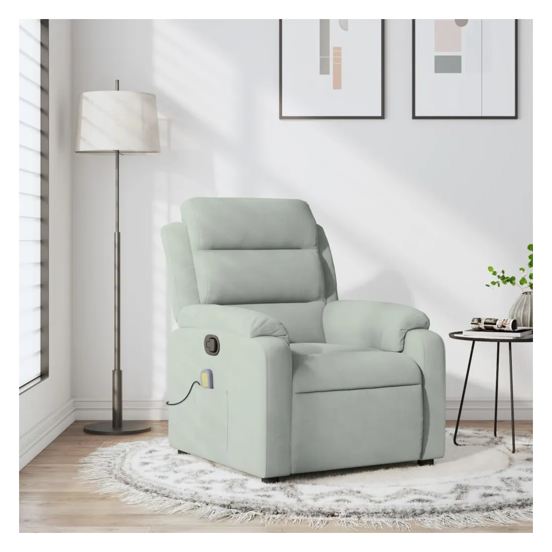 Asseyez-vous et détendez-vous dans ce fauteuil inclinable de massage très confortable ! Fonction d'inclinaison manuelle : ce fauteuil inclinable est doté d'une poignée du côté droit. Vous pouvez régler manuellement le repose-pieds et le dossier dans n'importe quelle position selon votre confort en tirant simplement sur la poignée. Cette fonction permet une inclinaison maximale de 135 degrés. De plus, le dossier peut revenir rapidement à sa position d'origine en tirant simplement sur la poignée.Fonction de vibration : les 6 points de massage vous permettent de faire l'expérience d'un massage mieux ciblé. De plus, la télécommande incluse vous permet de choisir différents programmes de massage. La fonction de massage est alimentée par le connecteur USB, mais la source d'alimentation USB 5V certifiée n'est pas incluse.Expérience d'assise confortable : le siège, le dossier et les larges accoudoirs rembourrés épais recouverts de velours procurent une sensation confortable et chaleureuse, vous faisant vous sentir enlacé lorsque vous êtes assis. Le velours est un tissu doux et confortable qui est agréable sur la peau.Poche latérale pratique : ce fauteuil est doté d'une poche latérale pour ranger votre télécommande ou garder vos objets essentiels à portée de main.Cadre solide et stable : le cadre en bois et en métal offre une structure solide et une grande stabilité. Ce fauteuil inclinable est confortable et durable.