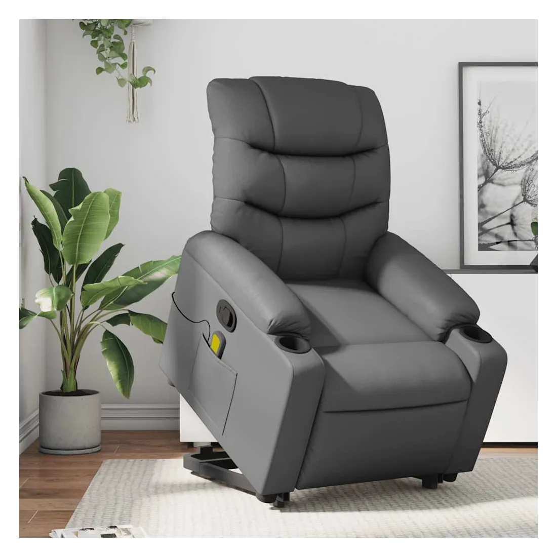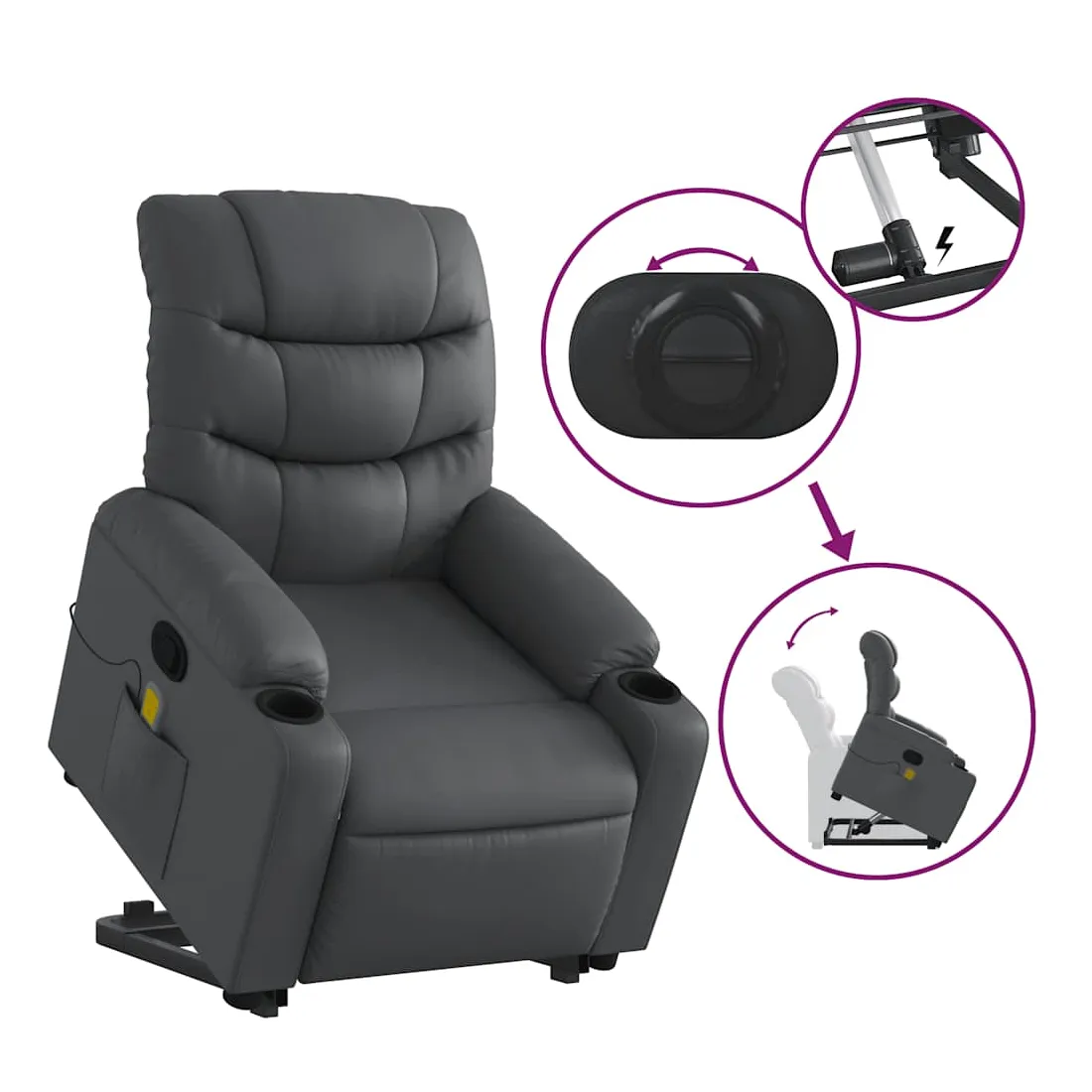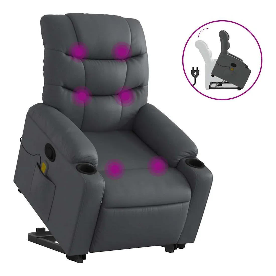 Asseyez-vous et détendez-vous dans ce fauteuil inclinable de massage très confortable ! Fonction de levage électrique : ce fauteuil inclinable pour personnes âgées est équipé d'un moteur électrique pour la fonction de levage. Grâce à la fonction qui pousse toute la chaise vers le haut, vous pouvez facilement vous tenir debout sans stresser votre dos et vos genoux en appuyant simplement sur le bouton.Fonction d'inclinaison manuelle : ce fauteuil inclinable est doté d'une poignée du côté droit. Vous pouvez régler manuellement le repose-pieds et le dossier dans n'importe quelle position selon votre confort en tirant simplement sur la poignée. Cette fonction permet une inclinaison maximale de 135 degrés. De plus, le dossier peut revenir rapidement à sa position d'origine en tirant simplement sur la poignée.Fonction de vibration : les 6 points de massage vous permettent de faire l'expérience d'un massage mieux ciblé. De plus, la télécommande incluse vous permet de choisir différents programmes de massage. La fonction de massage est alimentée par le connecteur USB qui nécessite une source d'alimentation USB certifiée de 5 V (non fournie).Expérience de siège confortable : le siège, le dossier et les larges accoudoirs rembourrés épais recouverts de similicuir procurent une sensation confortable et chaleureuse, vous faisant vous sentir enlacé lorsque vous êtes assis. Le simili cuir est un matériau très résistant. Il est résistant aux taches, ce qui le rend facile à nettoyer avec un chiffon humide. La surface lisse donne également un aspect luxueux et la beauté du cuir véritable.Poche latérale pratique : ce fauteuil est doté d'une poche latérale pour ranger votre télécommande ou garder vos objets essentiels à portée de main.Cadre solide et stable : le cadre en bois et en métal offre une structure solide et une grande stabilité. Ce fauteuil inclinable est confortable et durable.