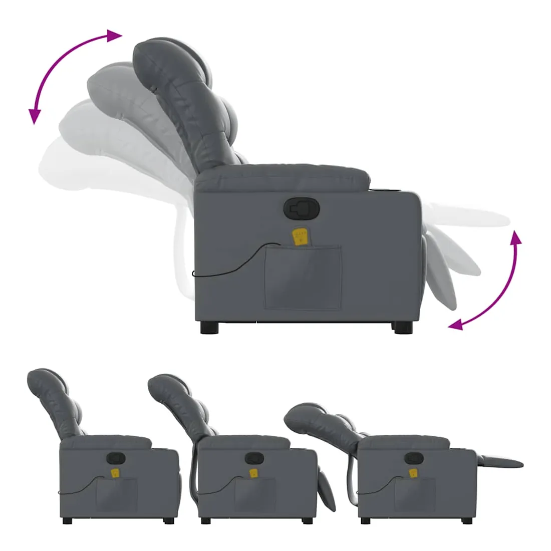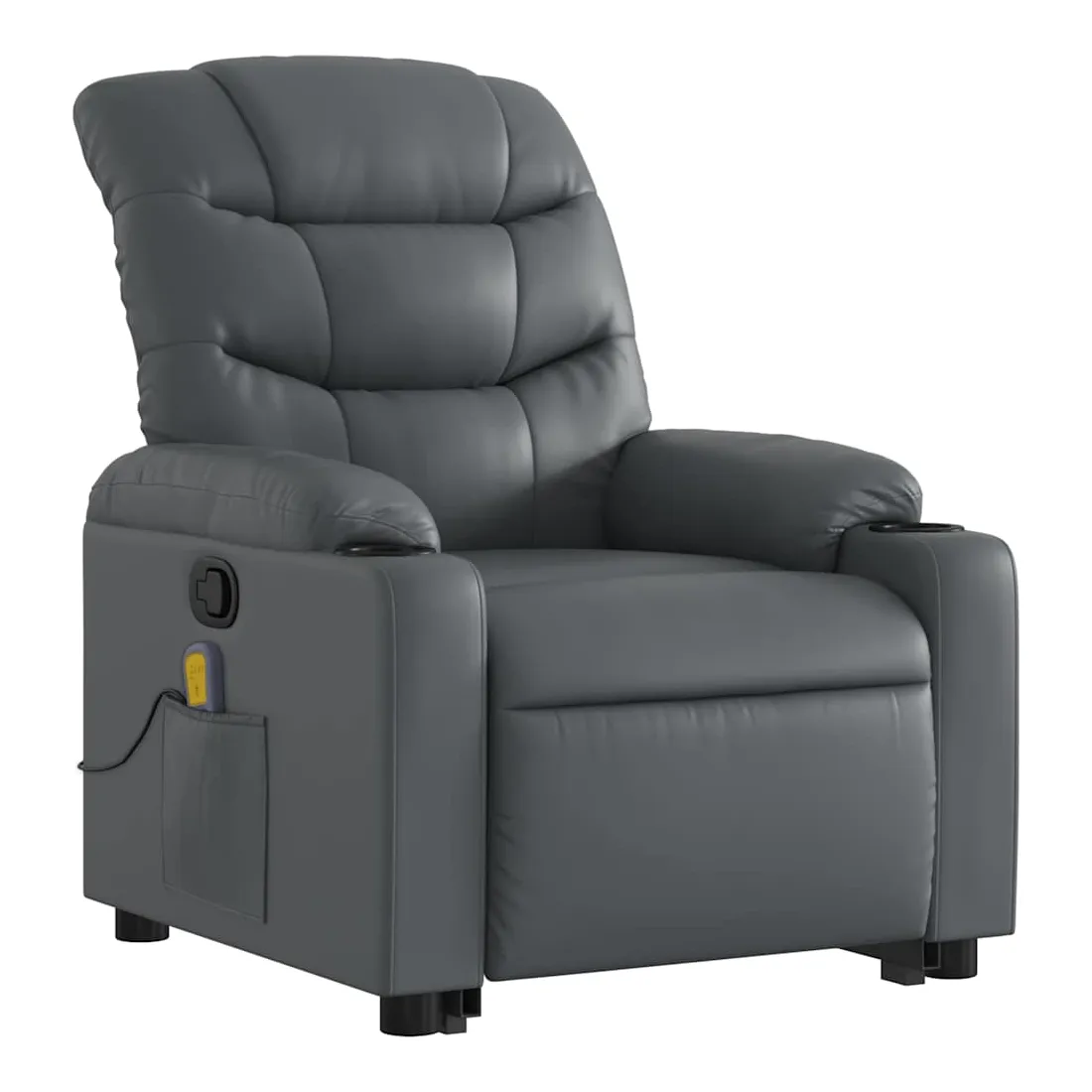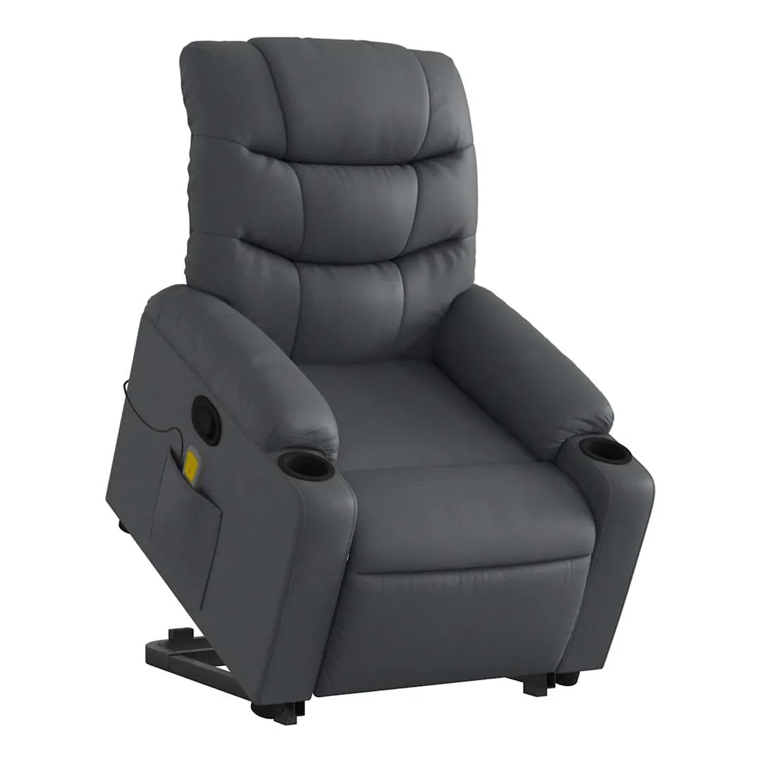 Asseyez-vous et détendez-vous dans ce fauteuil inclinable de massage très confortable ! Fonction de levage électrique : ce fauteuil inclinable pour personnes âgées est équipé d'un moteur électrique pour la fonction de levage. Grâce à la fonction qui pousse toute la chaise vers le haut, vous pouvez facilement vous tenir debout sans stresser votre dos et vos genoux en appuyant simplement sur le bouton.Fonction d'inclinaison manuelle : ce fauteuil inclinable est doté d'une poignée du côté droit. Vous pouvez régler manuellement le repose-pieds et le dossier dans n'importe quelle position selon votre confort en tirant simplement sur la poignée. Cette fonction permet une inclinaison maximale de 135 degrés. De plus, le dossier peut revenir rapidement à sa position d'origine en tirant simplement sur la poignée.Fonction de vibration : les 6 points de massage vous permettent de faire l'expérience d'un massage mieux ciblé. De plus, la télécommande incluse vous permet de choisir différents programmes de massage. La fonction de massage est alimentée par le connecteur USB qui nécessite une source d'alimentation USB certifiée de 5 V (non fournie).Expérience de siège confortable : le siège, le dossier et les larges accoudoirs rembourrés épais recouverts de similicuir procurent une sensation confortable et chaleureuse, vous faisant vous sentir enlacé lorsque vous êtes assis. Le simili cuir est un matériau très résistant. Il est résistant aux taches, ce qui le rend facile à nettoyer avec un chiffon humide. La surface lisse donne également un aspect luxueux et la beauté du cuir véritable.Poche latérale pratique : ce fauteuil est doté d'une poche latérale pour ranger votre télécommande ou garder vos objets essentiels à portée de main.Cadre solide et stable : le cadre en bois et en métal offre une structure solide et une grande stabilité. Ce fauteuil inclinable est confortable et durable.