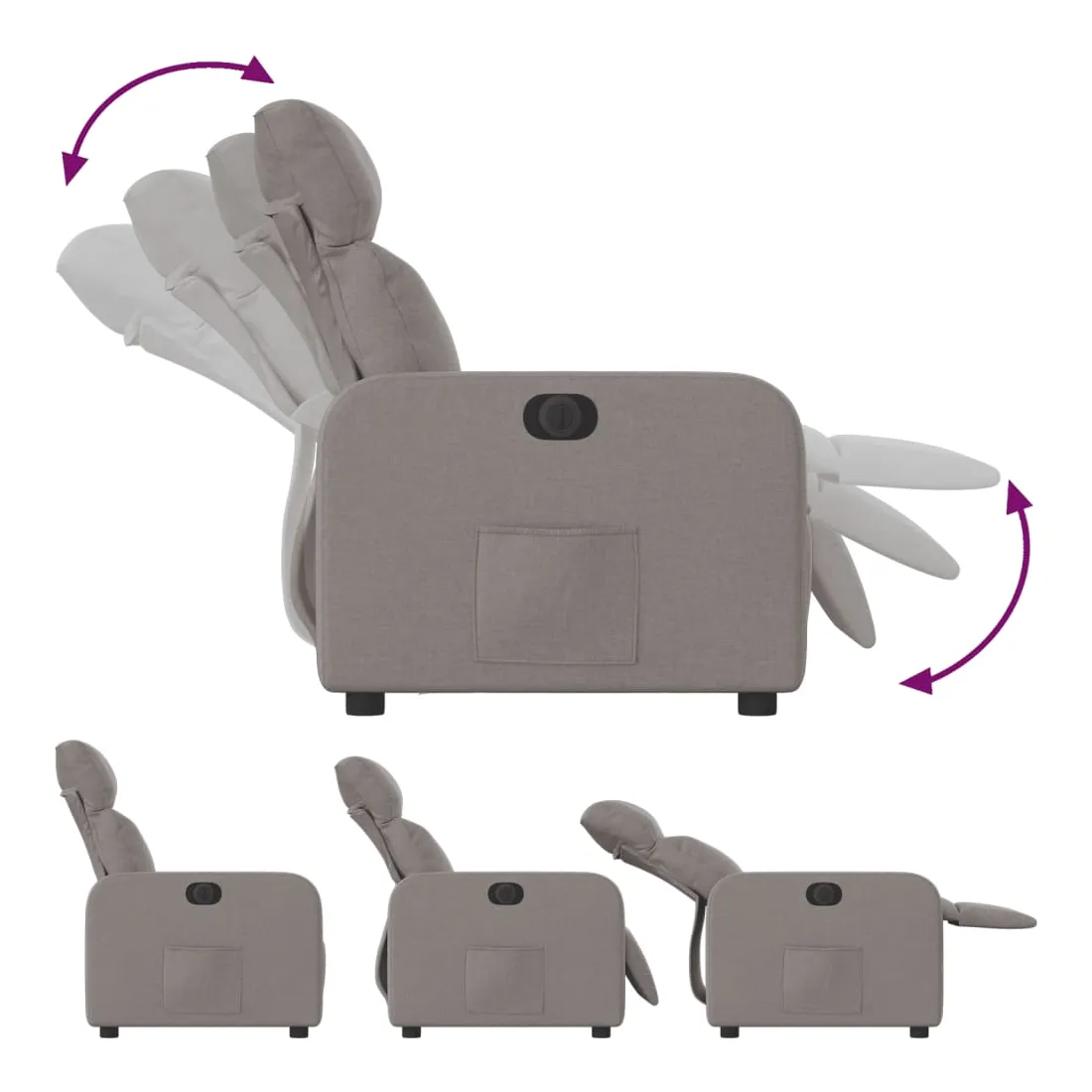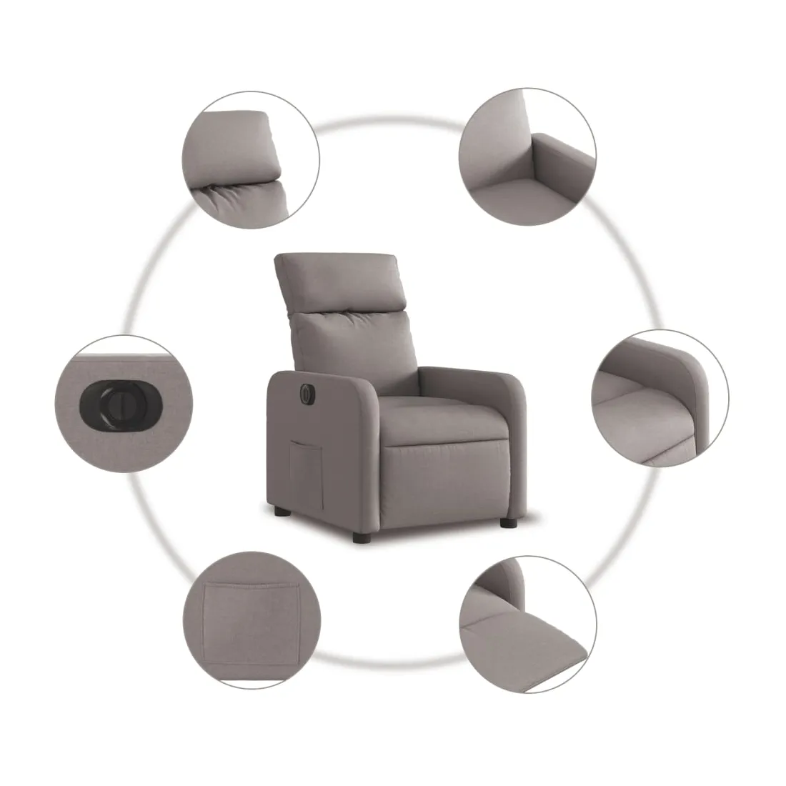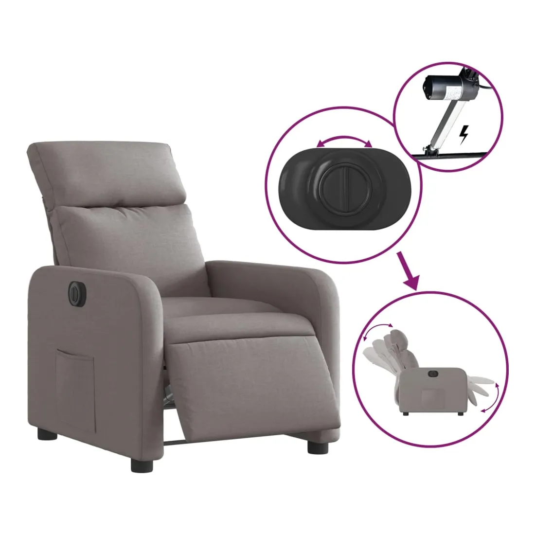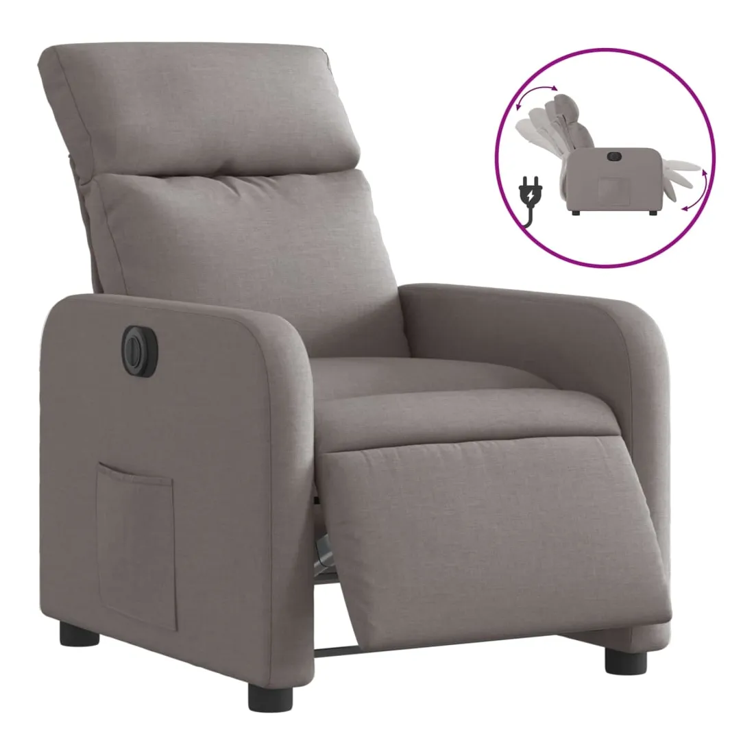 Asseyez-vous et détendez-vous dans ce fauteuil inclinable électrique très confortable ! Fonction d'inclinaison électrique : ce fauteuil inclinable est équipé d'un moteur électrique qui permet de régler automatiquement le repose-pied et le dossier dans n'importe quelle position, selon votre confort, en appuyant simplement sur le bouton situé sur le côté du fauteuil. Cette fonction permet une inclinaison maximale de 135 degrés. En outre, le dossier peut revenir automatiquement à sa position d'origine par une simple pression sur le bouton.Expérience d'assise confortable : le siège, le dossier et les larges accoudoirs bien rembourrés recouverts de tissu procurent une sensation confortable et chaleureuse, vous permettant de vous sentir enveloppé lorsque vous êtes assis. Le tissu présente un aspect simple et épuré et est respirant et durable.Poche latérale pratique : ce fauteuil est doté d'une poche latérale pour vous permettre de garder vos objets essentiels à portée de main.Cadre solide et stable : le cadre en bois et en métal offre une structure solide et une grande stabilité. Ce fauteuil inclinable est confortable et durable.