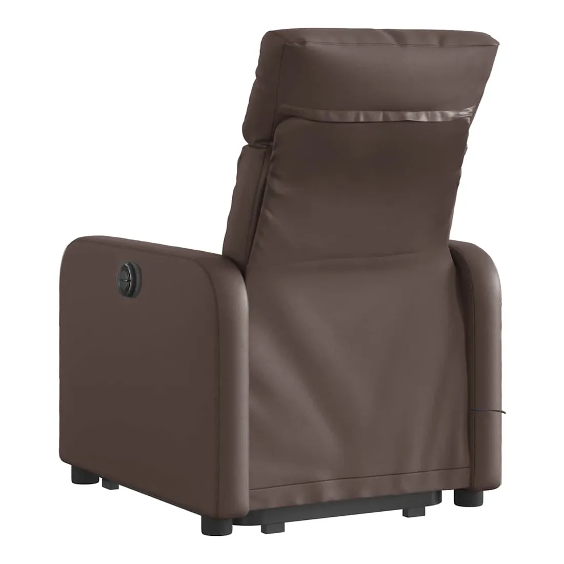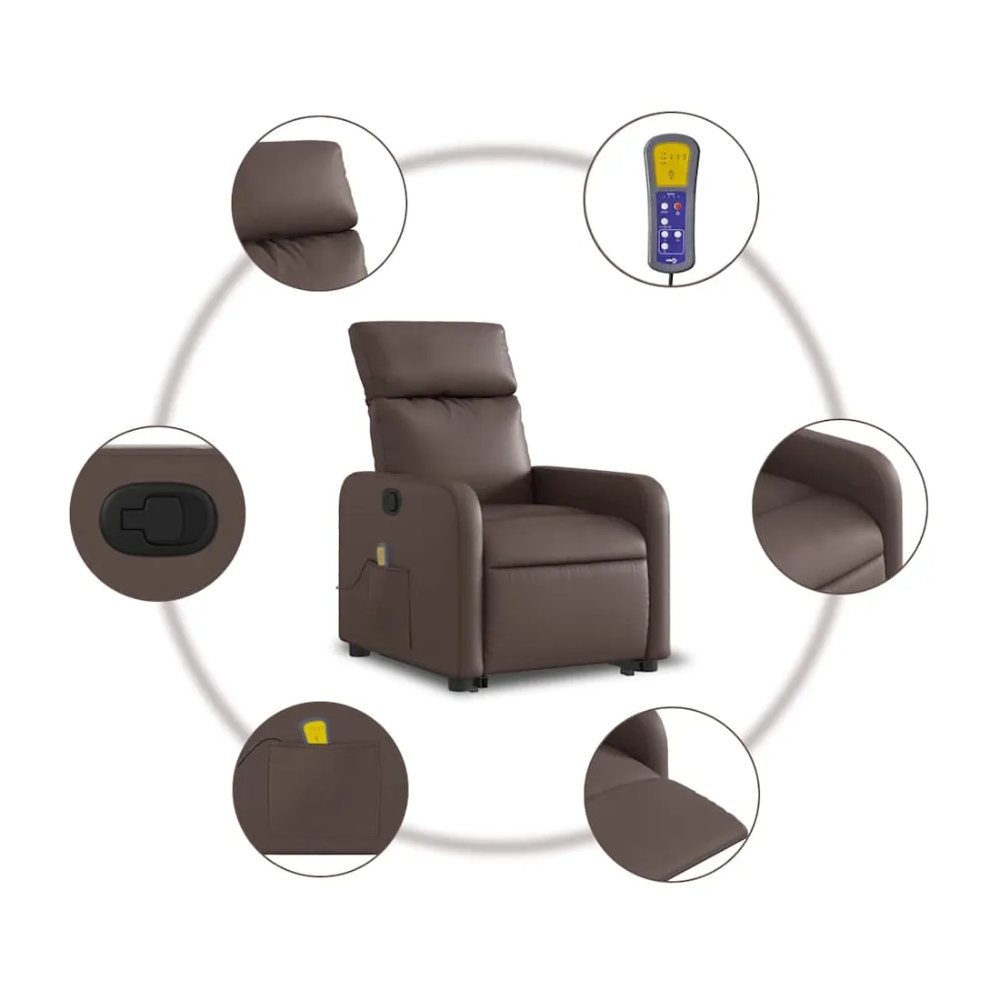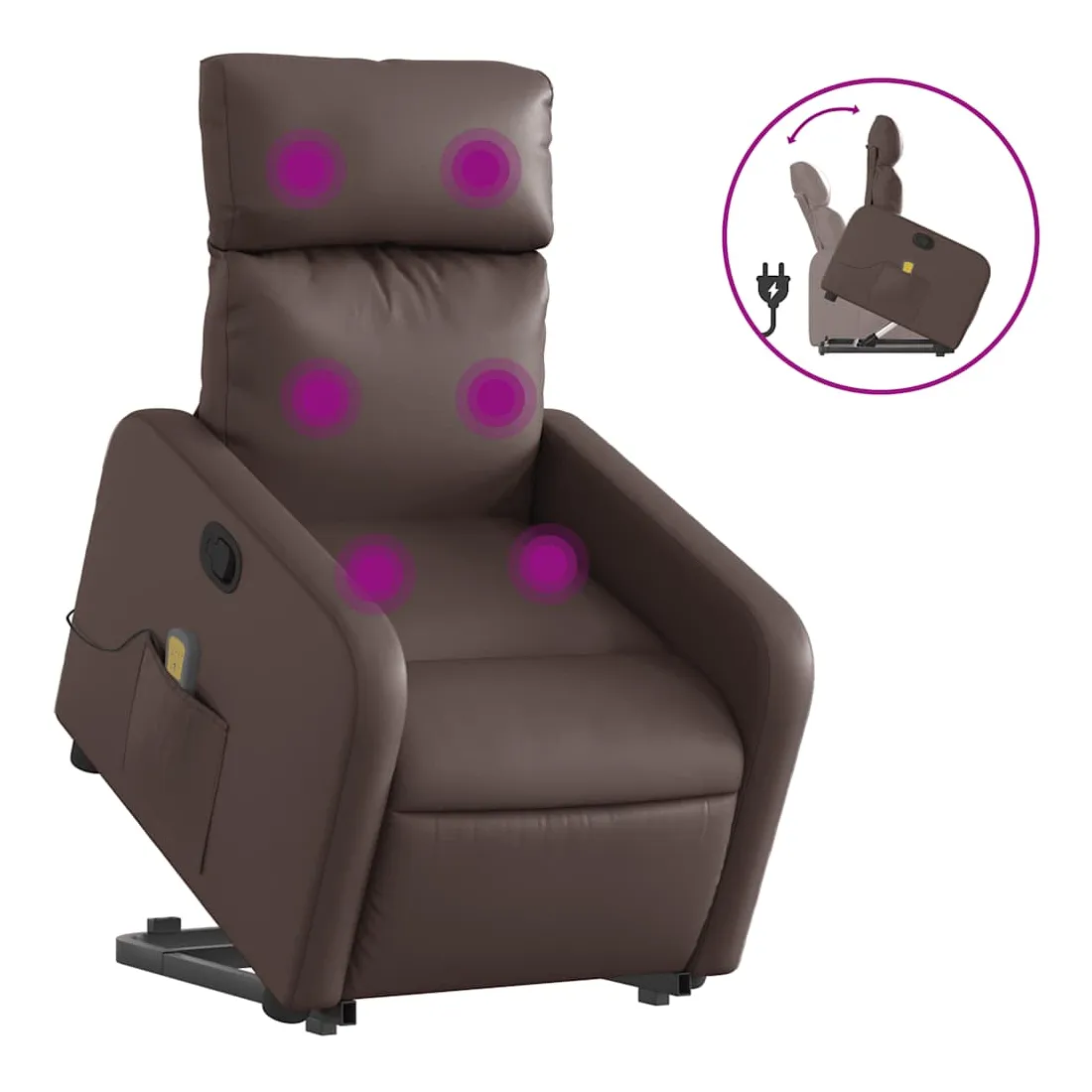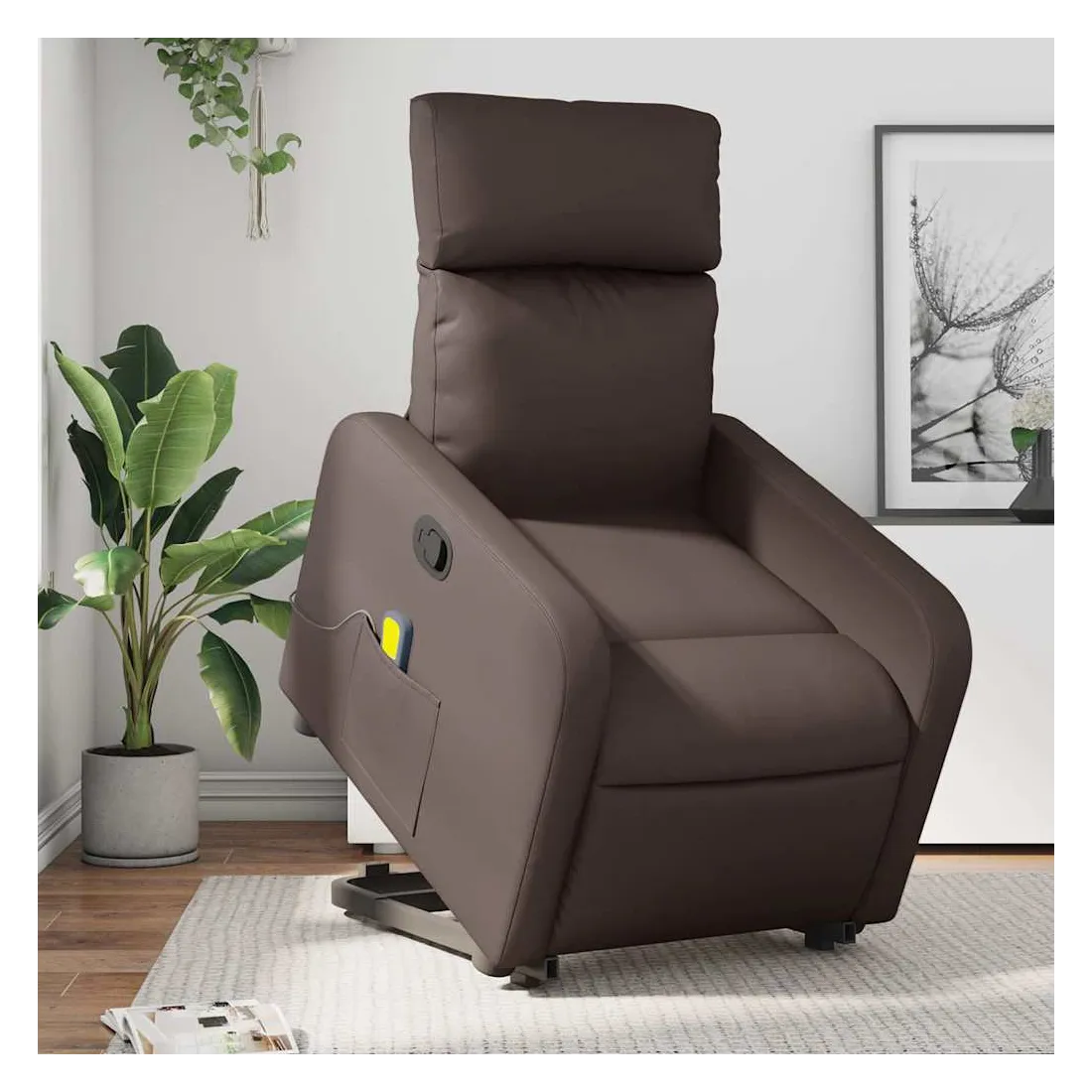 Asseyez-vous et détendez-vous dans ce fauteuil inclinable de massage très confortable ! Fonction de levage électrique : ce fauteuil inclinable pour personnes âgées est équipé d'un moteur électrique pour la fonction de levage. Grâce à la fonction qui pousse toute la chaise vers le haut, vous pouvez facilement vous tenir debout sans stresser votre dos et vos genoux en appuyant simplement sur le bouton.Fonction d'inclinaison manuelle : ce fauteuil inclinable est doté d'une poignée du côté droit. Vous pouvez régler manuellement le repose-pieds et le dossier dans n'importe quelle position selon votre confort en tirant simplement sur la poignée. Cette fonction permet une inclinaison maximale de 135 degrés. De plus, le dossier peut revenir rapidement à sa position d'origine en tirant simplement sur la poignée.Fonction de vibration : les 6 points de massage vous permettent de faire l'expérience d'un massage mieux ciblé. De plus, la télécommande incluse vous permet de choisir différents programmes de massage. La fonction de massage est alimentée par le connecteur USB qui nécessite une source d'alimentation USB certifiée de 5 V (non fournie).Expérience de siège confortable : le siège, le dossier et les larges accoudoirs rembourrés épais recouverts de similicuir procurent une sensation confortable, vous faisant vous sentir enlacé lorsque vous êtes assis. Le similicuir est un matériau très résistant. Il est résistant aux taches, ce qui le rend facile à nettoyer avec un chiffon humide. La surface lisse donne également un aspect luxueux et la beauté du cuir véritable.Poche latérale pratique : ce fauteuil est doté d'une poche latérale pour vous permettre de garder vos objets essentiels à portée de main.Cadre solide et stable : le cadre en bois et en métal offre une structure solide et une grande stabilité. Ce fauteuil inclinable est confortable et durable.